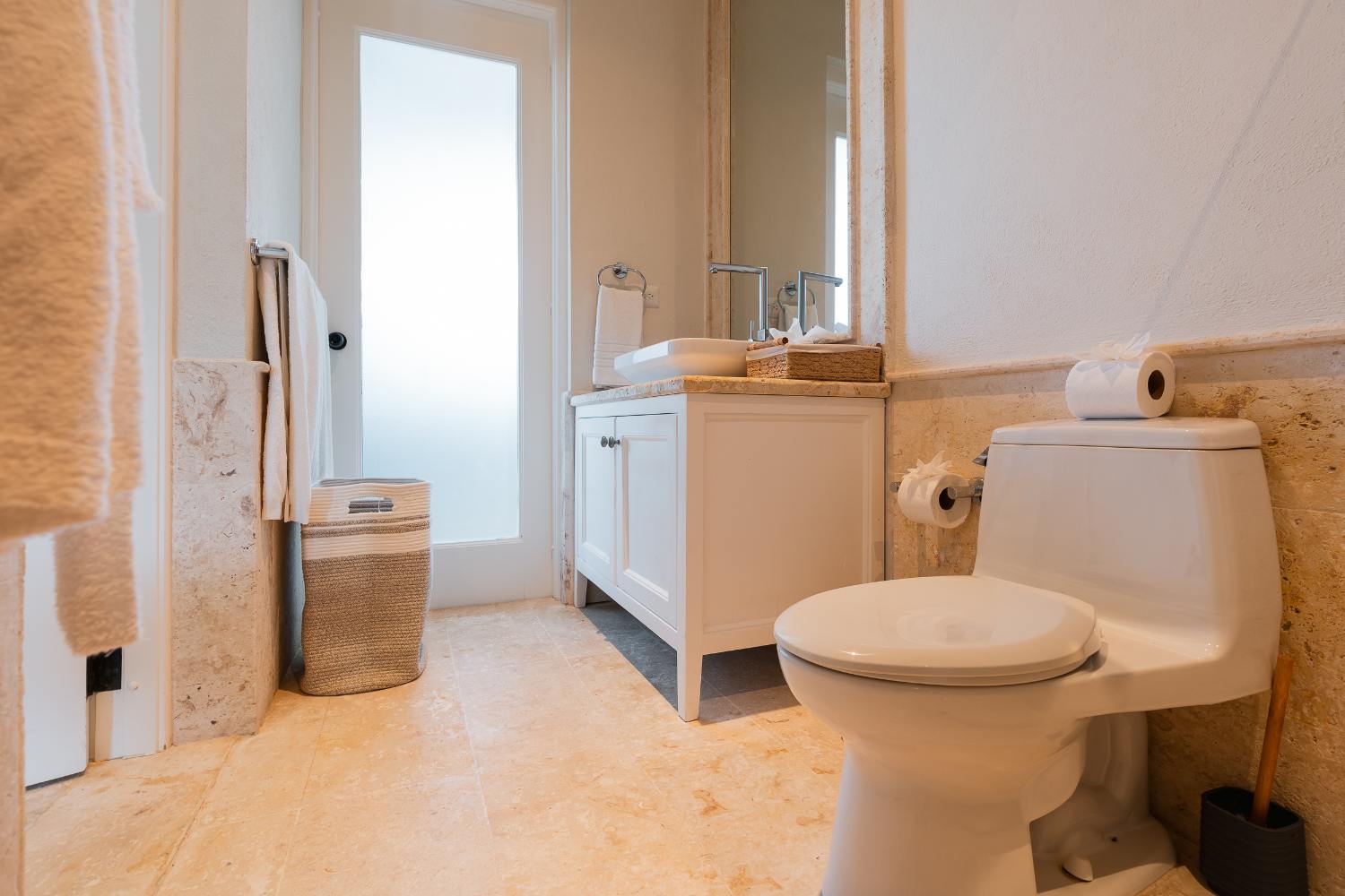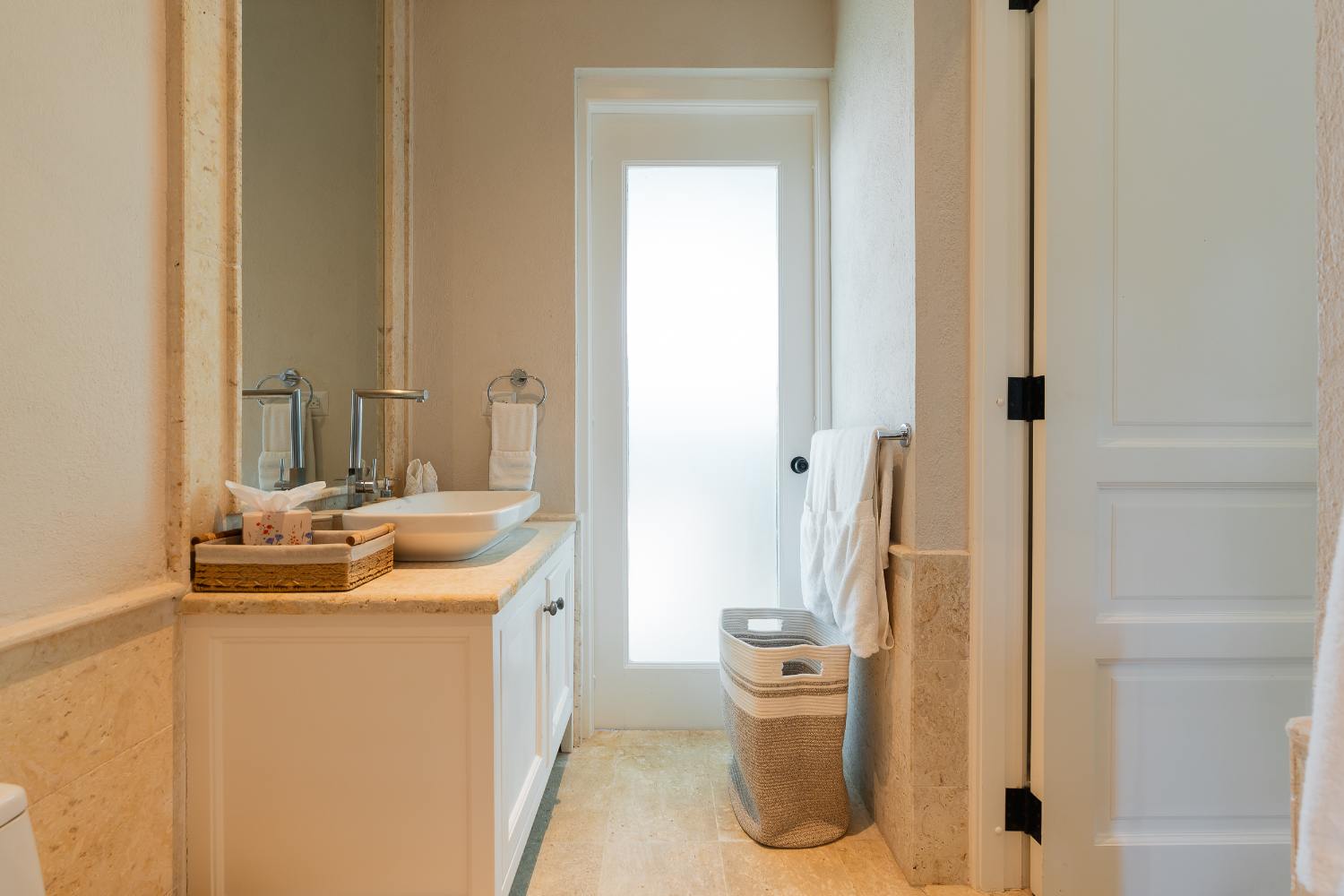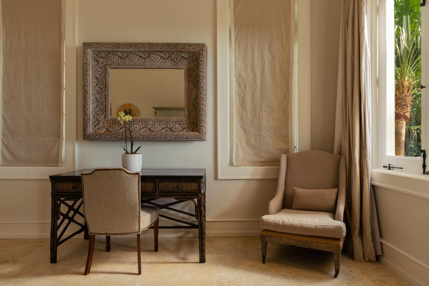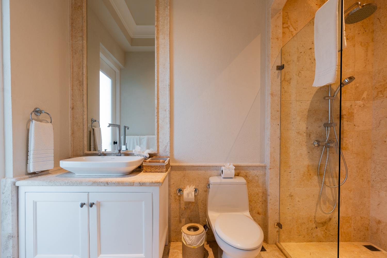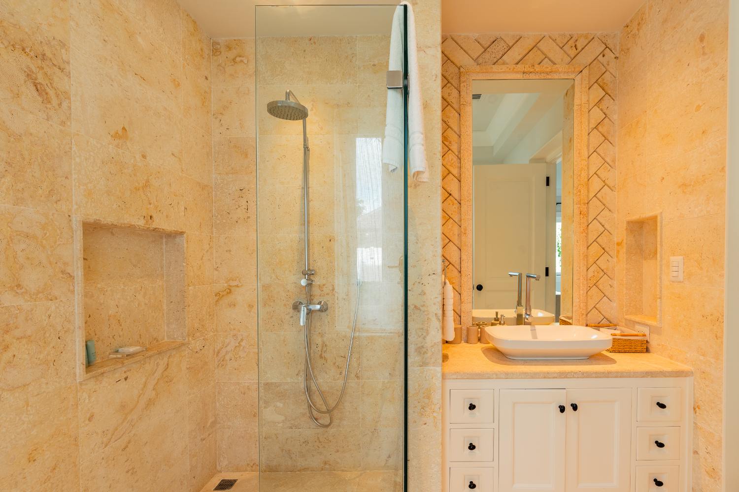 Seven beautifully furnished bedrooms resemble private suites. The main oceanfront suite has a large bathroom and dressing area that allow you to unwind into the evening, and it opens to a private terrace for first-light color and last-light tranquility. With spa-bright en suite bathrooms, ample wardrobes, quiet climate control, and cool linens against sun-warmed skin, companion suites—some featuring lounge areas and terrace or garden access—are designed for genuine relaxation. Couples withdraw to their areas of light and breeze, families spread out without interfering with each other’s rhythms, and everyone re-connects where the pool meets the sea.