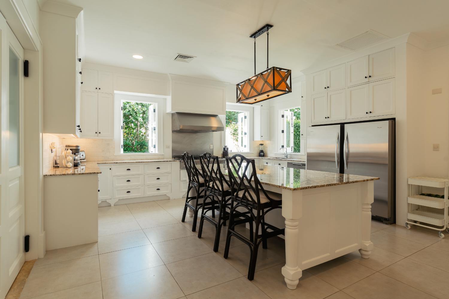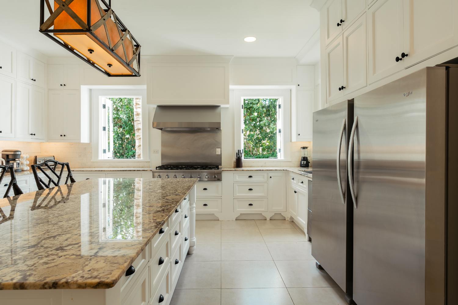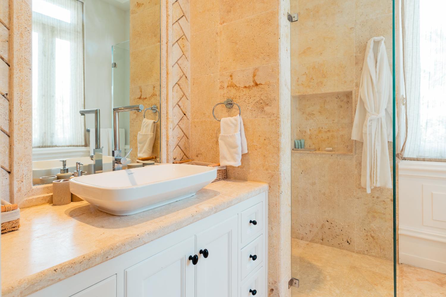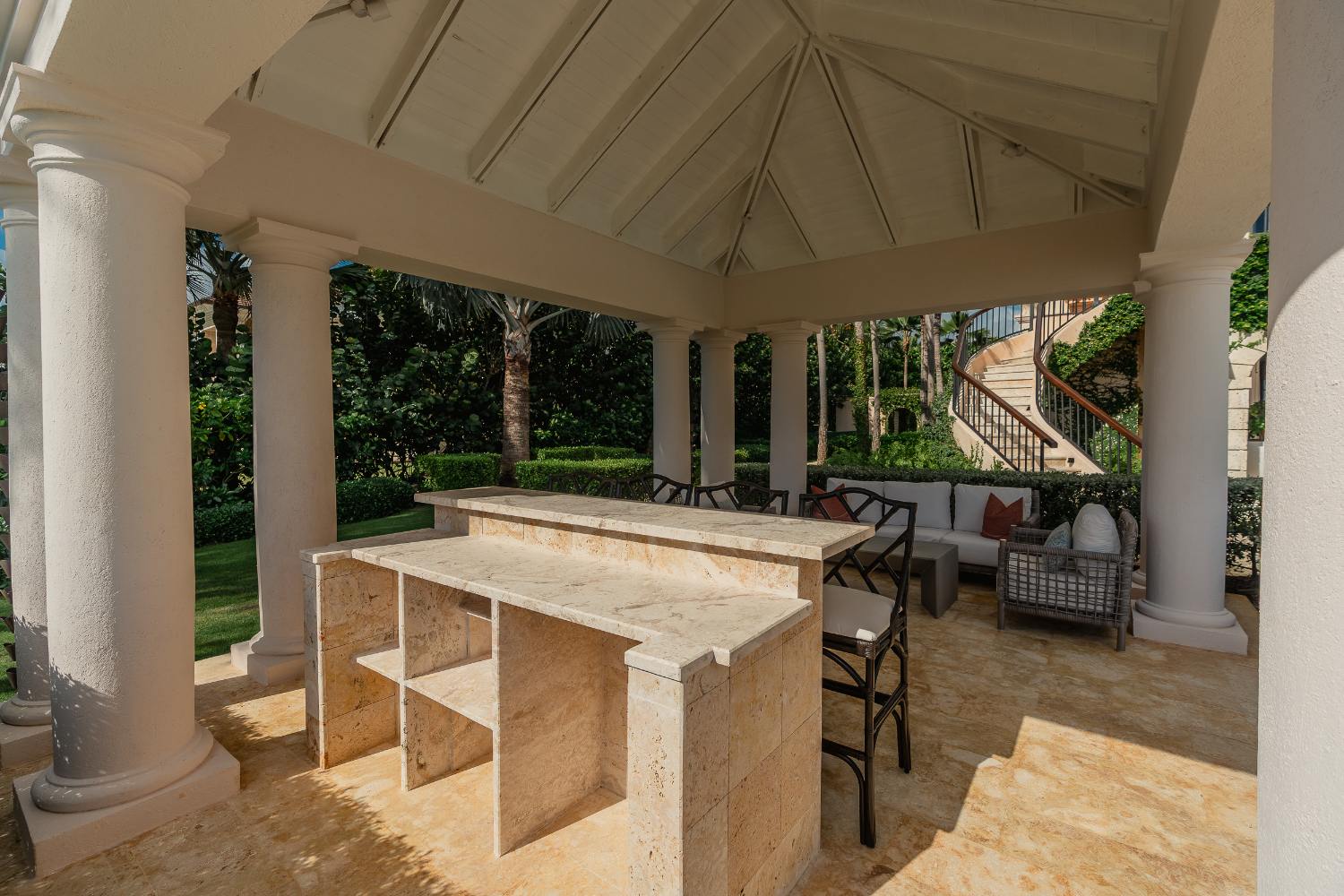 With professional appliances, a logical prep flow, and adequate cold storage for a full house, the kitchen is truly chef-ready. You can invite a private chef for tasting menus or have a casual breakfast at the island while the day’s plans take shape. The infinity-edge pool reflects a cloudless sky when the temperature rises, and the breeze finds you beneath deep overhangs. By golden hour, the upper balcony is the greatest seat in the Dominican Republic, with the Caribbean and the finishing hole below just out of sight.