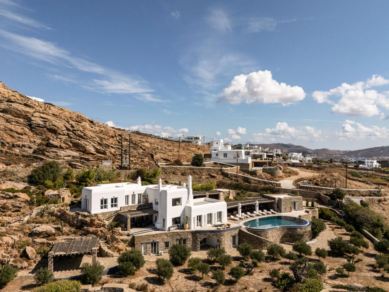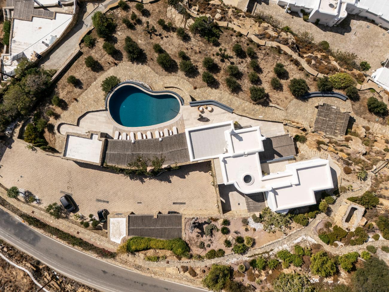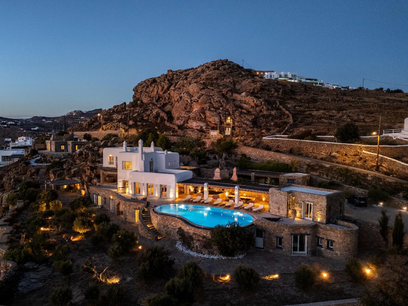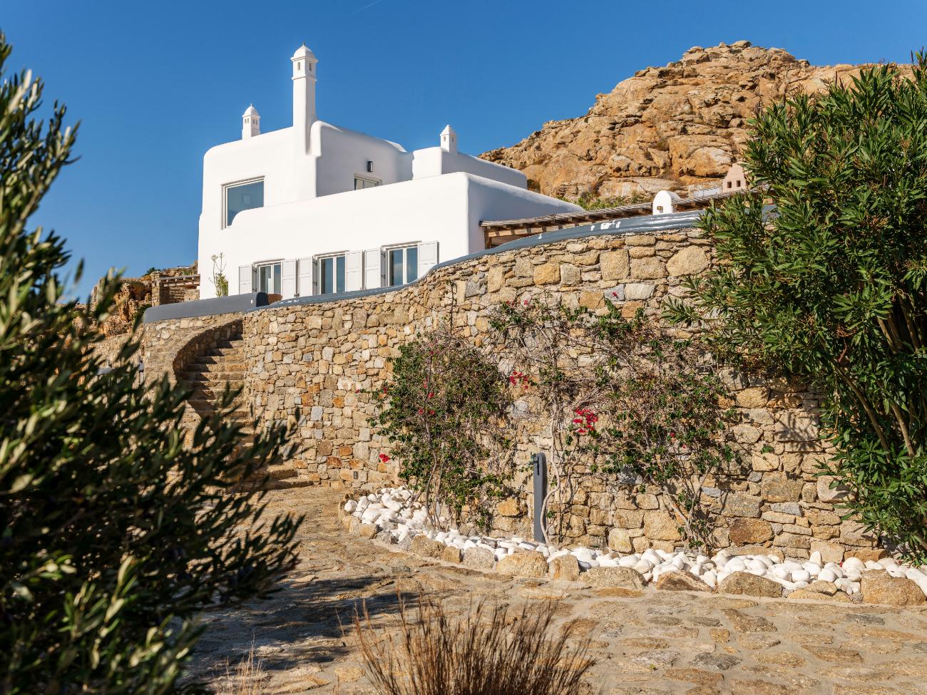 Mykonos Airport (JMK) is normally 15 to 20 minutes away from the property, while Tourlos, the island’s main port, is typically 10 to 15 minutes away by car. A comfortable SUV or a prearranged driver is advised, especially at night or during peak season, as the roads are paved but narrow and frequently steep on the final approach.