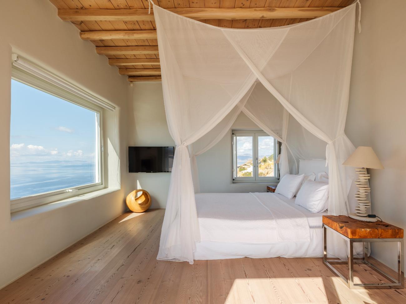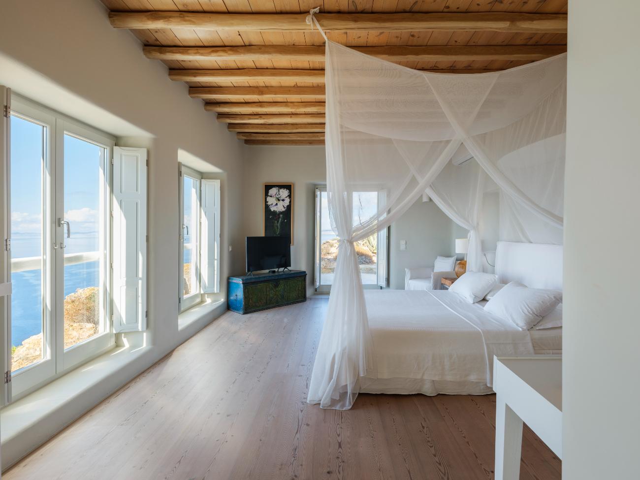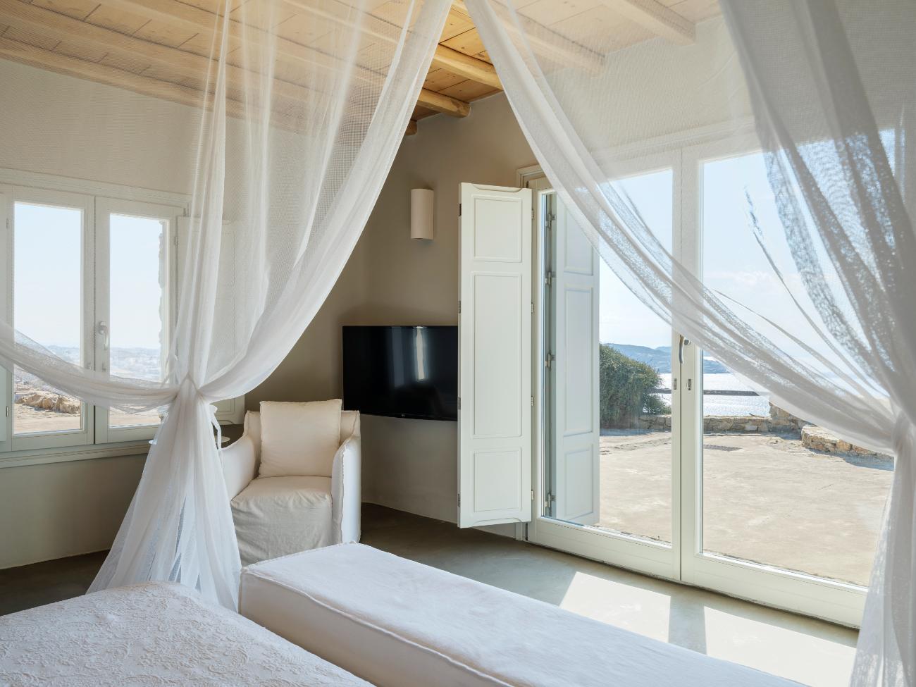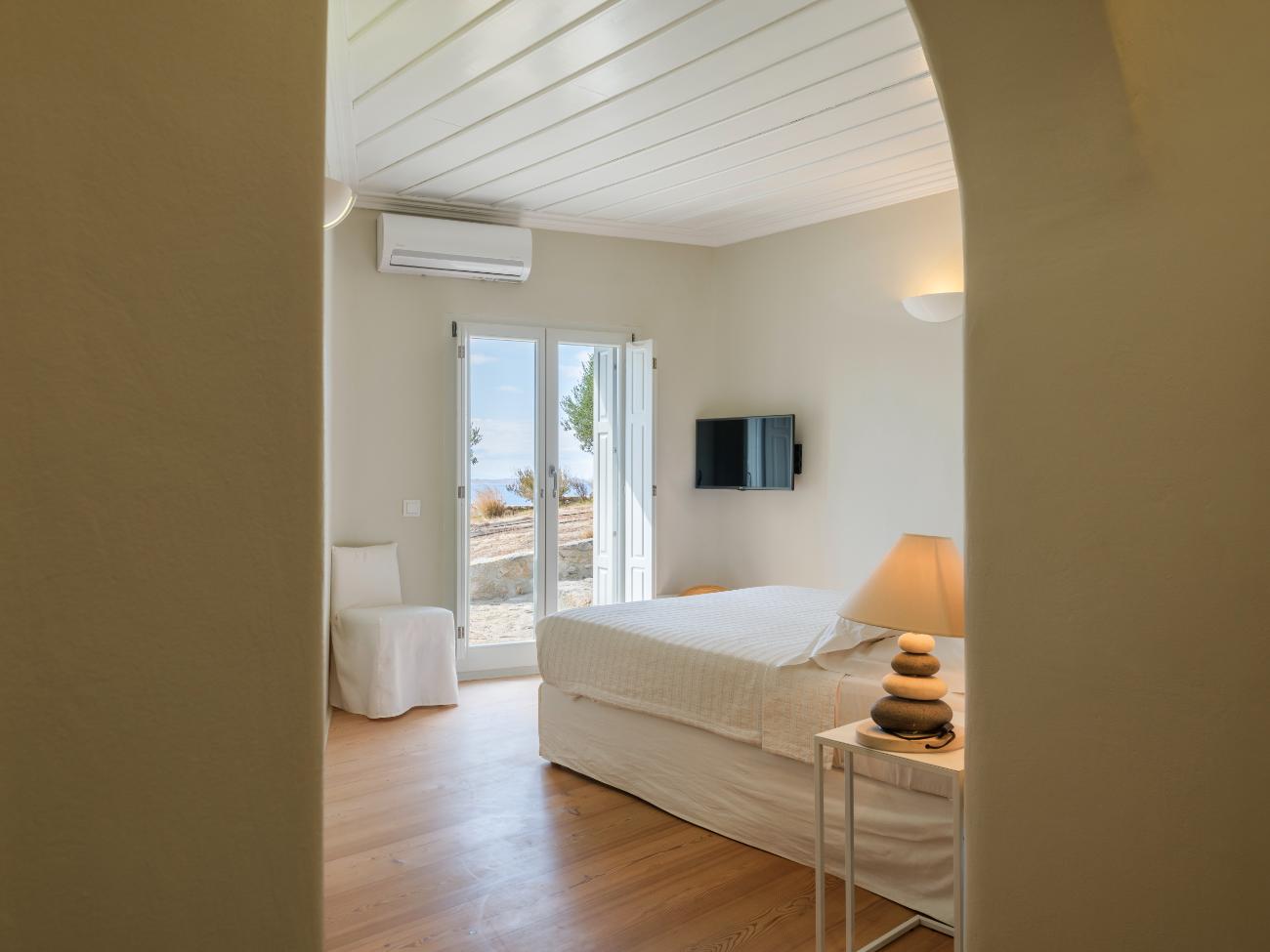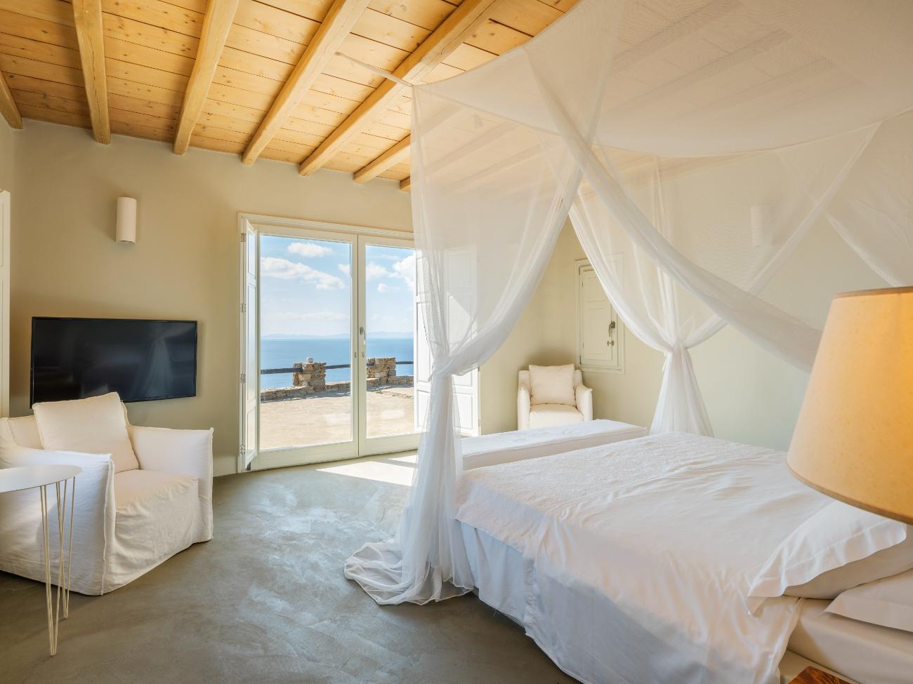 The light is the first thing you notice when you wake up in one of the ten bedrooms. Even before you stand up, you can see the bay’s curve and the whitewashed homes of Chora below thanks to floor-to-ceiling openings. No one has to sacrifice comfort thanks to the main villa’s seven double bedrooms, all of which have views of the sea and private bathrooms.