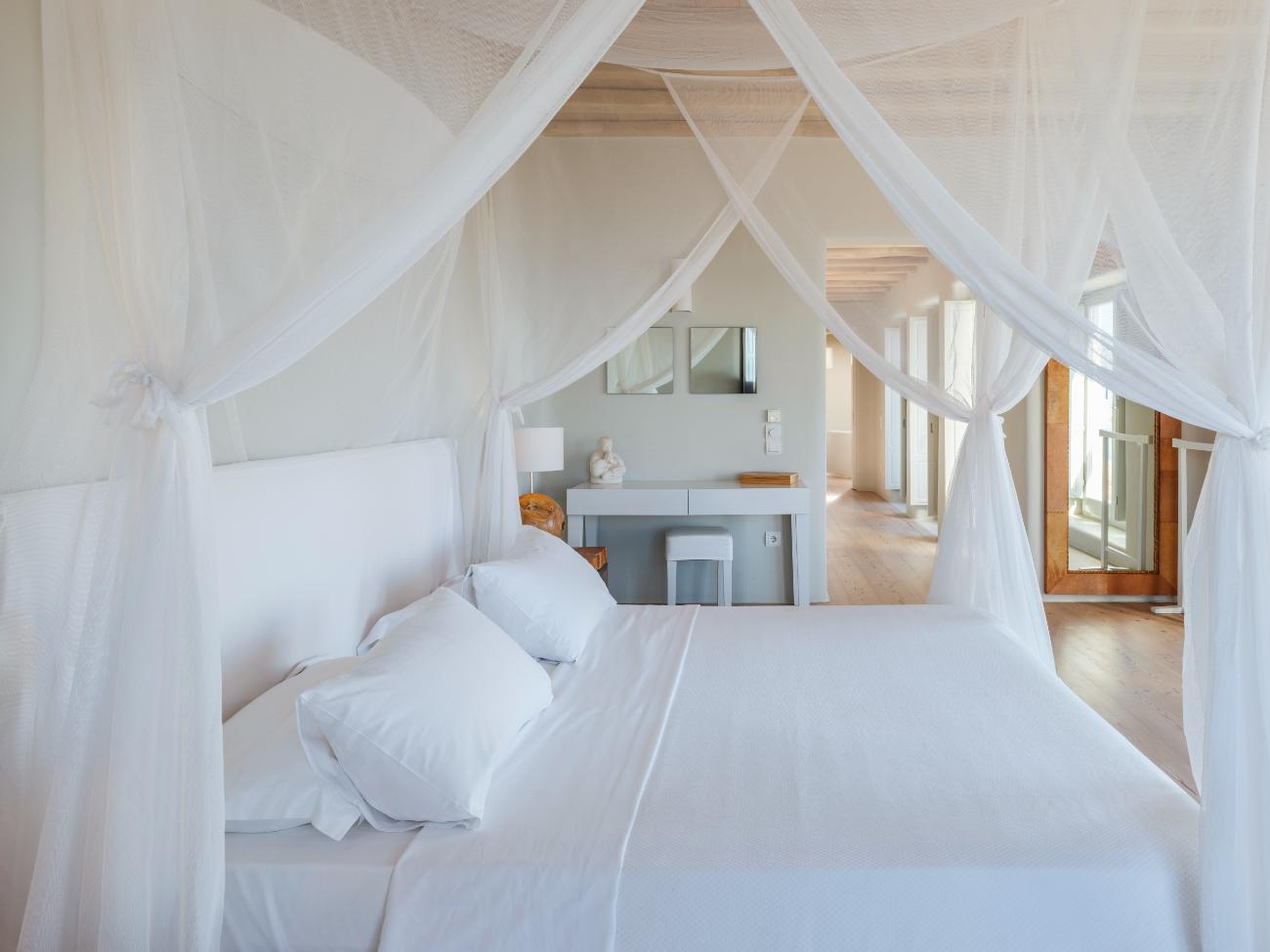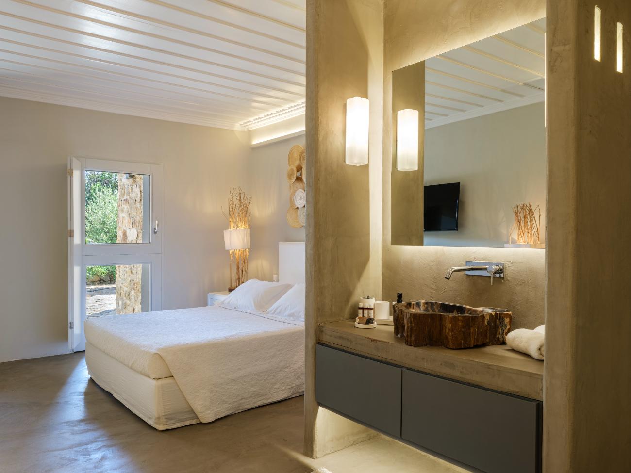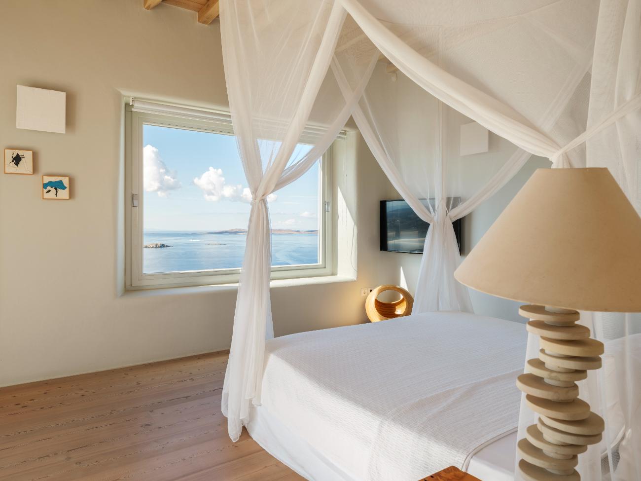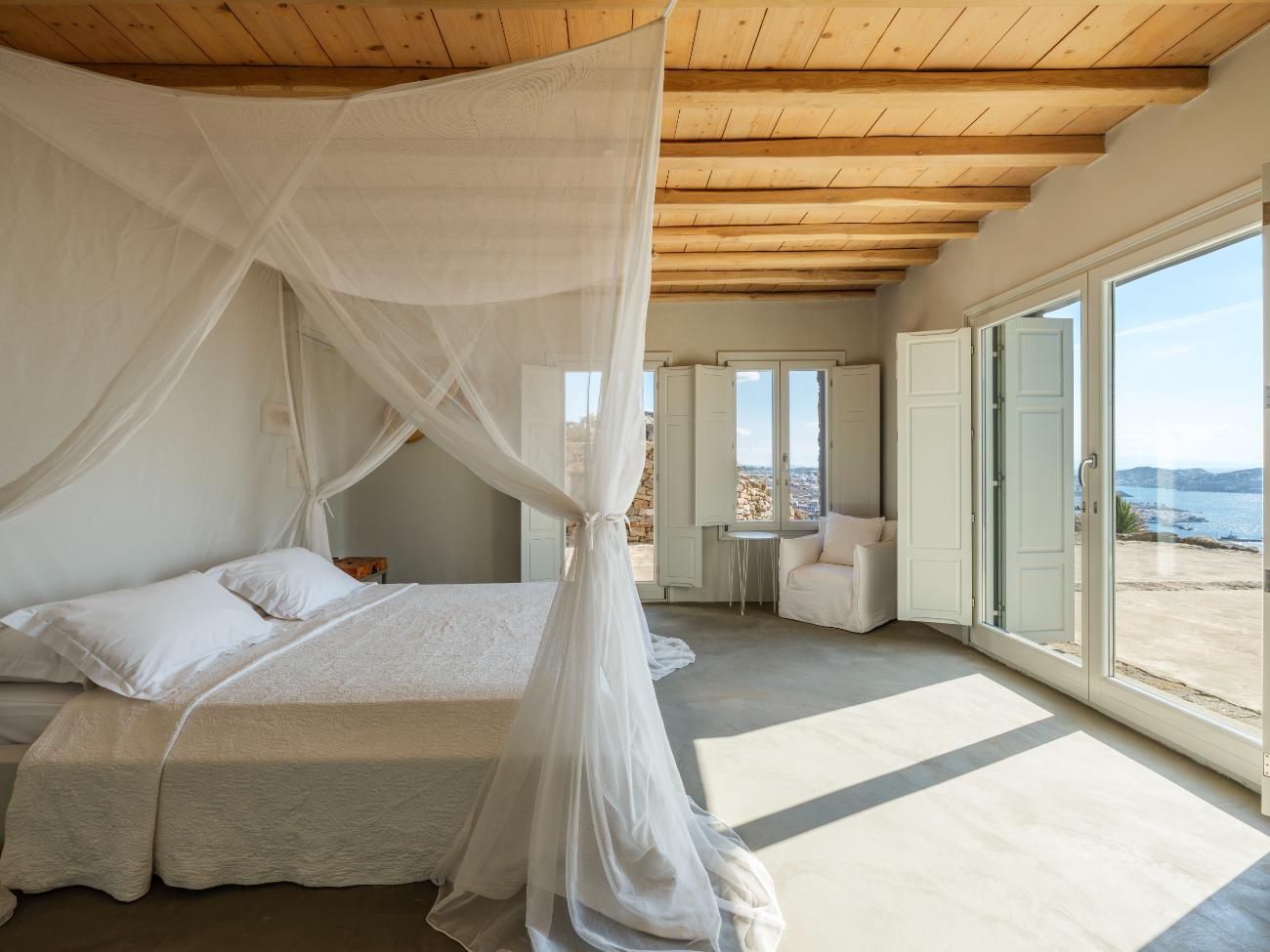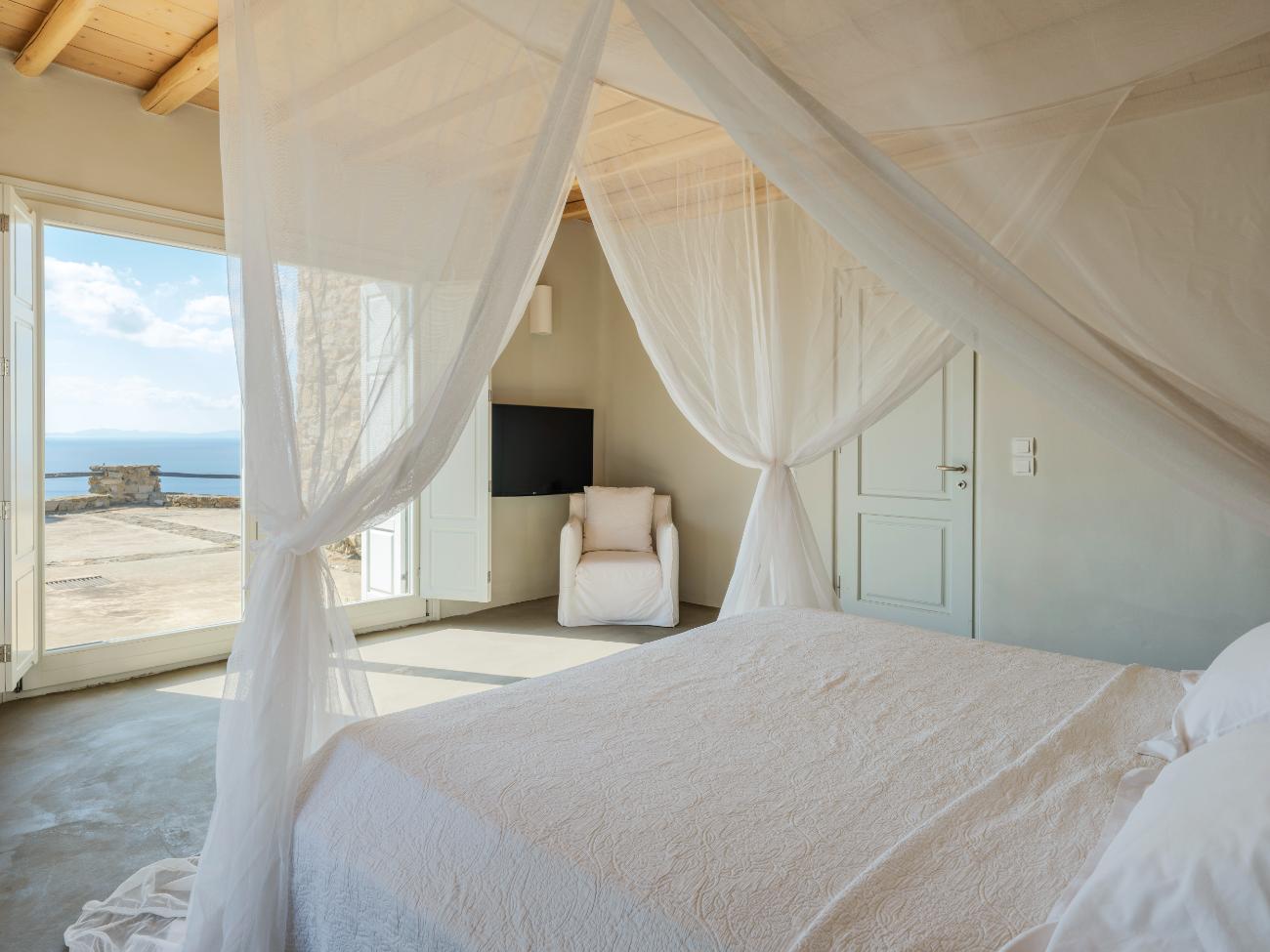 The light is the first thing you notice when you wake up in one of the ten bedrooms. Even before you stand up, you can see the bay’s curve and the whitewashed homes of Chora below thanks to floor-to-ceiling openings. No one has to sacrifice comfort thanks to the main villa’s seven double bedrooms, all of which have views of the sea and private bathrooms.