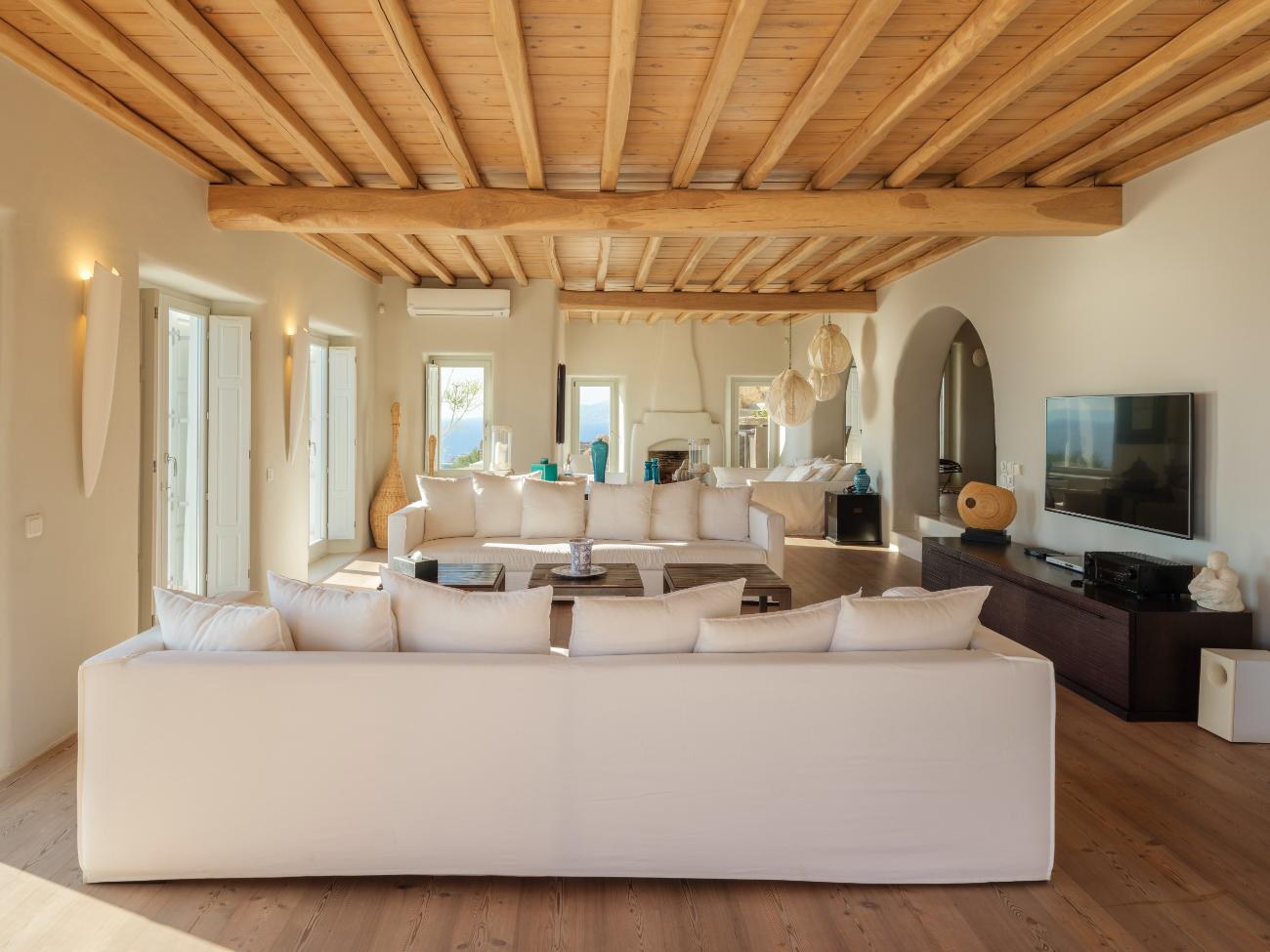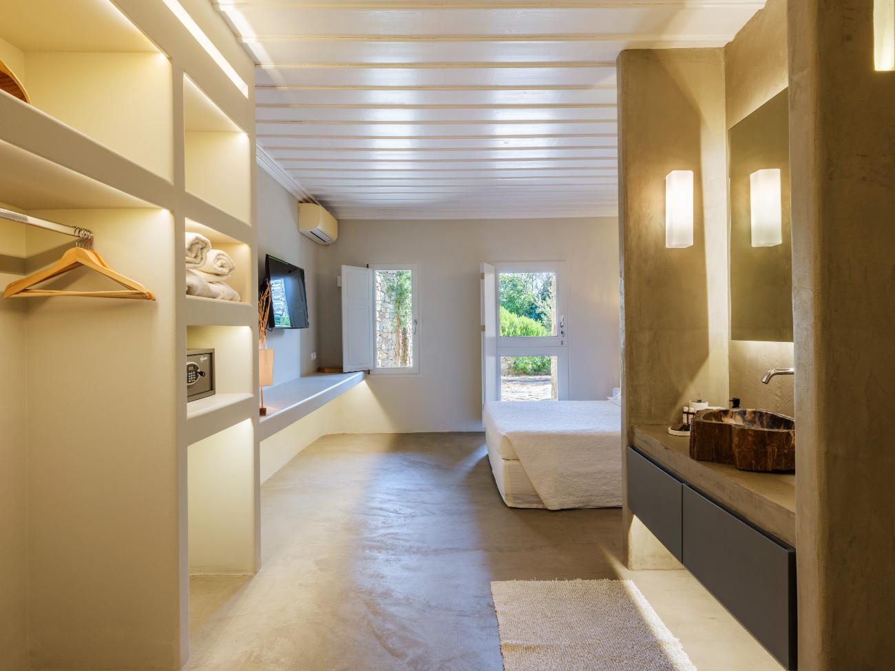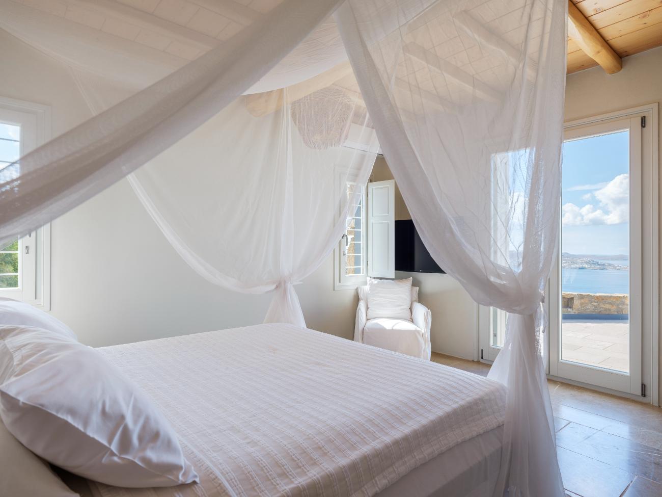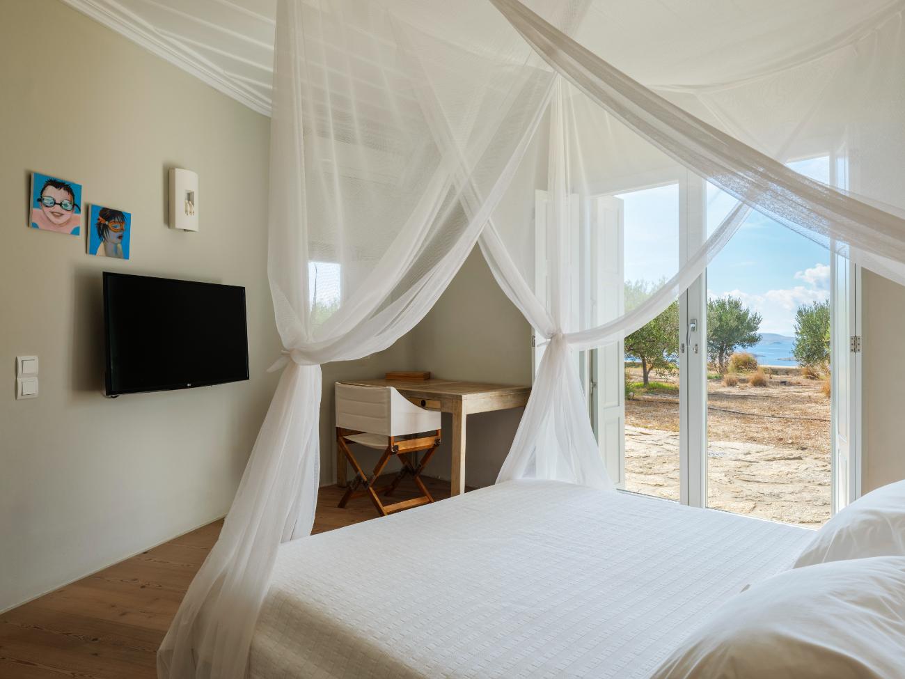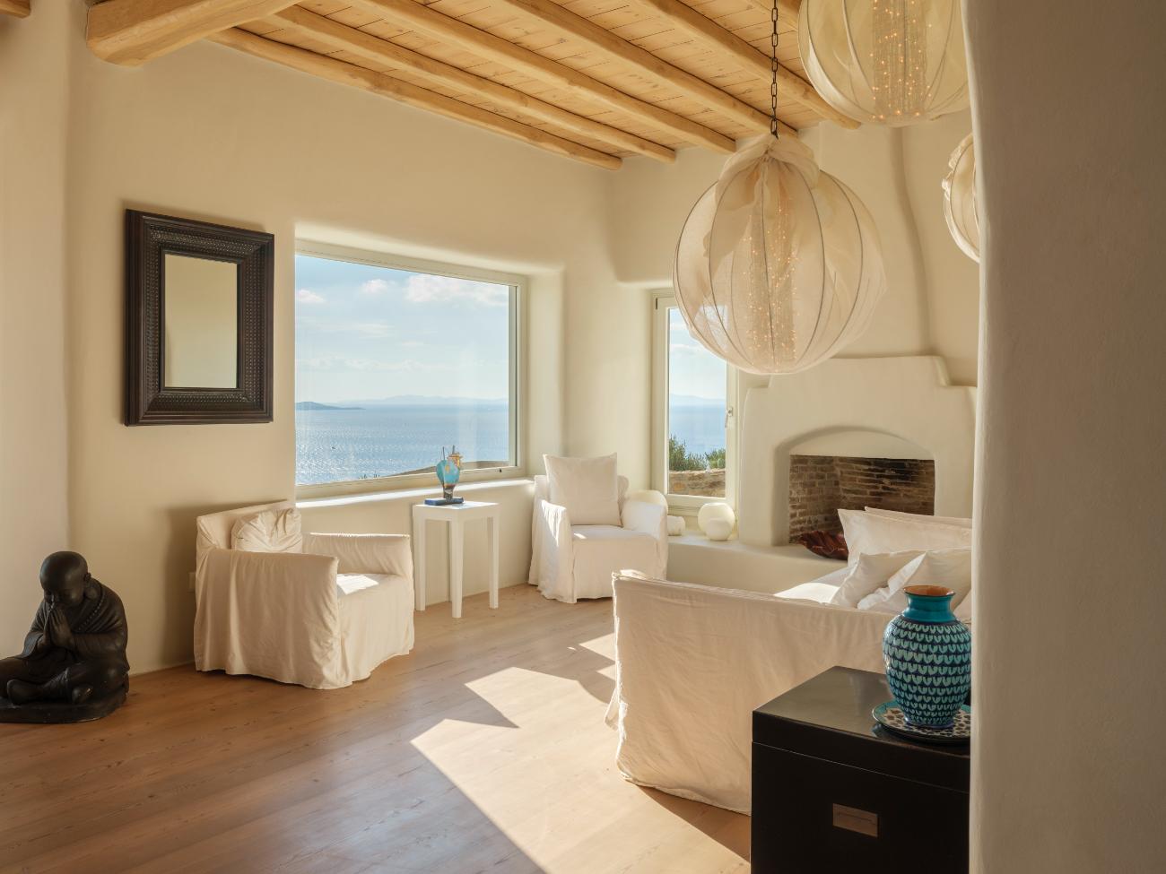 The light is the first thing you notice when you wake up in one of the ten bedrooms. Even before you stand up, you can see the bay’s curve and the whitewashed homes of Chora below thanks to floor-to-ceiling openings. No one has to sacrifice comfort thanks to the main villa’s seven double bedrooms, all of which have views of the sea and private bathrooms.