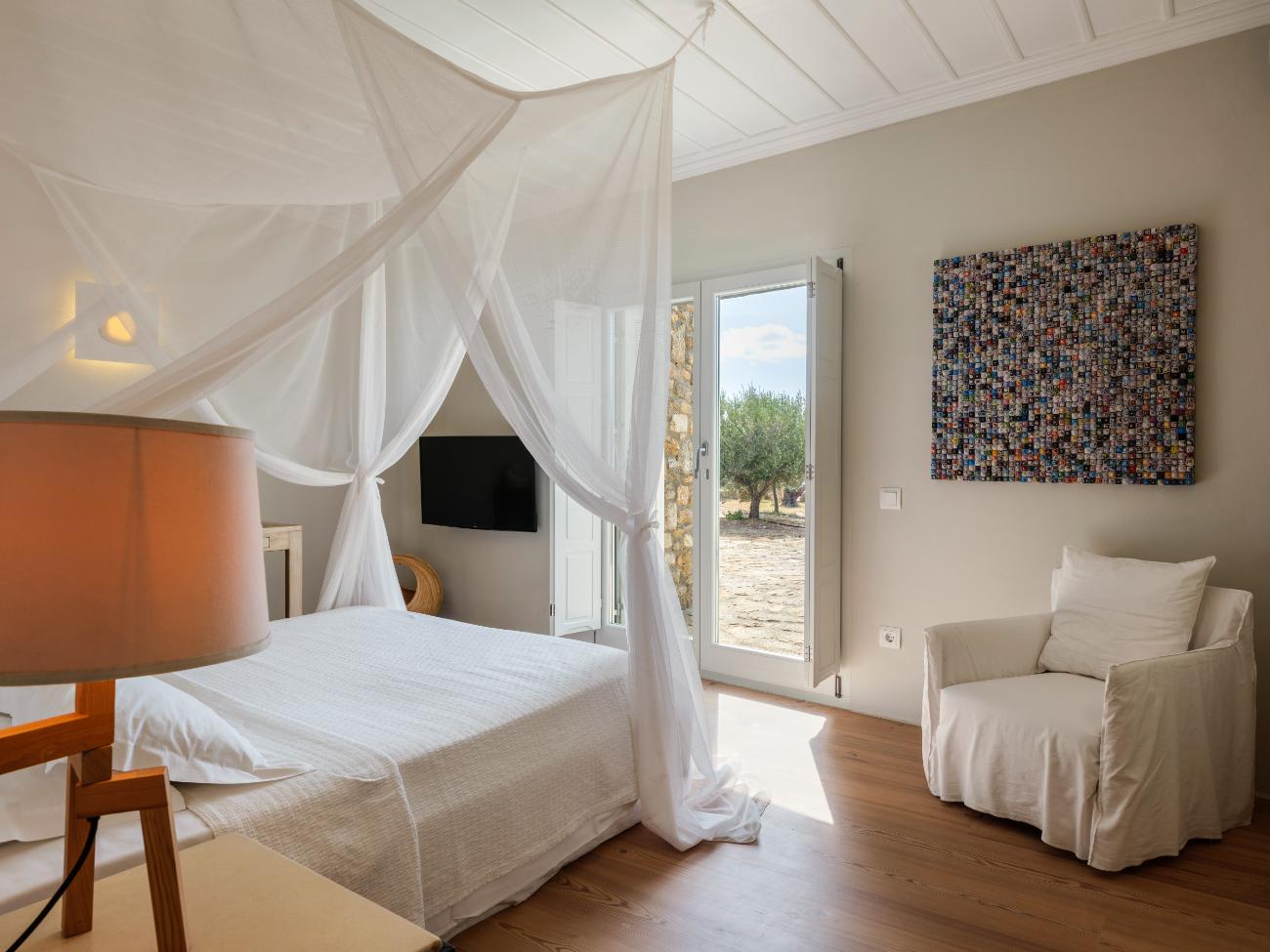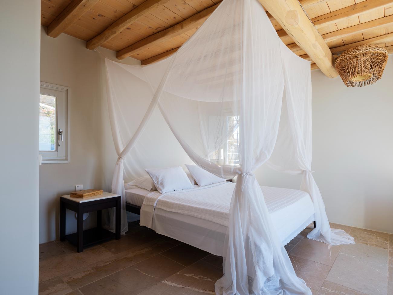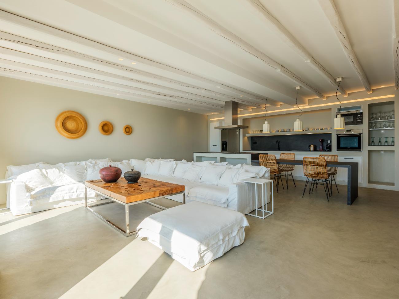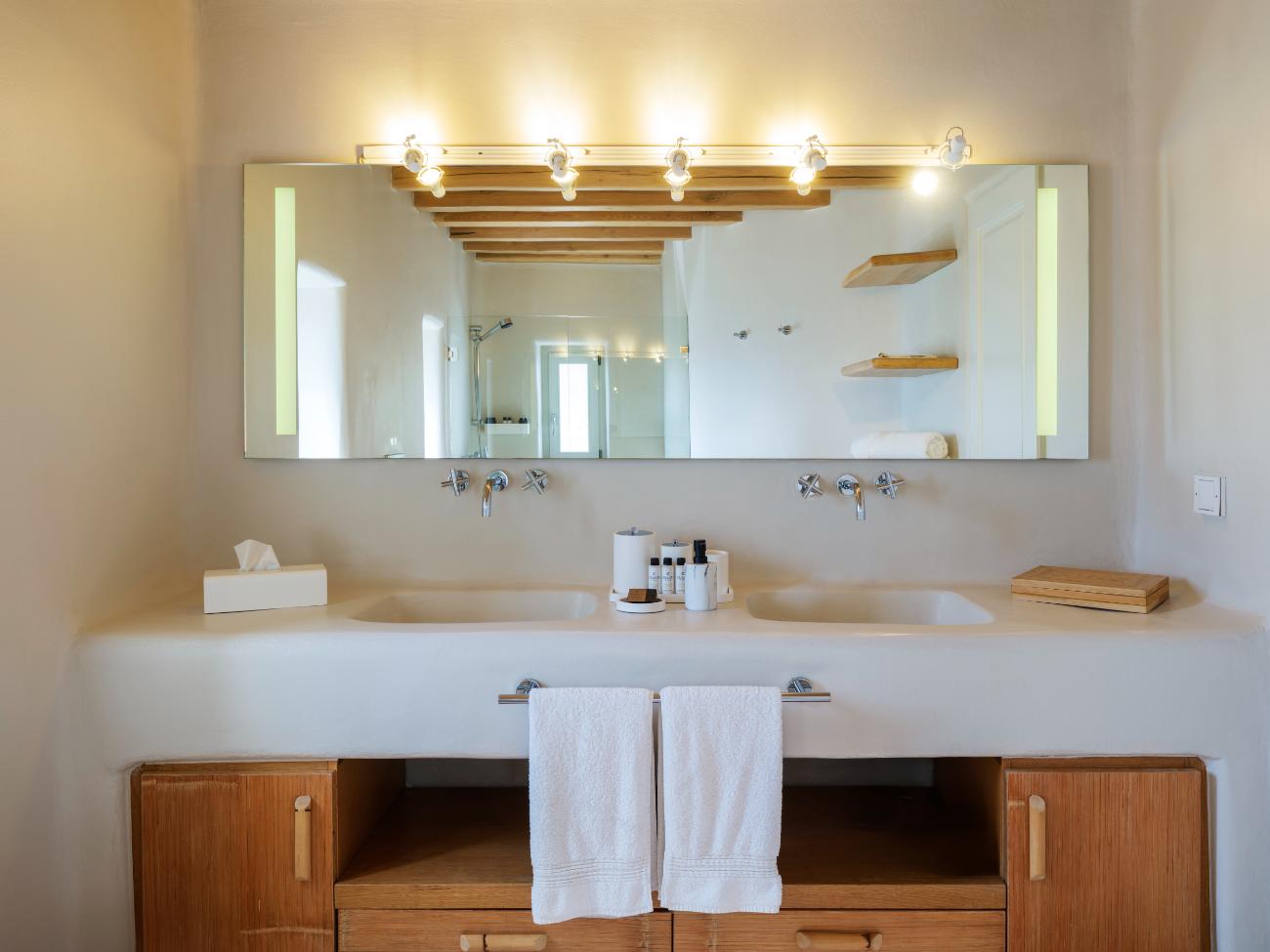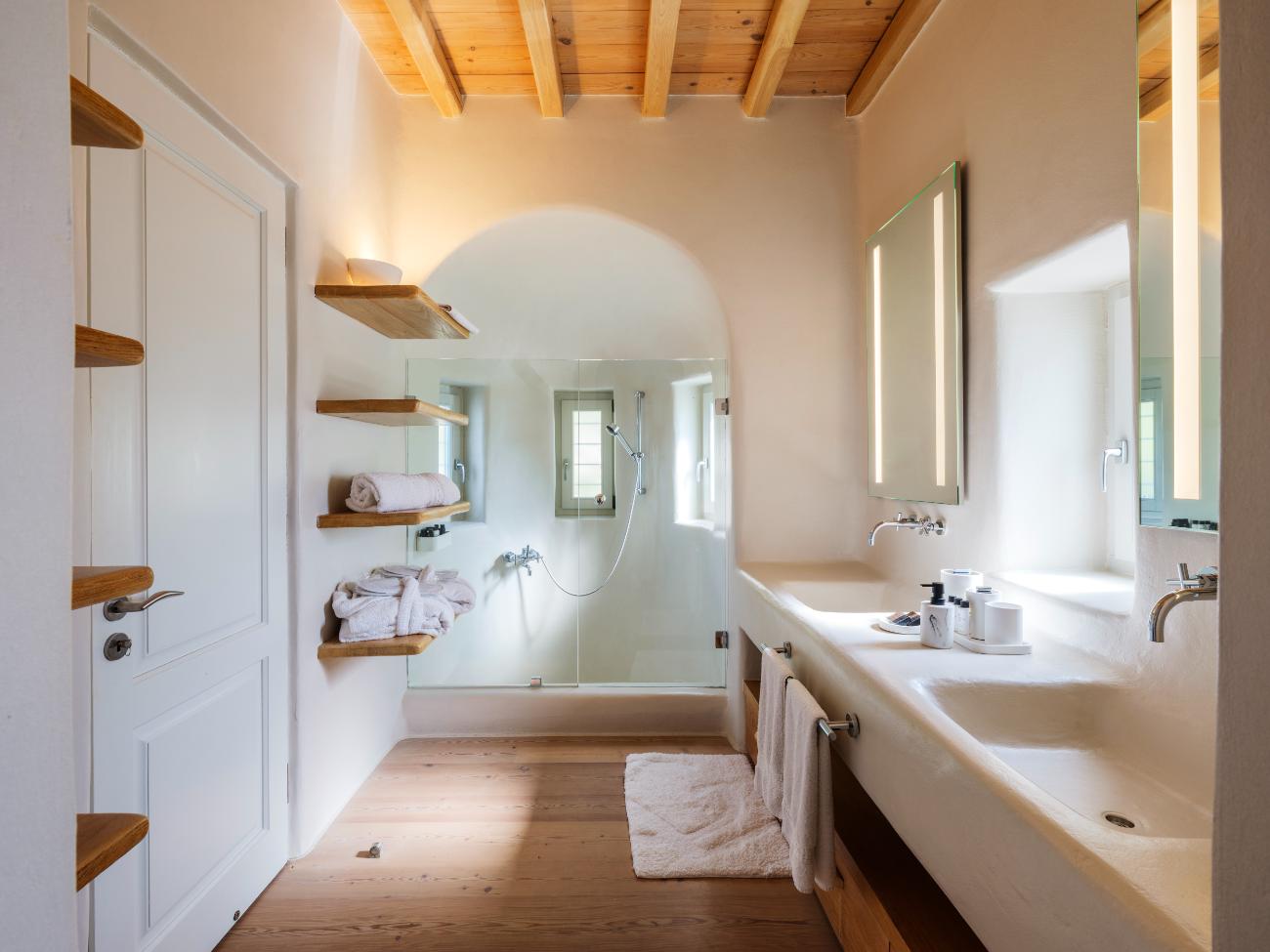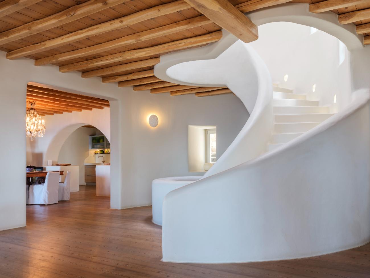 The light is the first thing you notice when you wake up in one of the ten bedrooms. Even before you stand up, you can see the bay’s curve and the whitewashed homes of Chora below thanks to floor-to-ceiling openings. No one has to sacrifice comfort thanks to the main villa’s seven double bedrooms, all of which have views of the sea and private bathrooms.