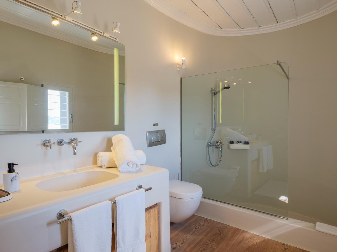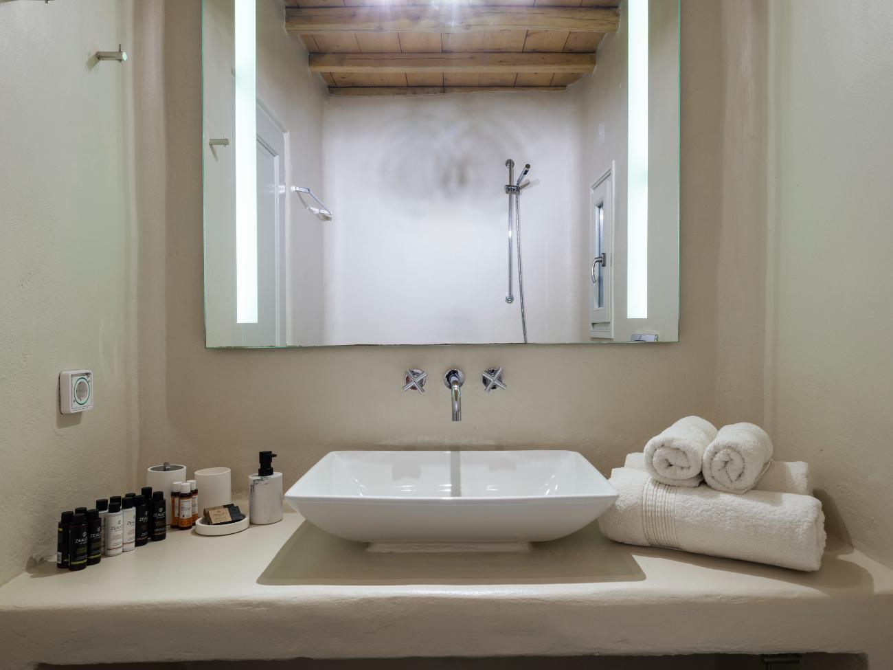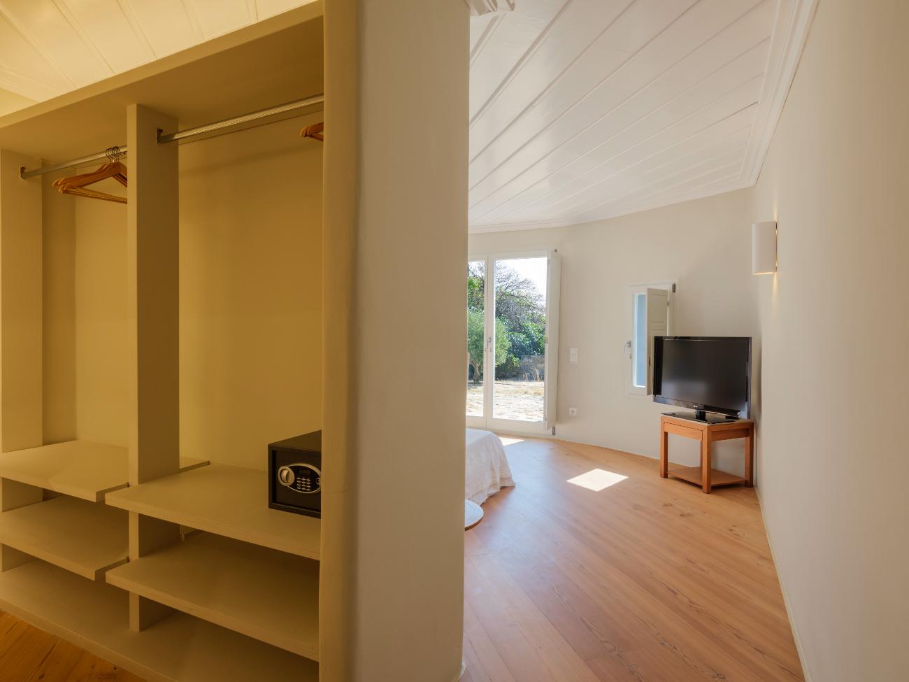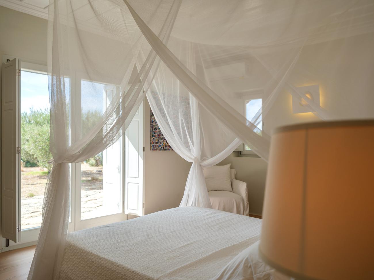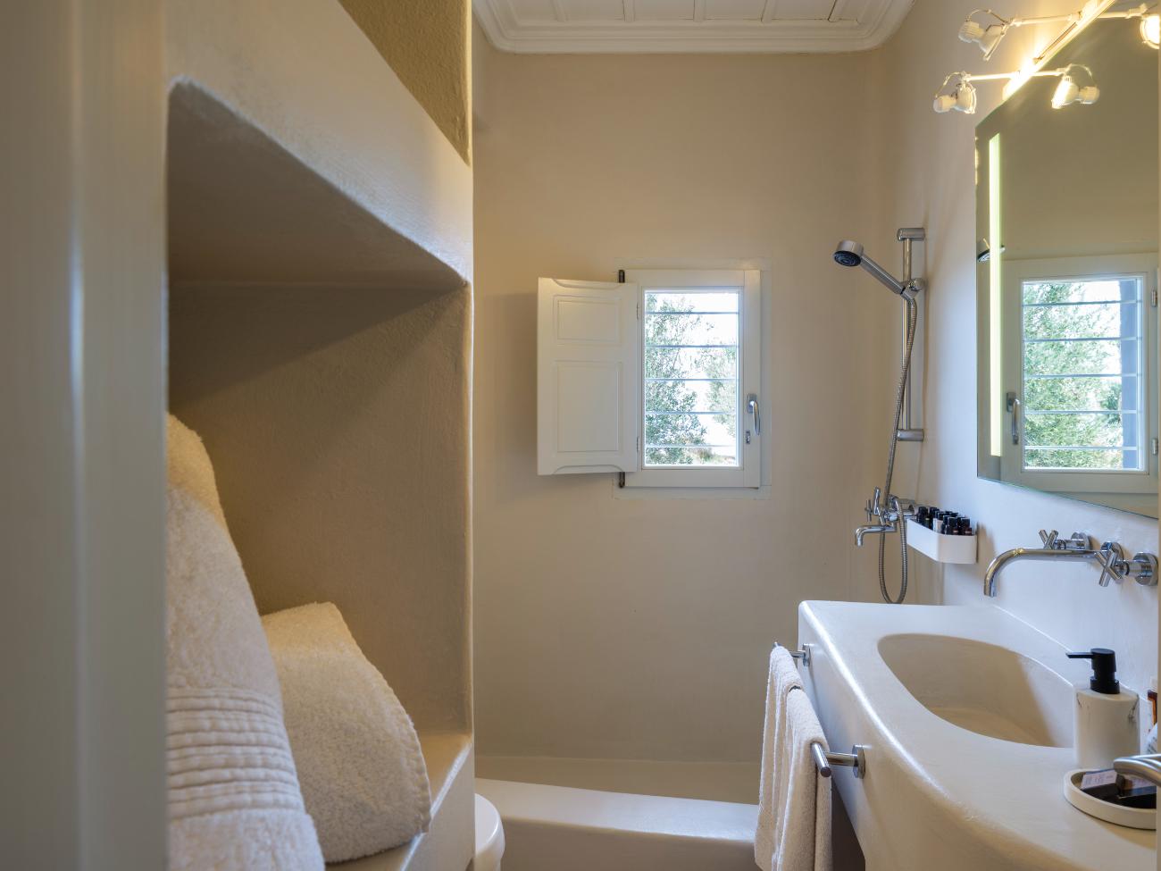 The light is the first thing you notice when you wake up in one of the ten bedrooms. Even before you stand up, you can see the bay’s curve and the whitewashed homes of Chora below thanks to floor-to-ceiling openings. No one has to sacrifice comfort thanks to the main villa’s seven double bedrooms, all of which have views of the sea and private bathrooms.