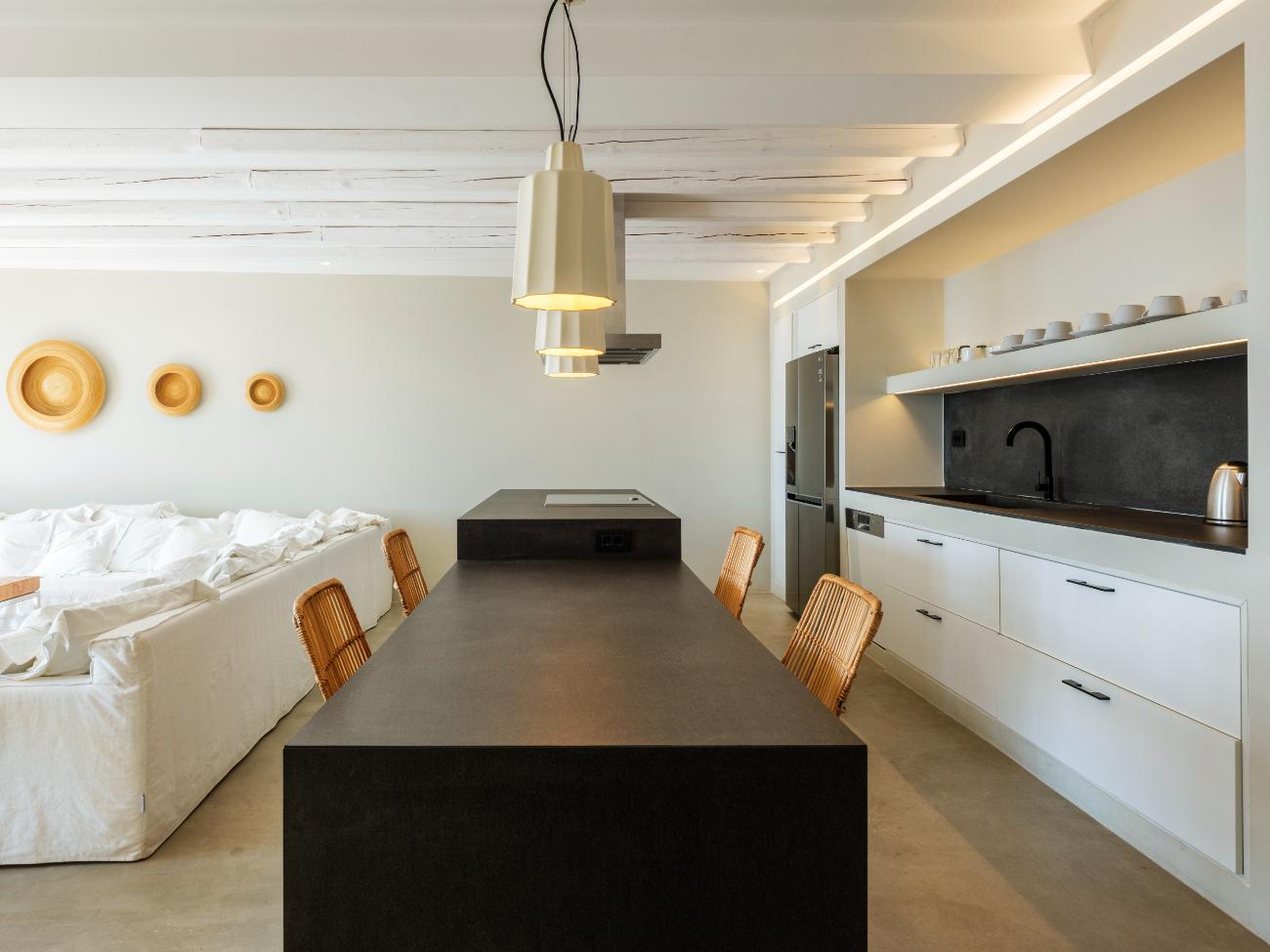 White walls, natural stone, soft textiles, and thoughtfully selected furniture that feels opulent but never stiff are all features of Montessito’s sleek, modern island interior design. Large, cozy couches, long tables for late-night dinners, and a fully furnished kitchen ready for a private chef or a self-assured home cook are all part of the main living areas’ communal design. The home theater creates the ideal dark, cozy space for movie marathons after long days in the sun, and the private gym allows you to work out while taking in the scenery.