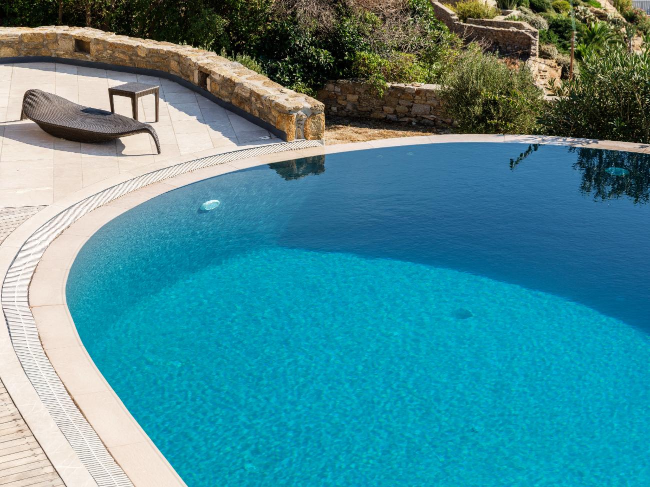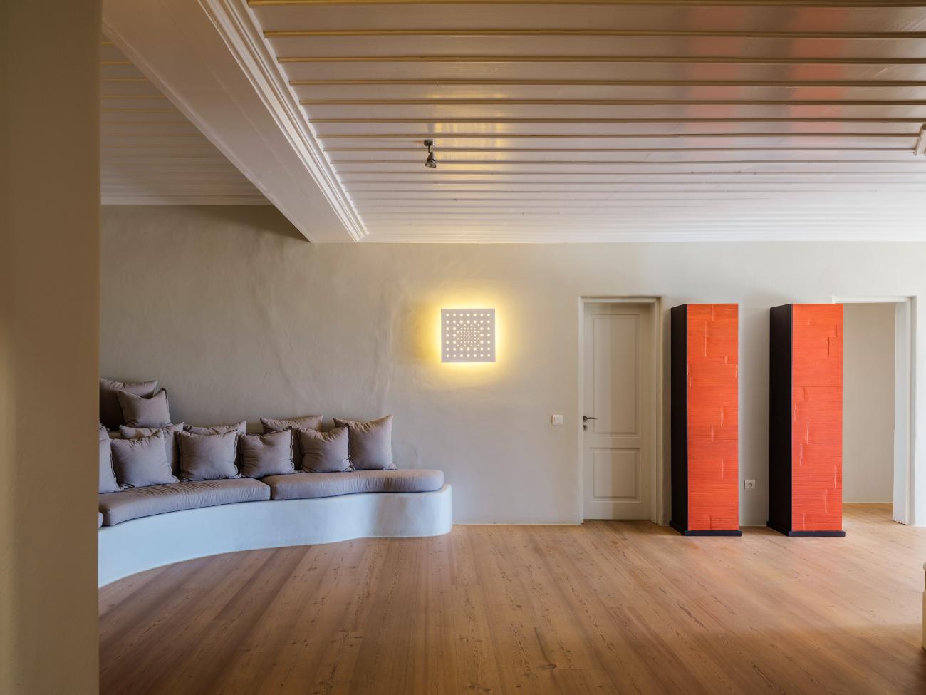 The large pool terrace is the focal point of the house. The property’s front is lined with a massive infinity pool that visually spills into the Aegean’s deep blue. This is where life takes place during the day: children playing by the water’s edge, friends meandering between loungers and shaded couches, background music playing softly while someone mixes drinks at the bar.