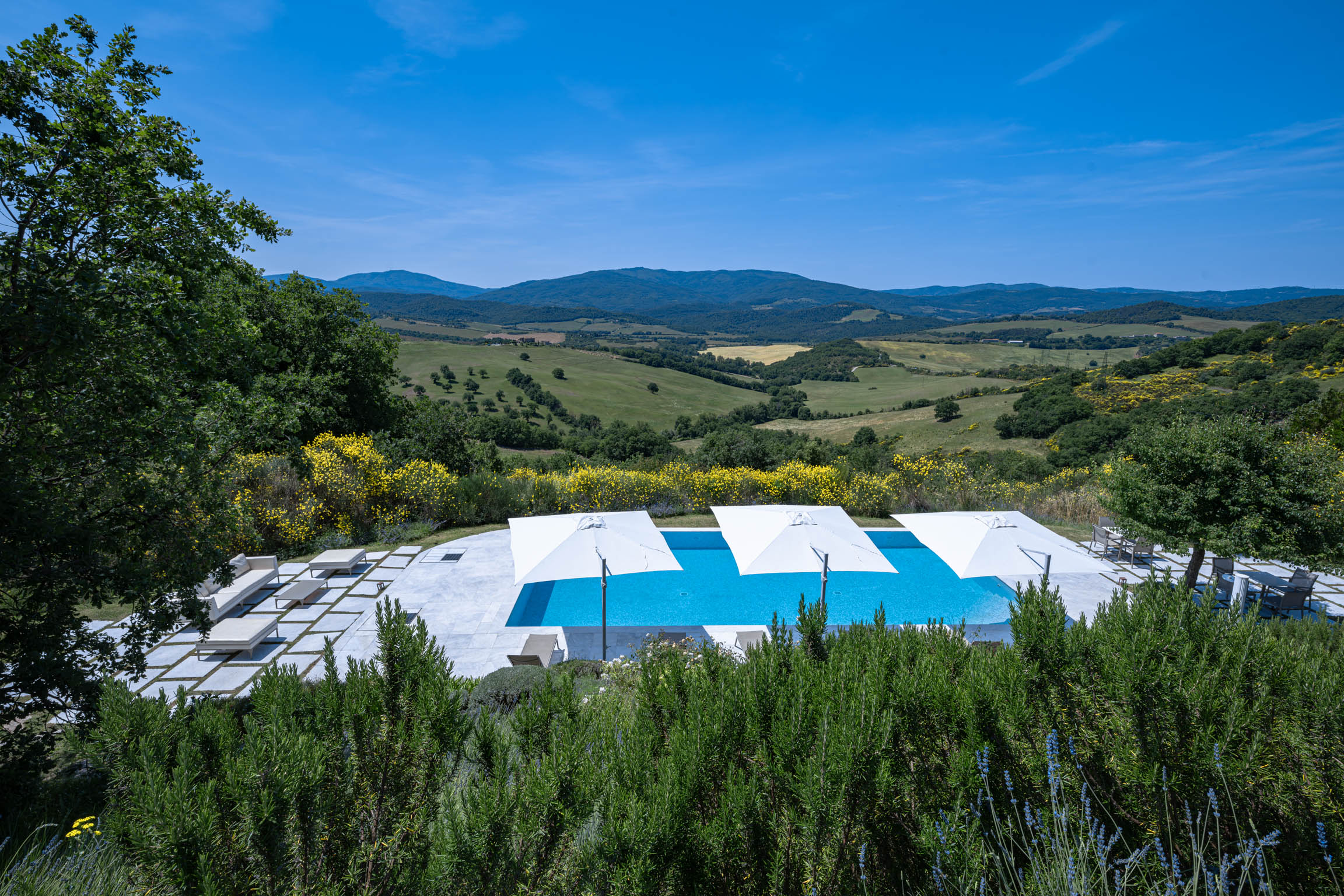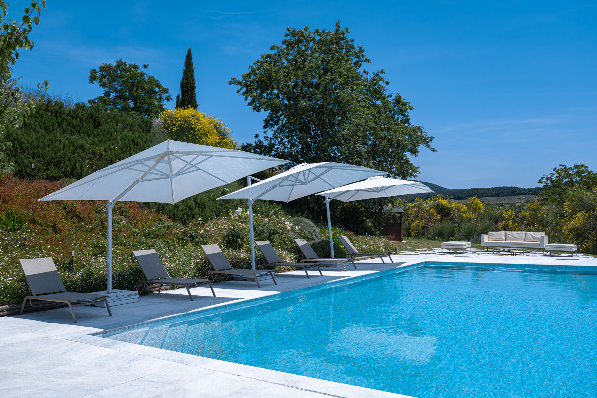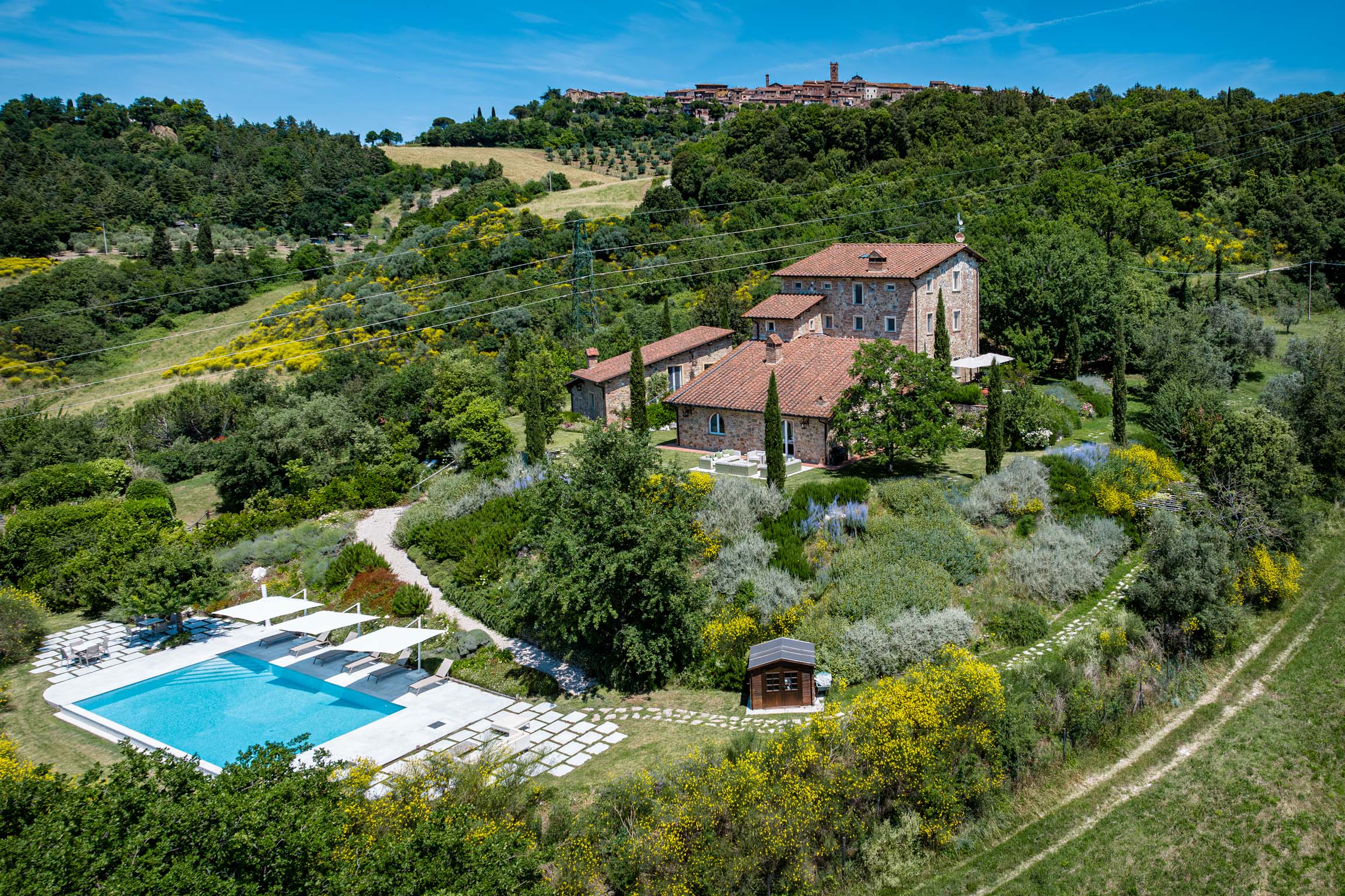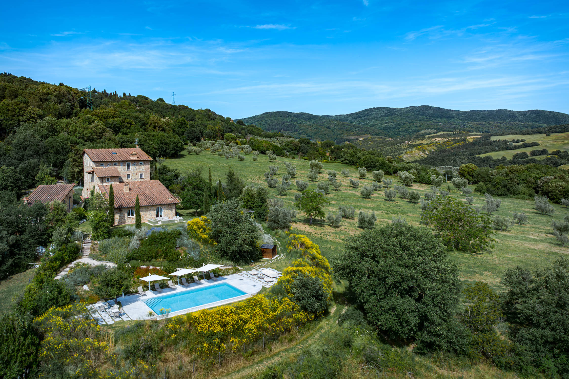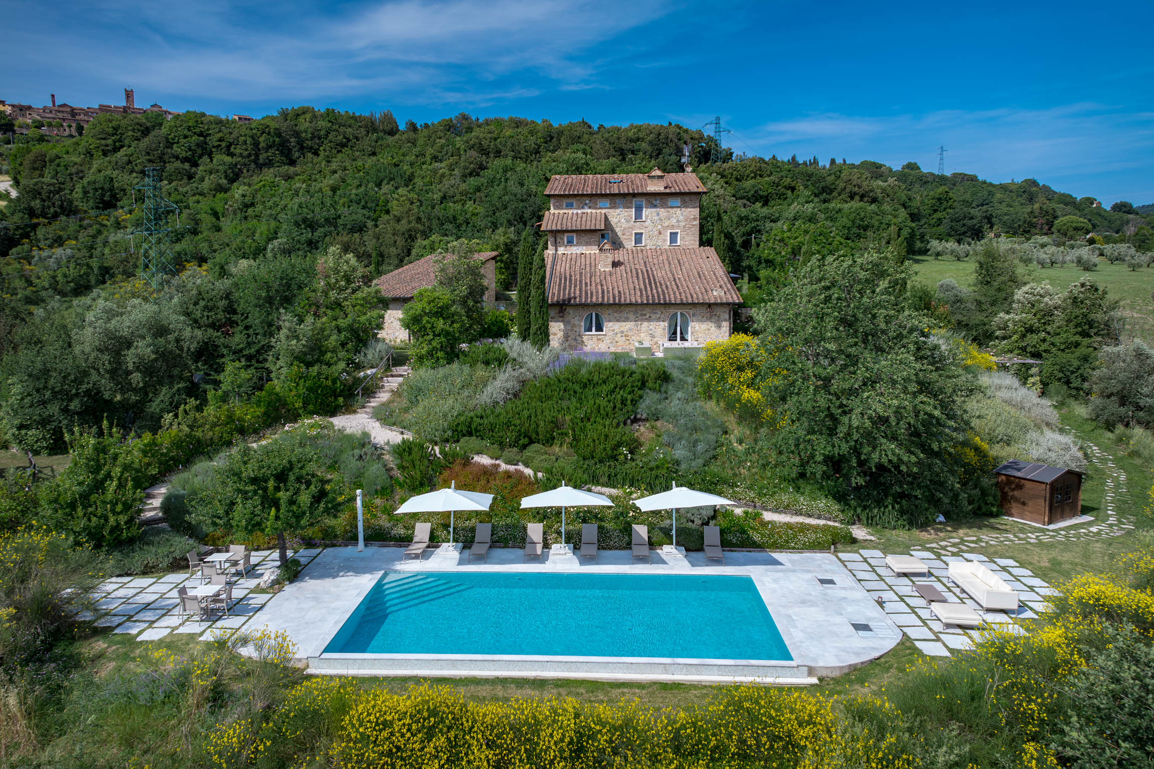There’s also a dedicated al fresco dining area for lingering meals and relaxed barbecues under the open sky. The pool is the showpiece: a 5m x 9m private swimming pool positioned for maximum impact, with sweeping 180-degree viewsover the Tuscan landscape. In the distance, medieval villages dot the hills like something from an old painting—timeless, and unmistakably Tuscany.