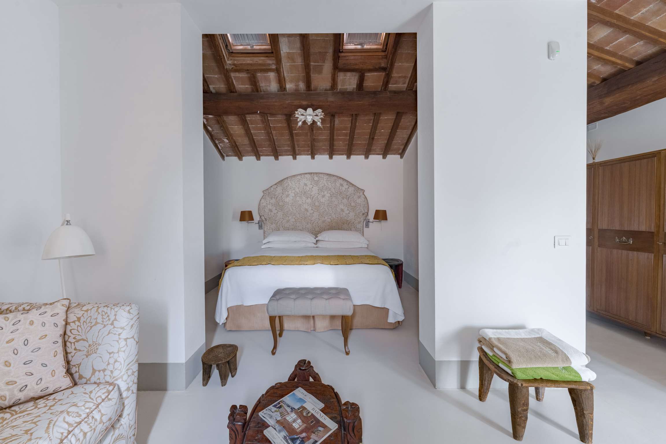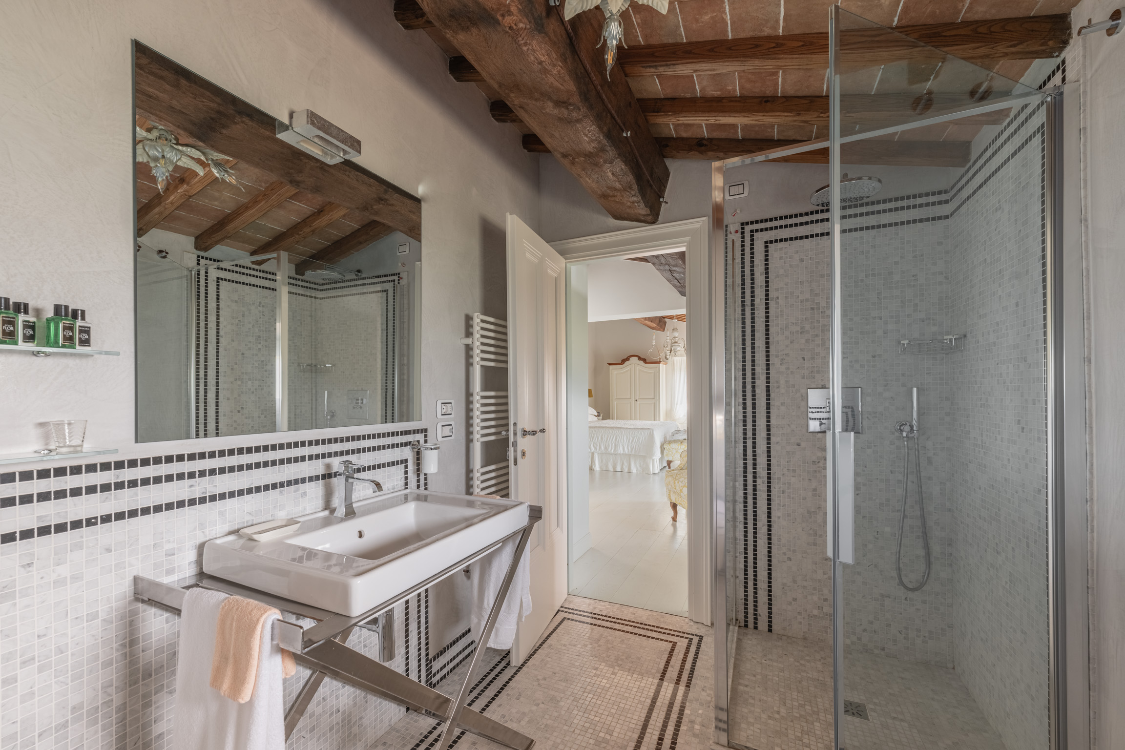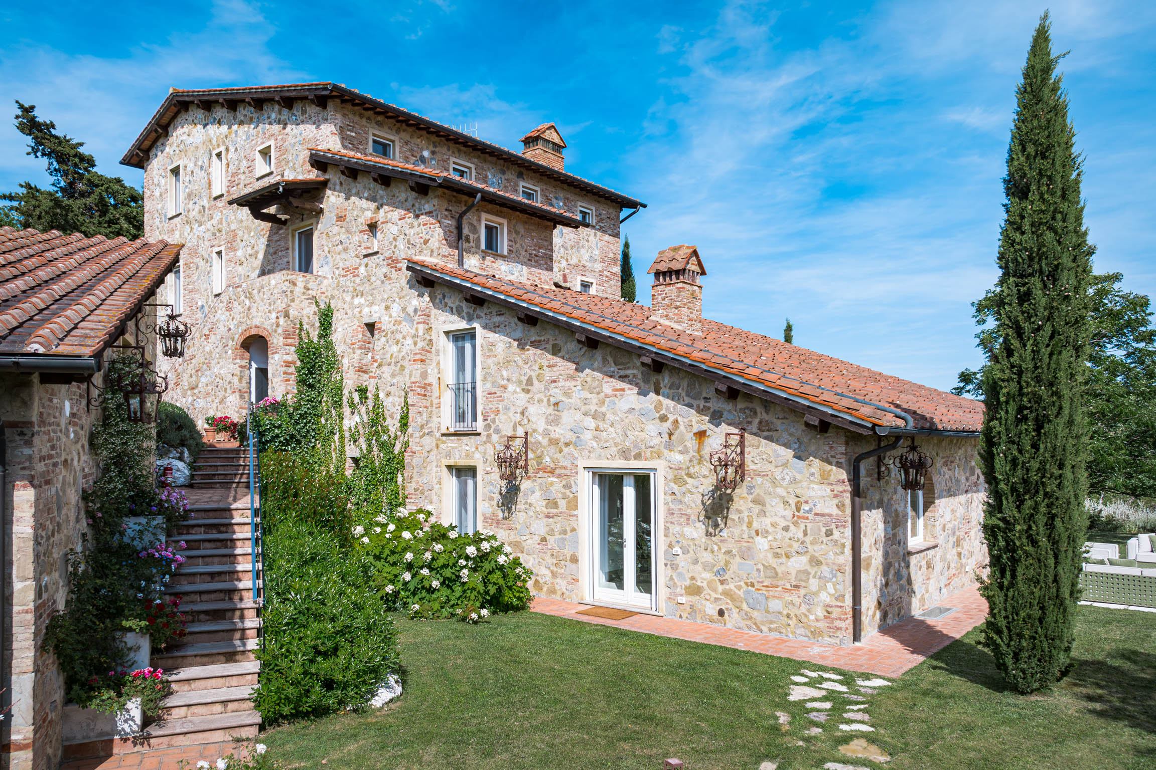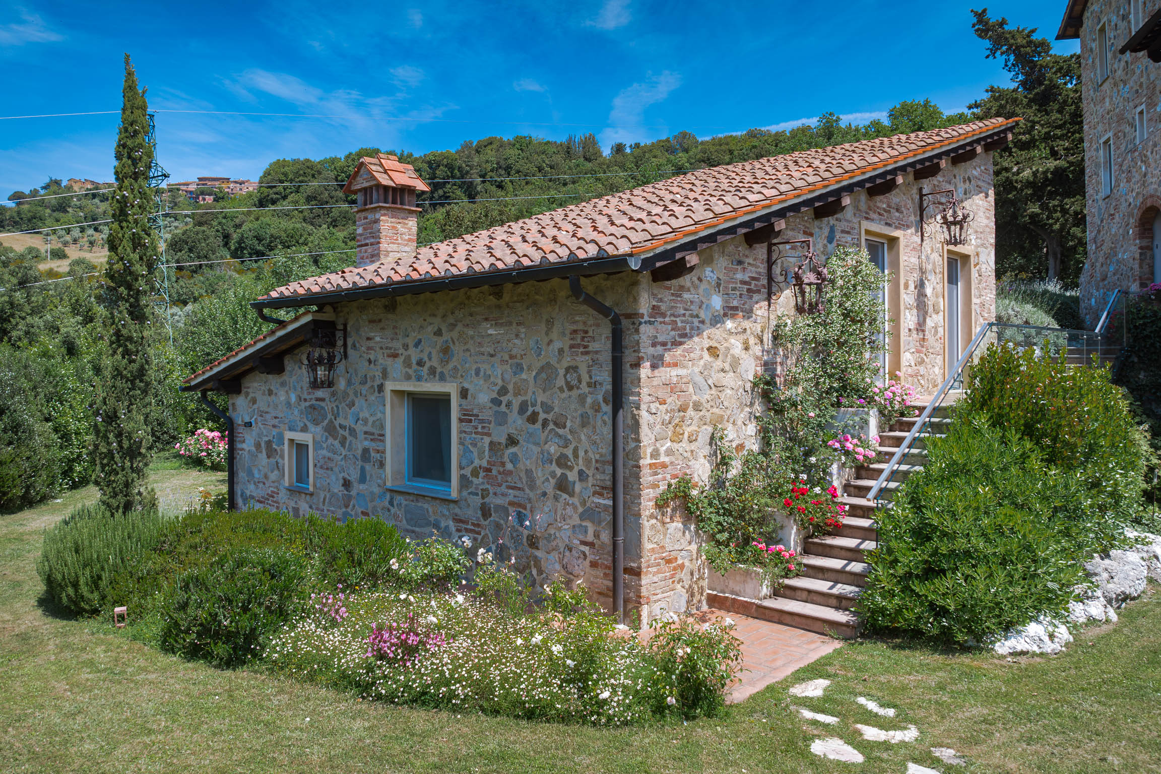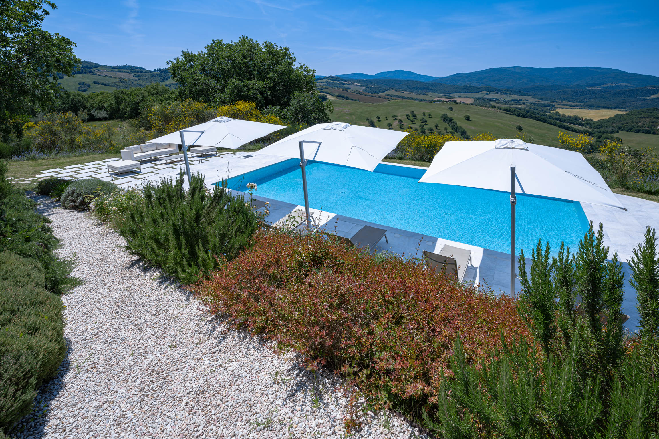 There’s also a dedicated al fresco dining area for lingering meals and relaxed barbecues under the open sky. The pool is the showpiece: a 5m x 9m private swimming pool positioned for maximum impact, with sweeping 180-degree viewsover the Tuscan landscape. In the distance, medieval villages dot the hills like something from an old painting—timeless, and unmistakably Tuscany.