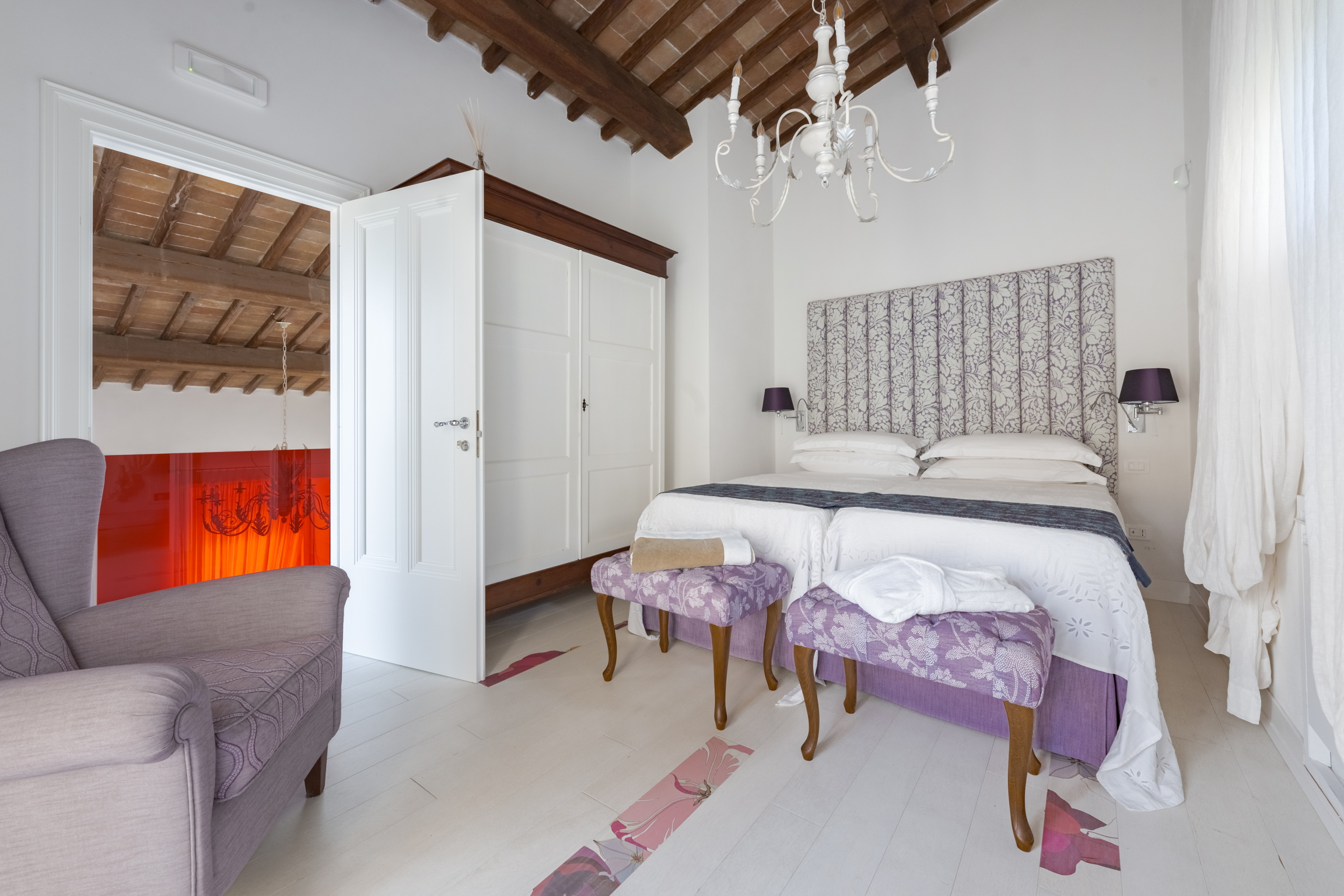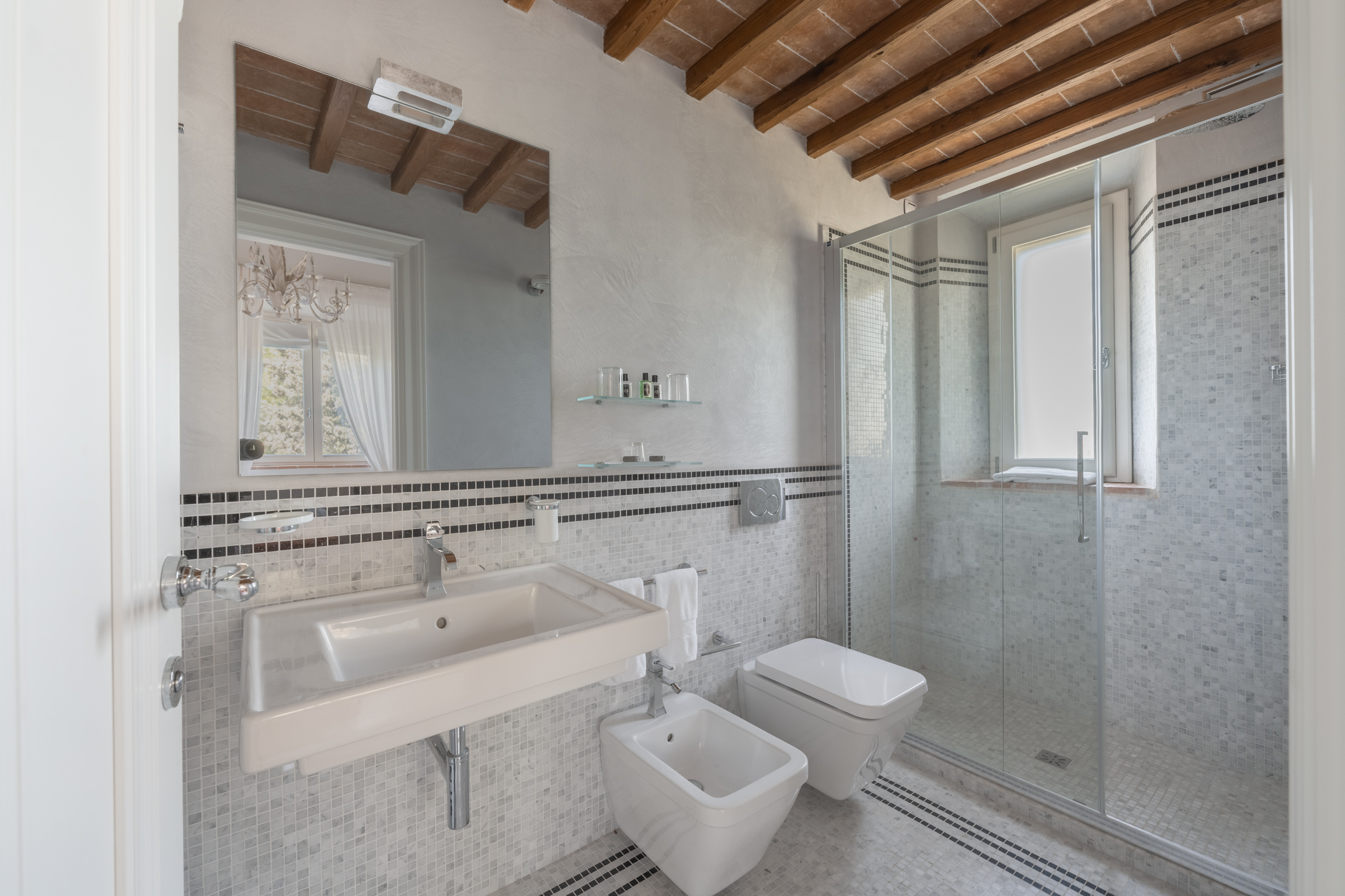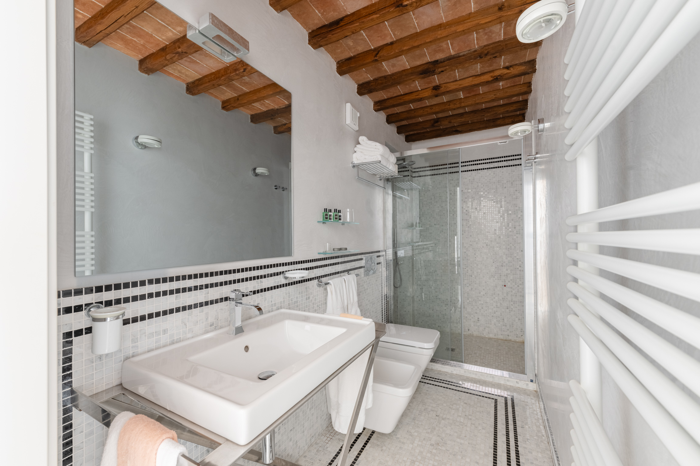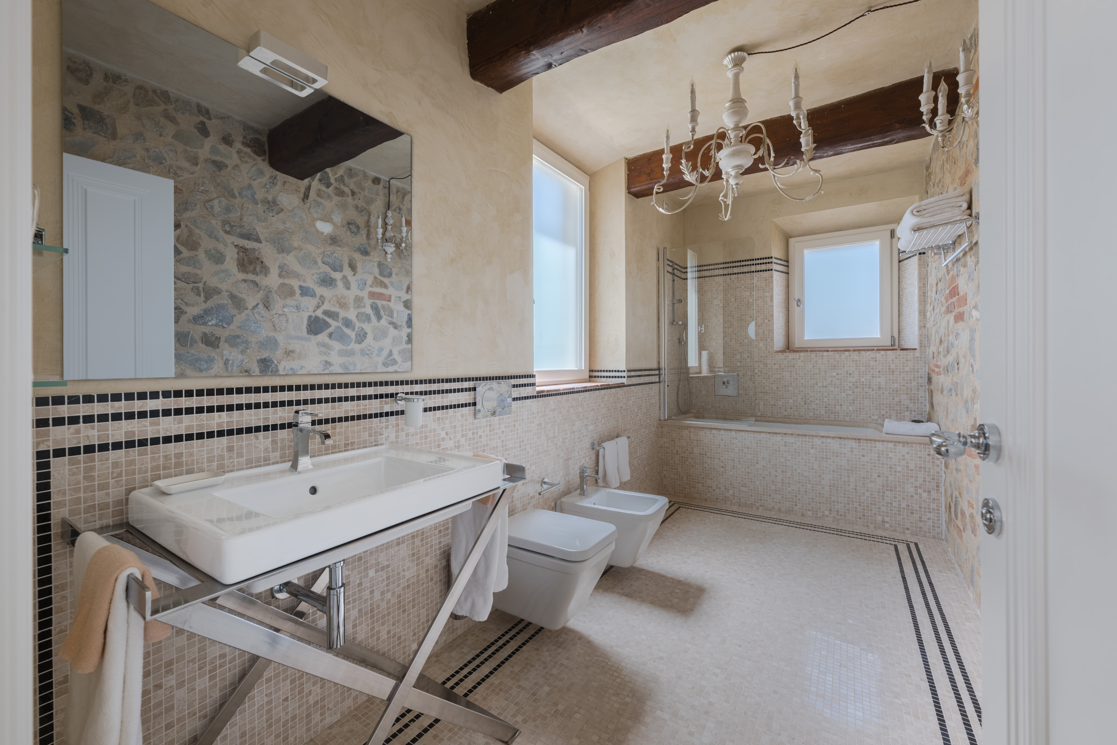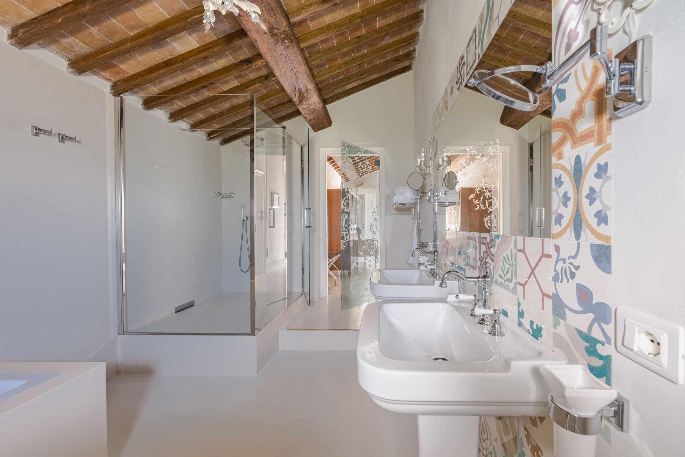 There’s also a dedicated al fresco dining area for lingering meals and relaxed barbecues under the open sky. The pool is the showpiece: a 5m x 9m private swimming pool positioned for maximum impact, with sweeping 180-degree viewsover the Tuscan landscape. In the distance, medieval villages dot the hills like something from an old painting—timeless, and unmistakably Tuscany.