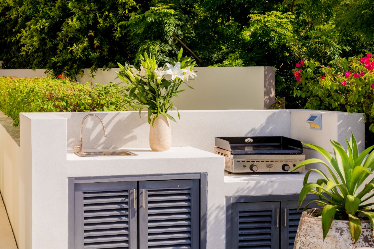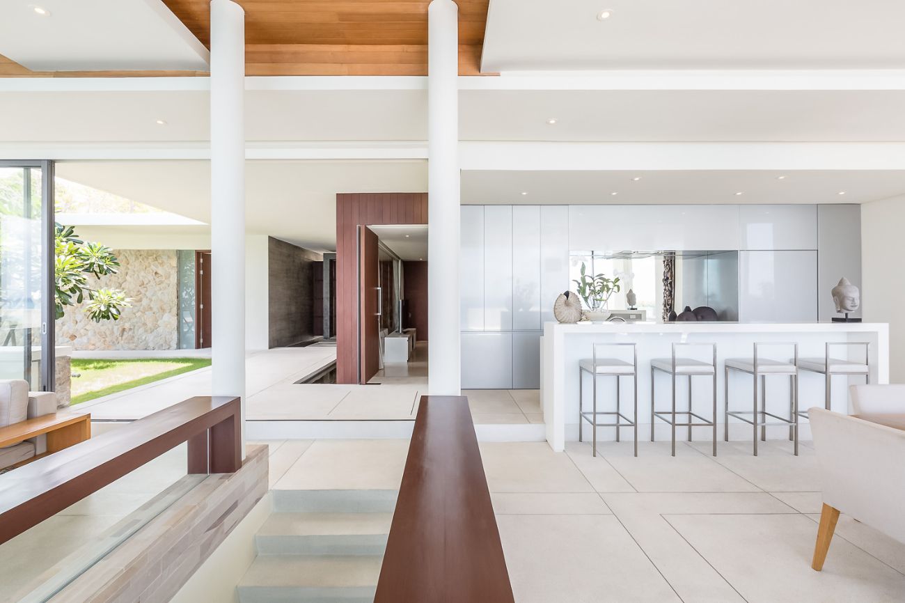 Spread over three levels, Villa Natha maximizes space and ocean views with seamless indoor-outdoor living. The top floor features the main lounge, a sea-view dining area for 10, and a fully fitted show kitchen, complemented by a separate chef’s kitchen for flawless service. Glass doors open directly to the infinity pool and sun terrace, where alfresco dining and cocktails against the sunset become part of the daily ritual. A built-in barbecue makes outdoor feasts effortless.