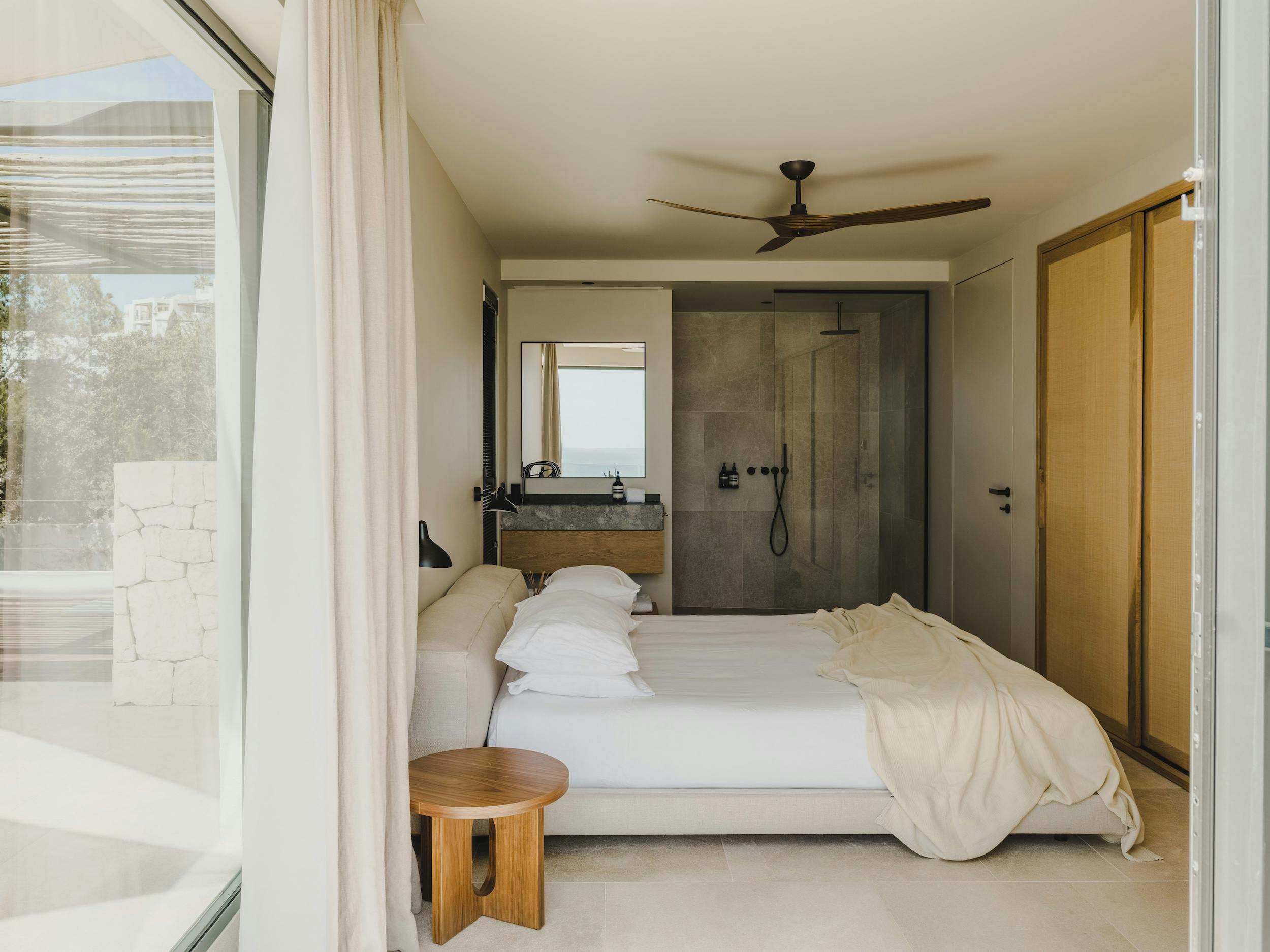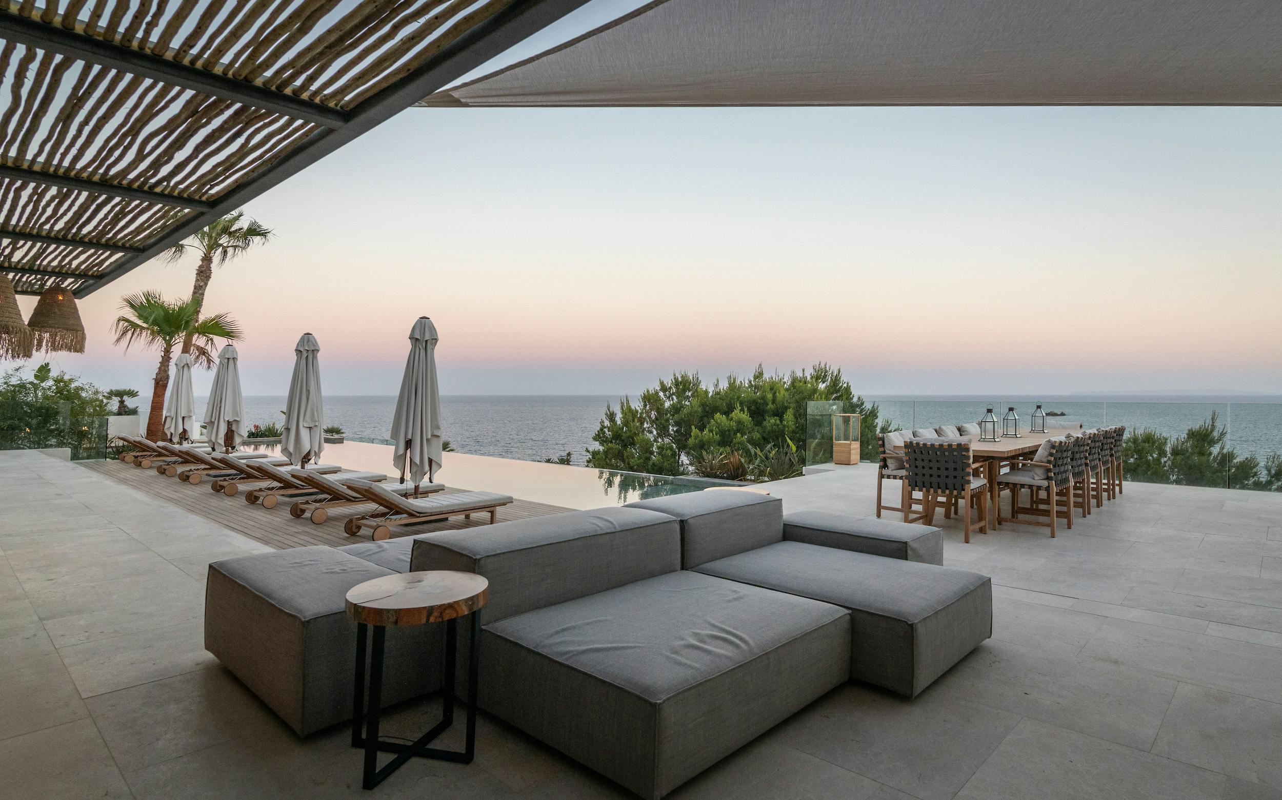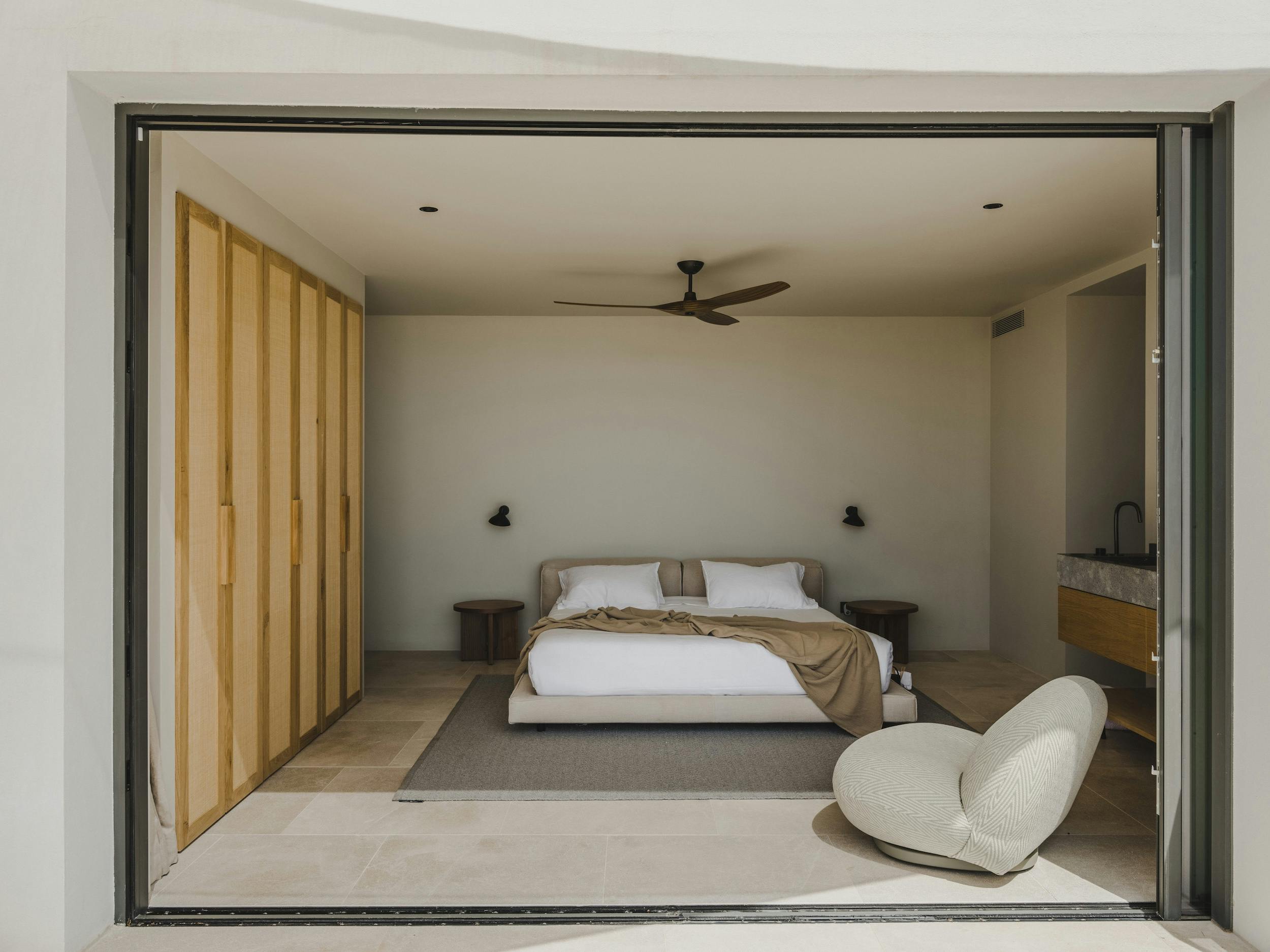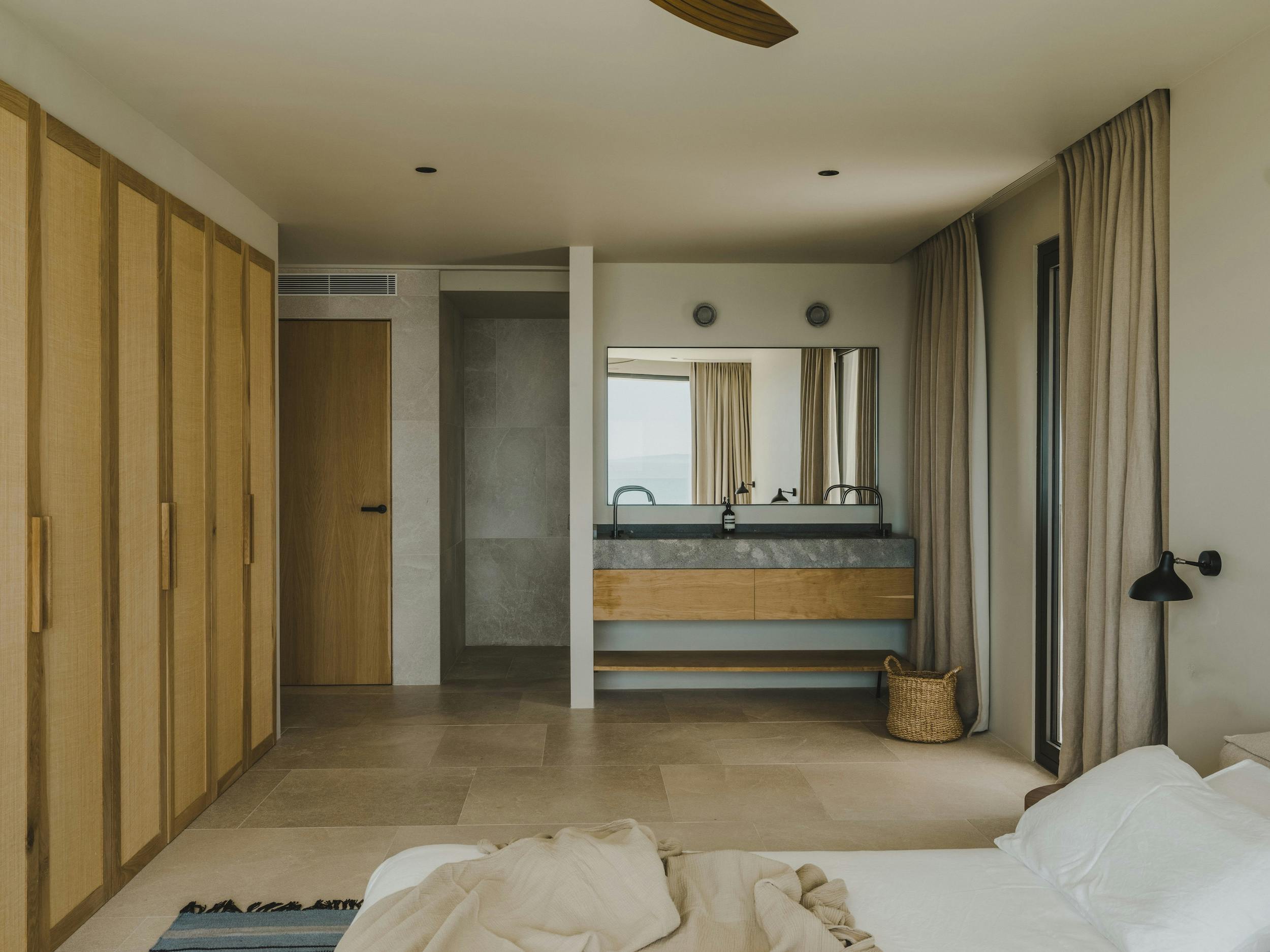 With a private terrace and unobstructed views of the sea, each of the villa’s five bedrooms is a peaceful haven. Crisp white linens, natural textures, and gentle neutral color schemes all carry on the design philosophy. Each room features a large dressing area and an opulent bathroom with warm wood tones and smooth stone finishes.