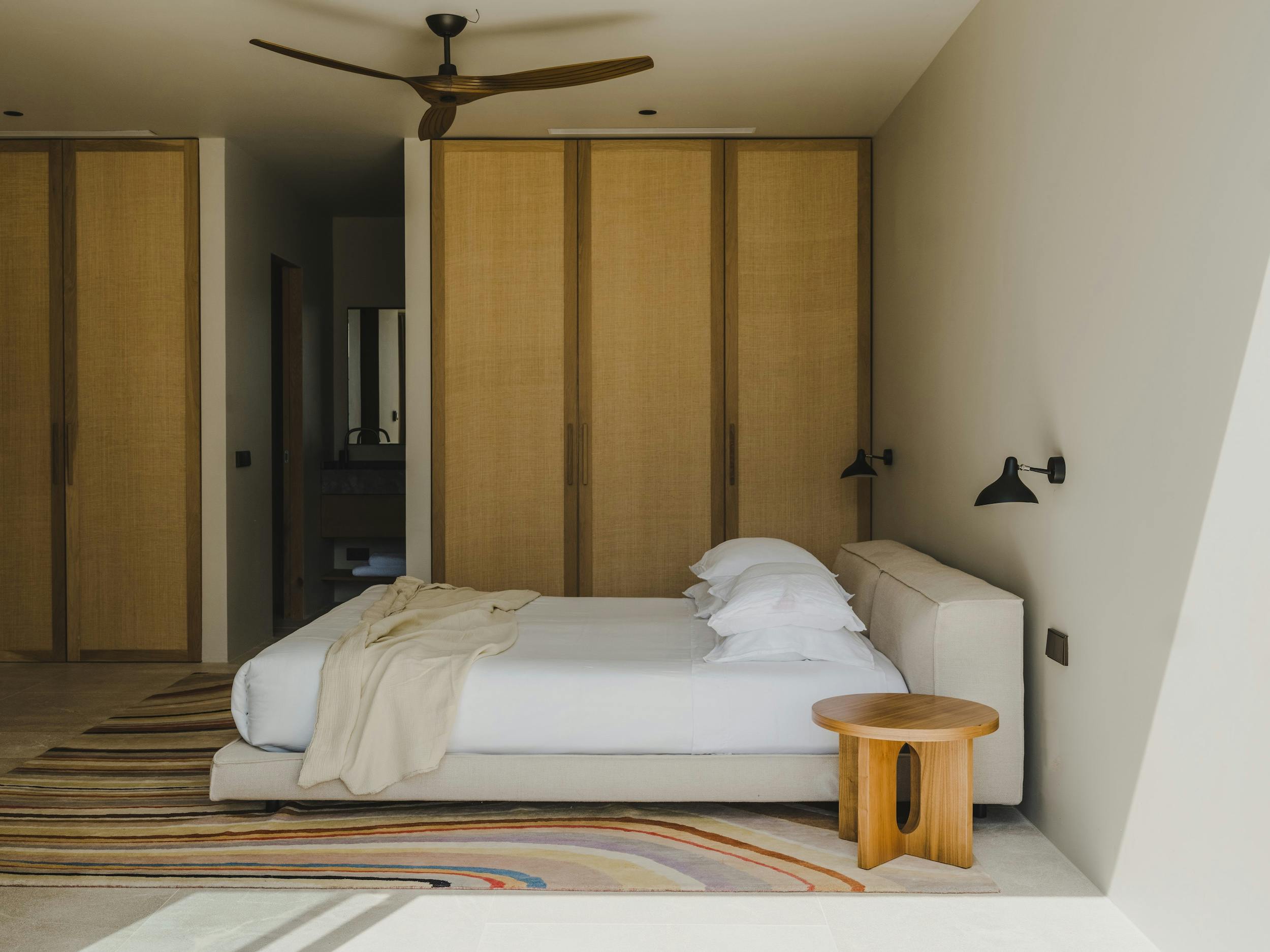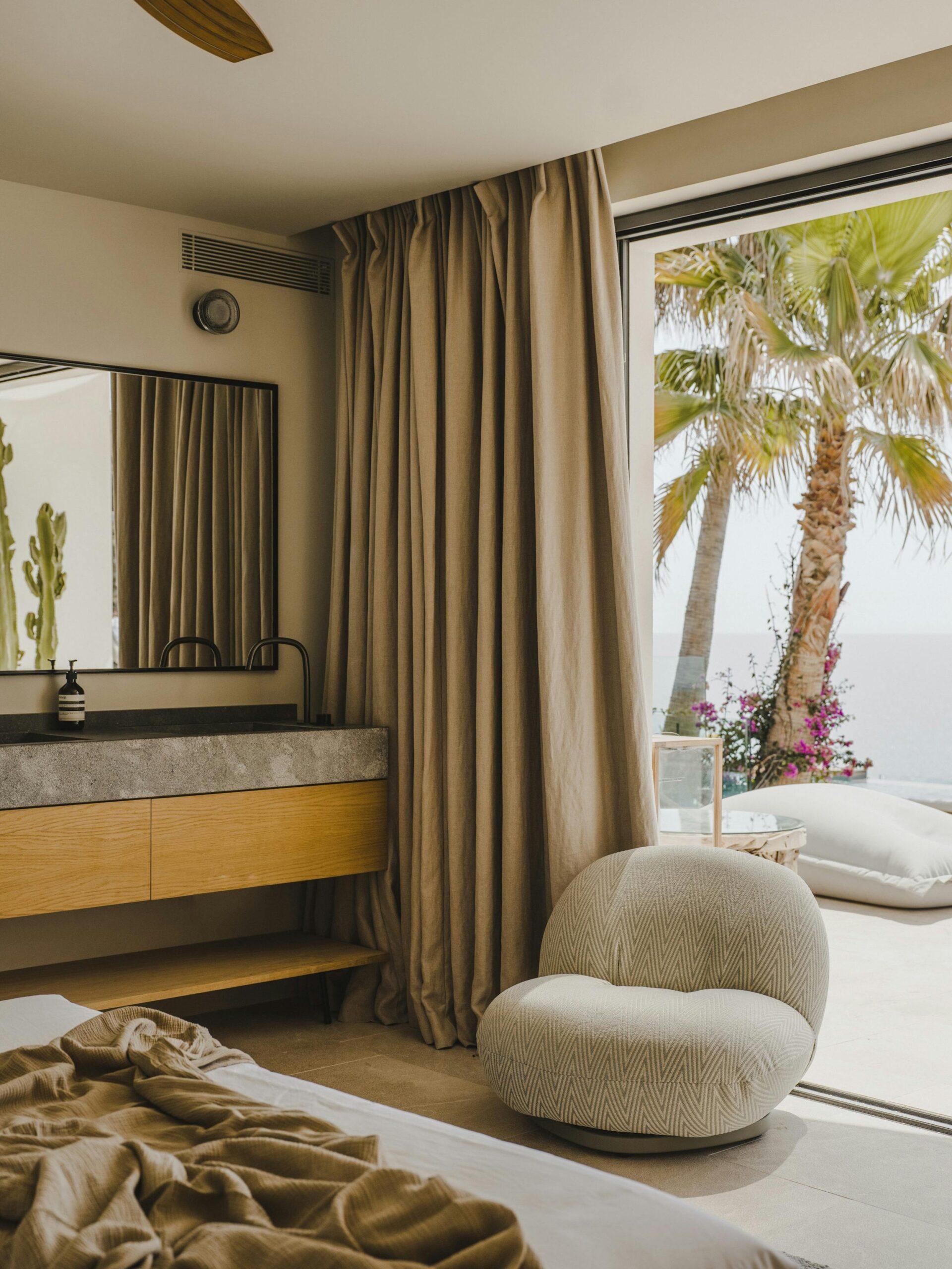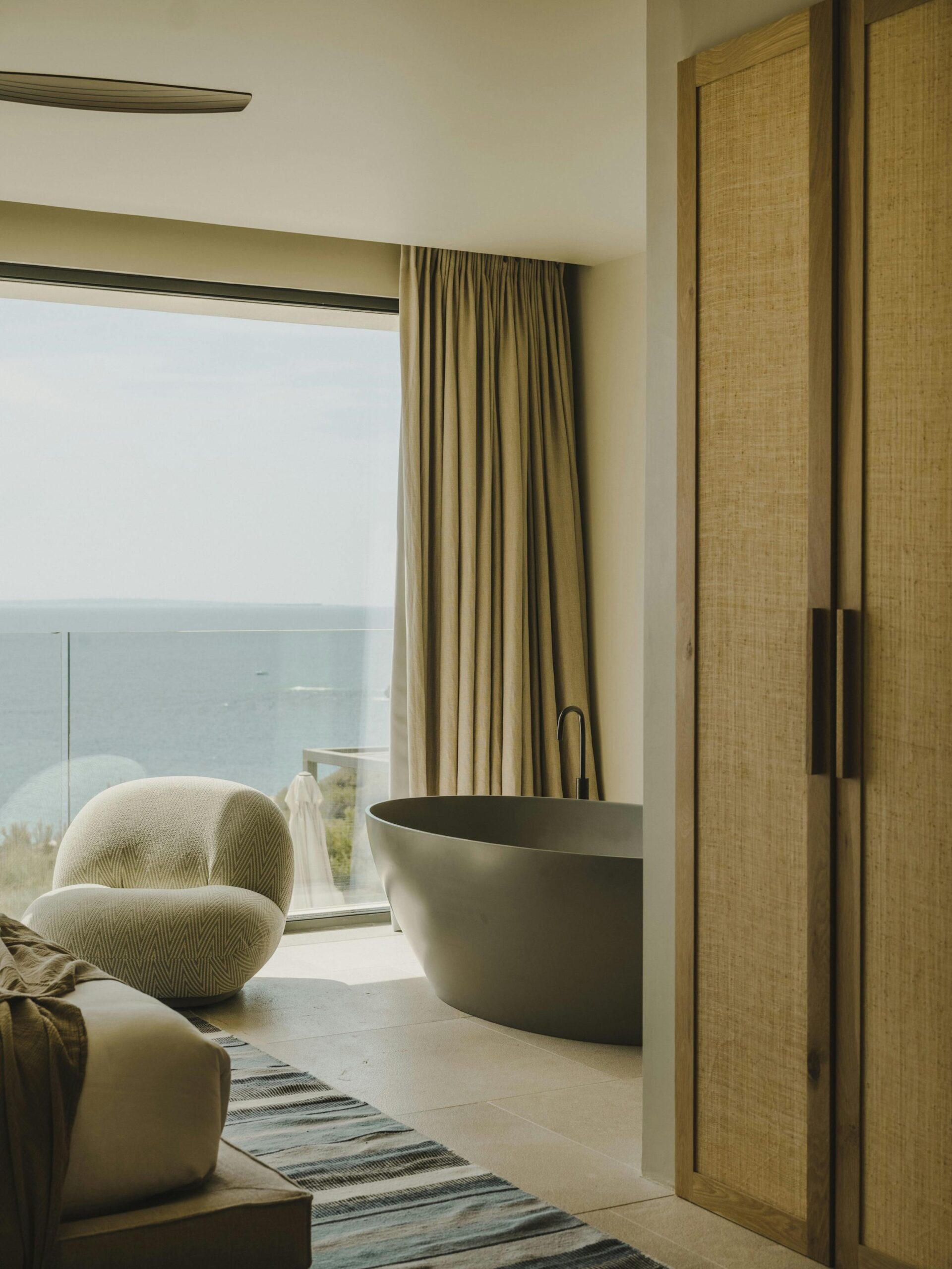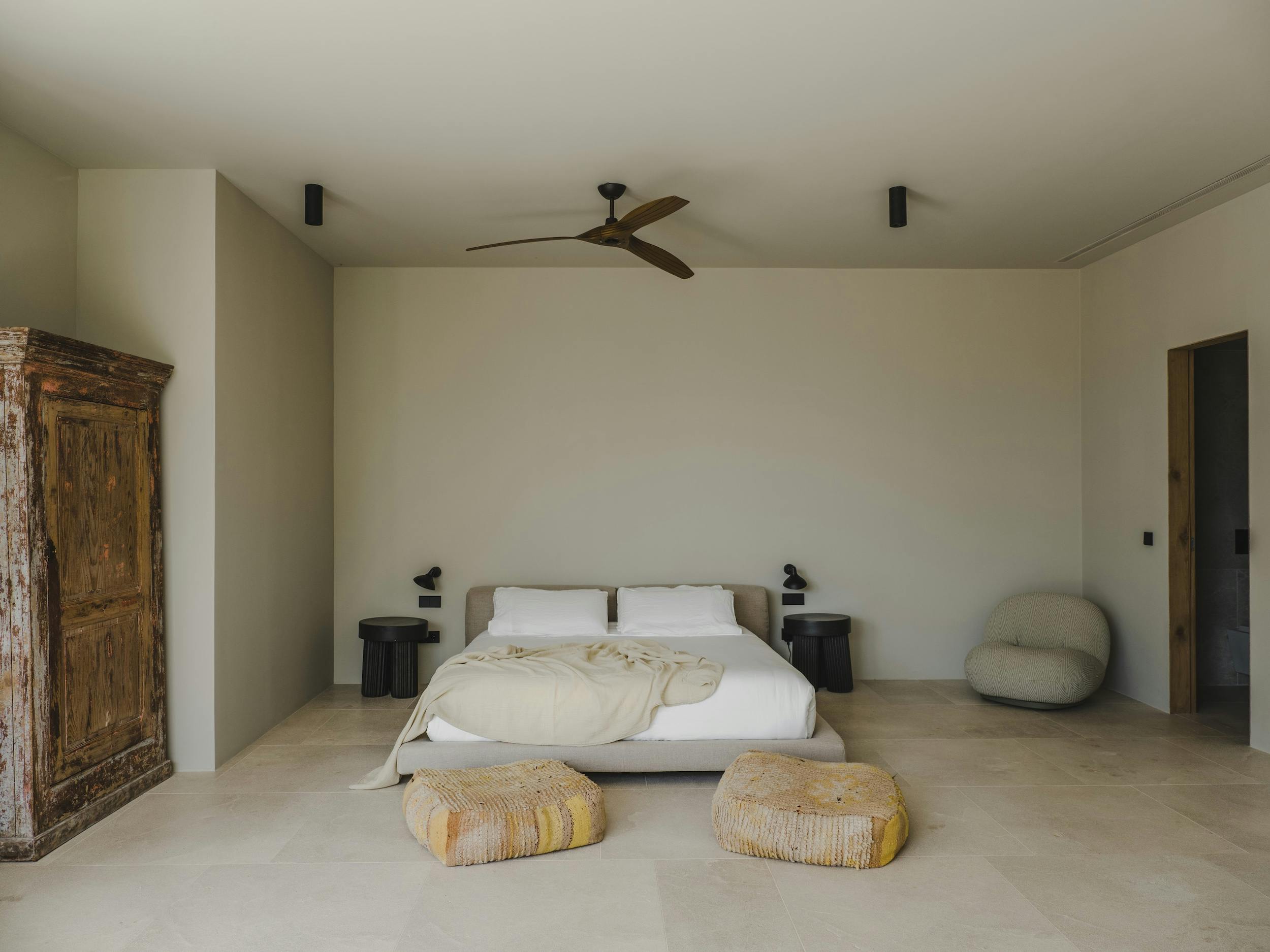 With a private terrace and unobstructed views of the sea, each of the villa’s five bedrooms is a peaceful haven. Crisp white linens, natural textures, and gentle neutral color schemes all carry on the design philosophy. Each room features a large dressing area and an opulent bathroom with warm wood tones and smooth stone finishes.