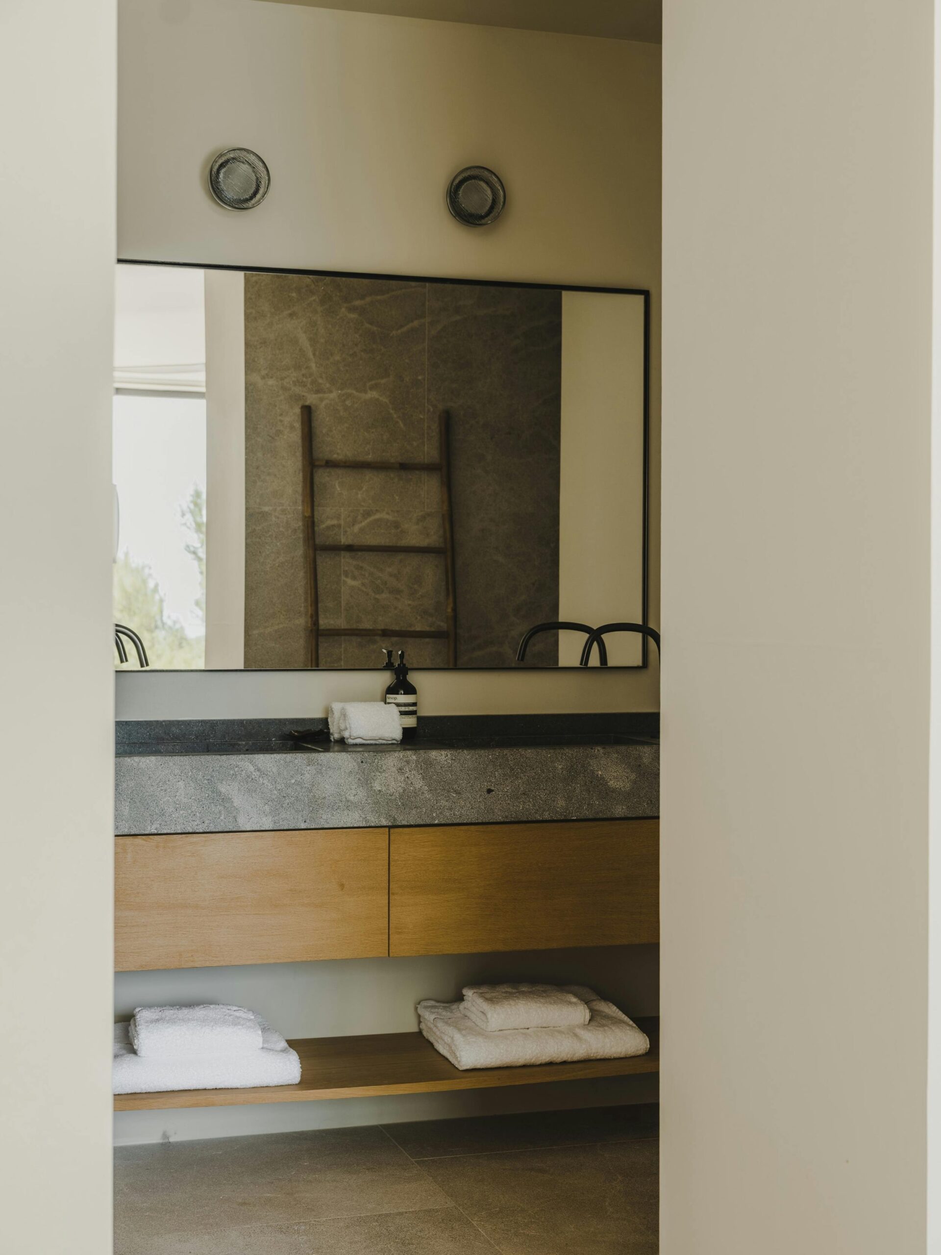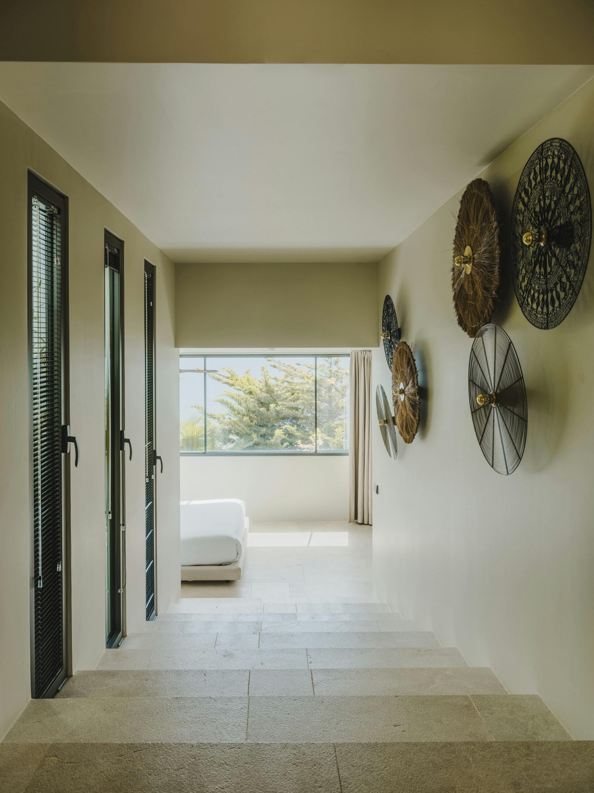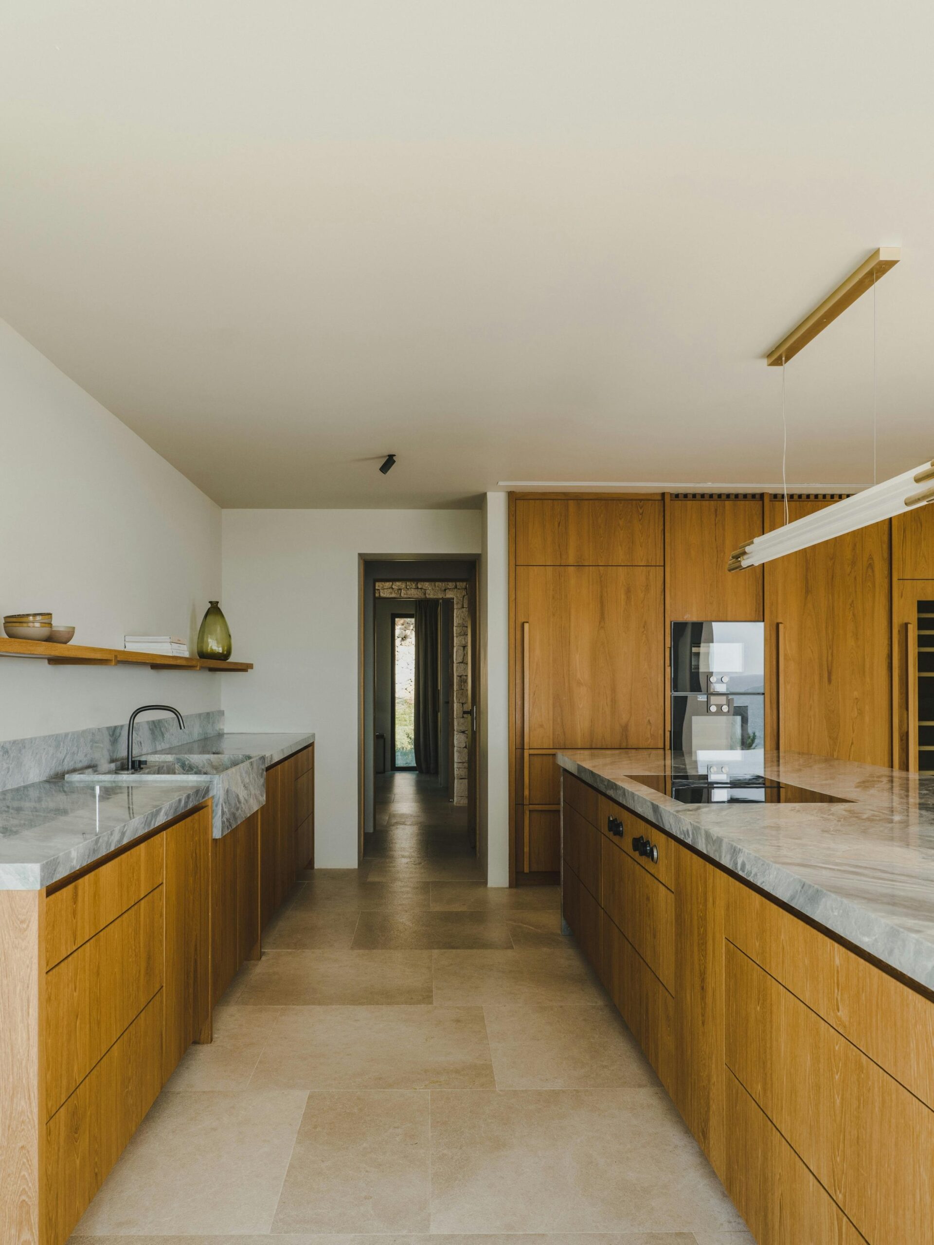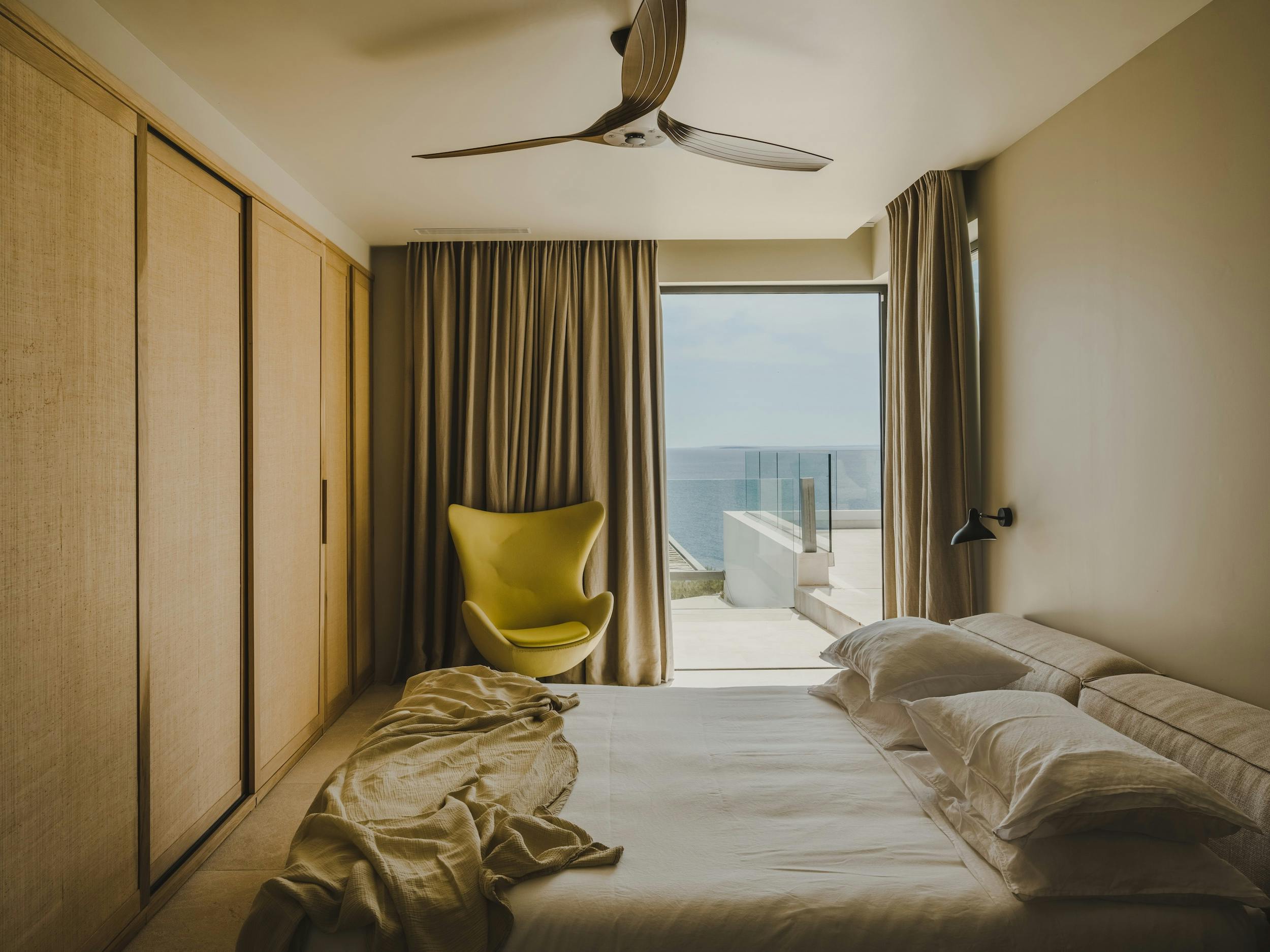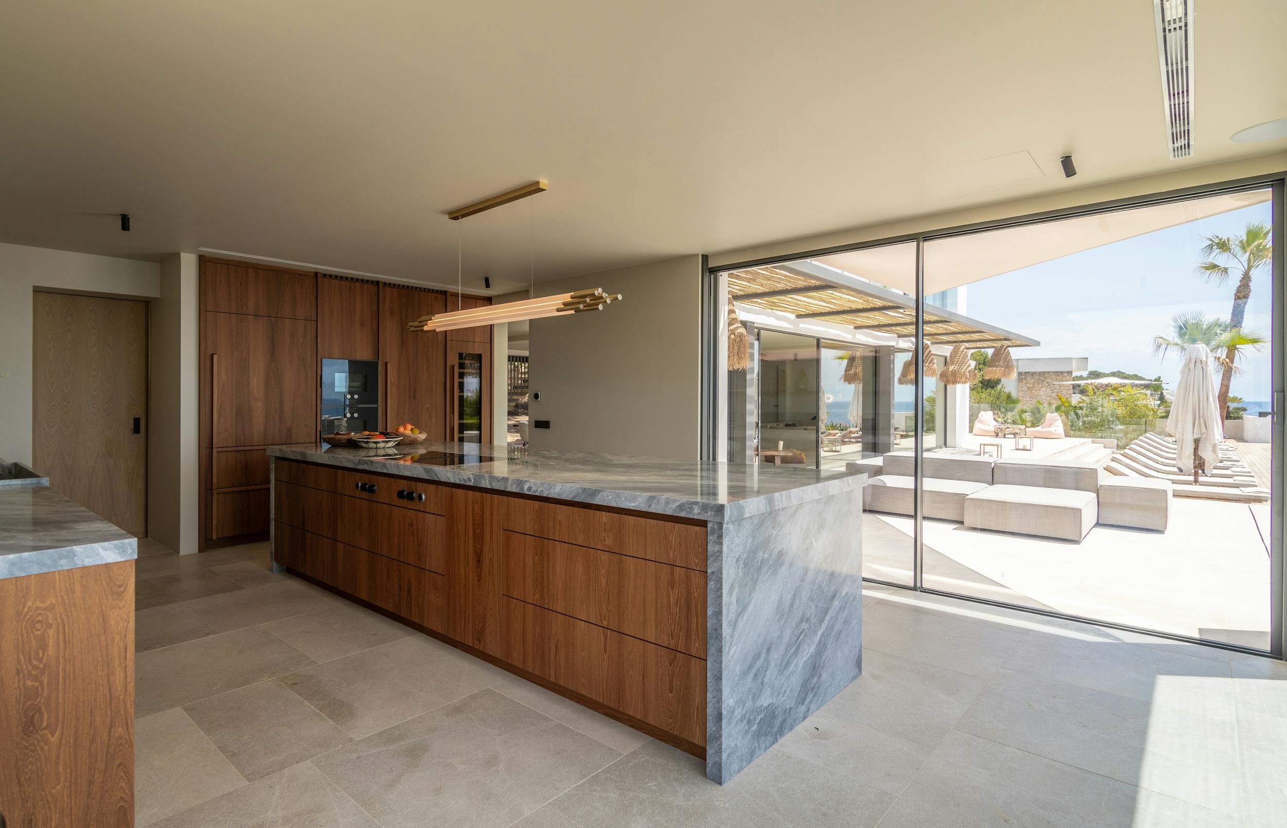 With a private terrace and unobstructed views of the sea, each of the villa’s five bedrooms is a peaceful haven. Crisp white linens, natural textures, and gentle neutral color schemes all carry on the design philosophy. Each room features a large dressing area and an opulent bathroom with warm wood tones and smooth stone finishes.