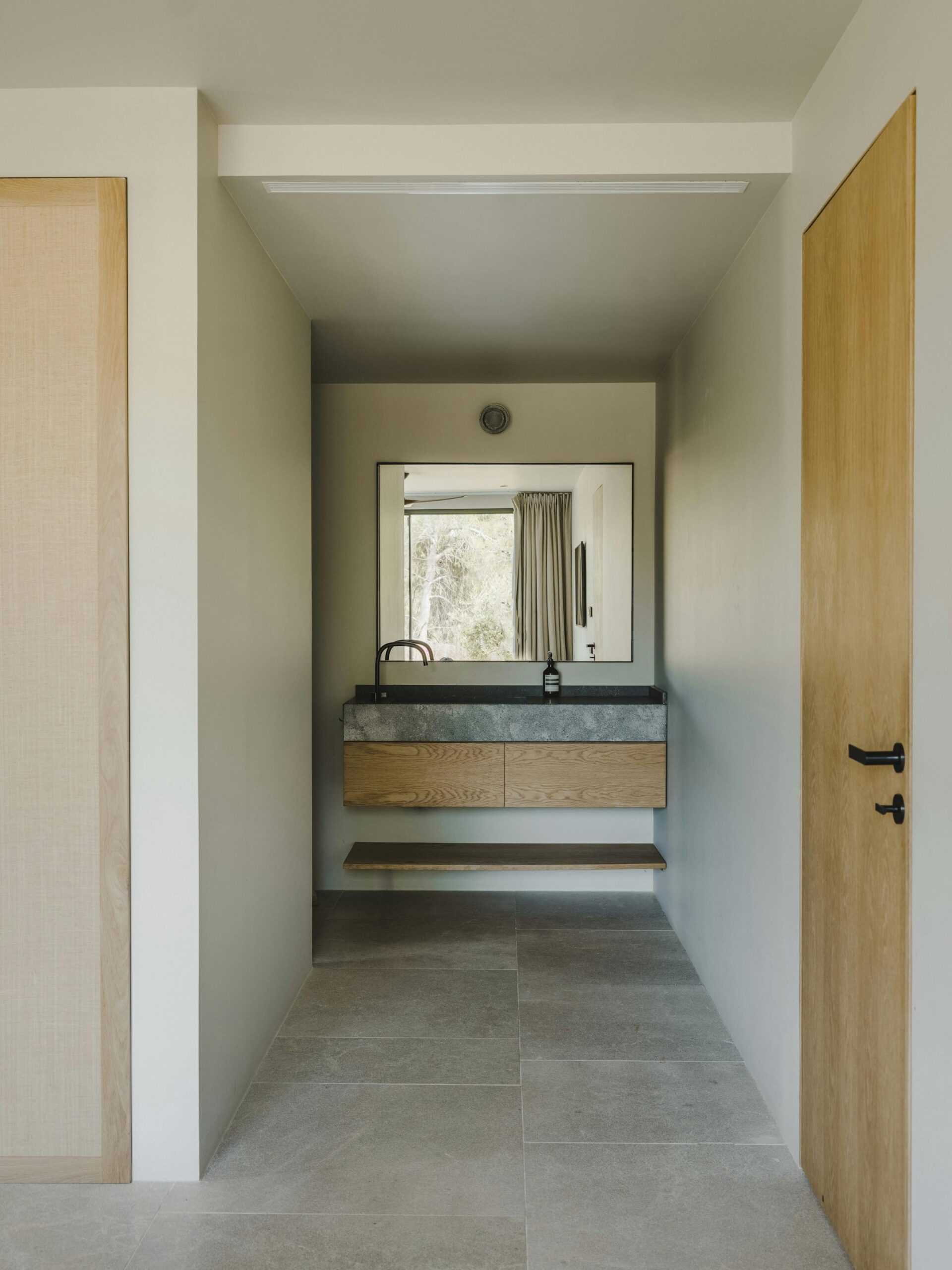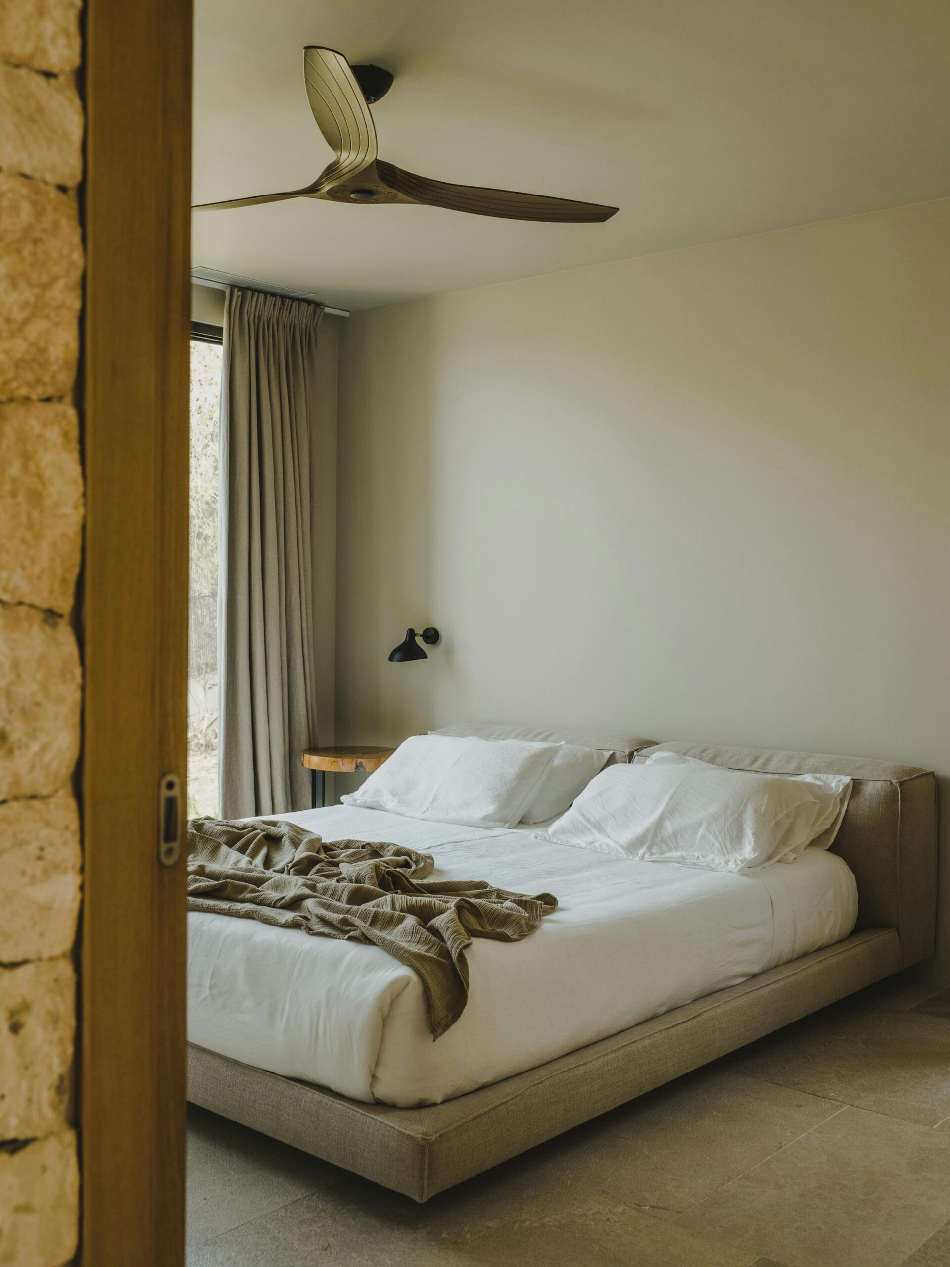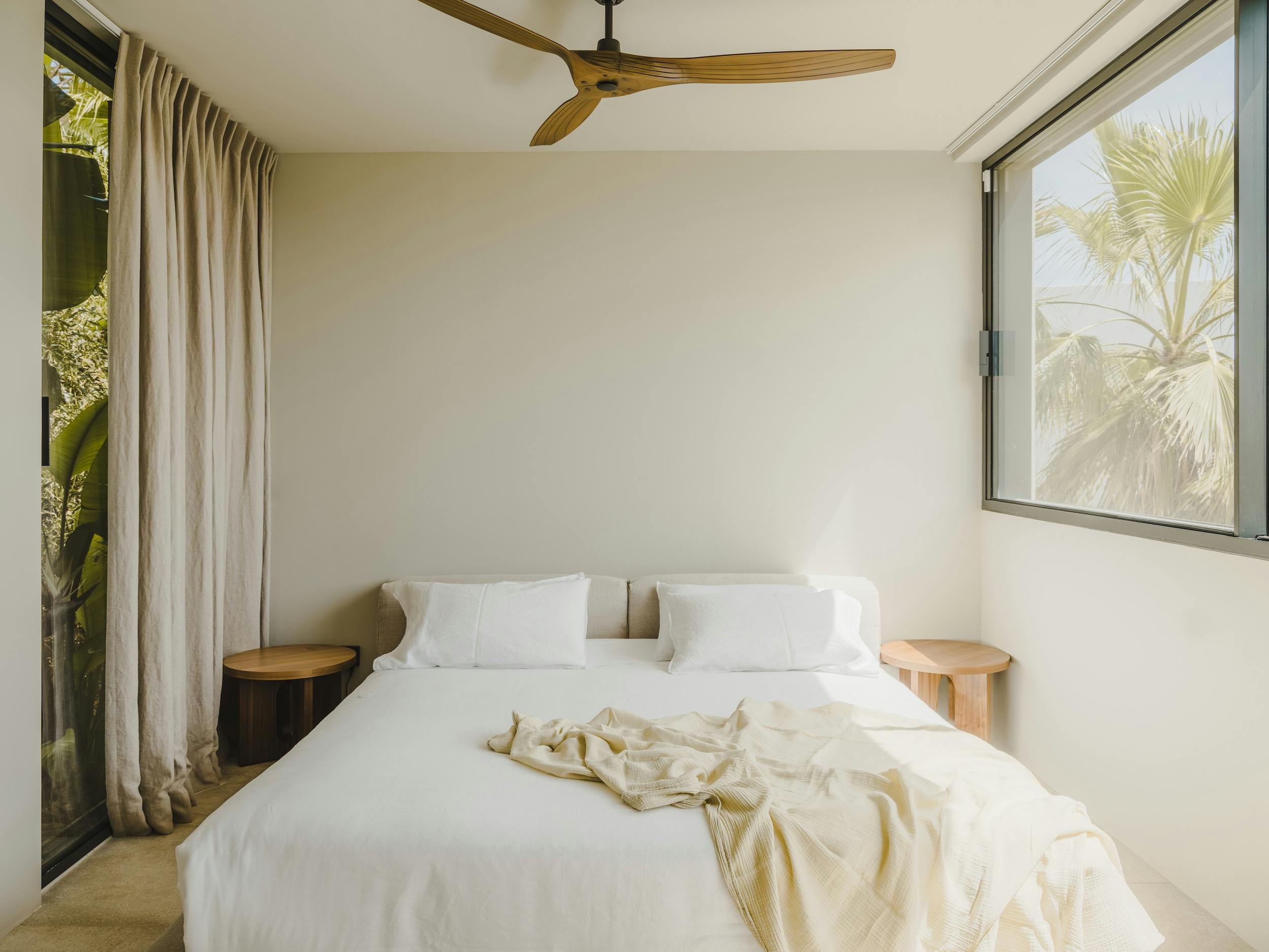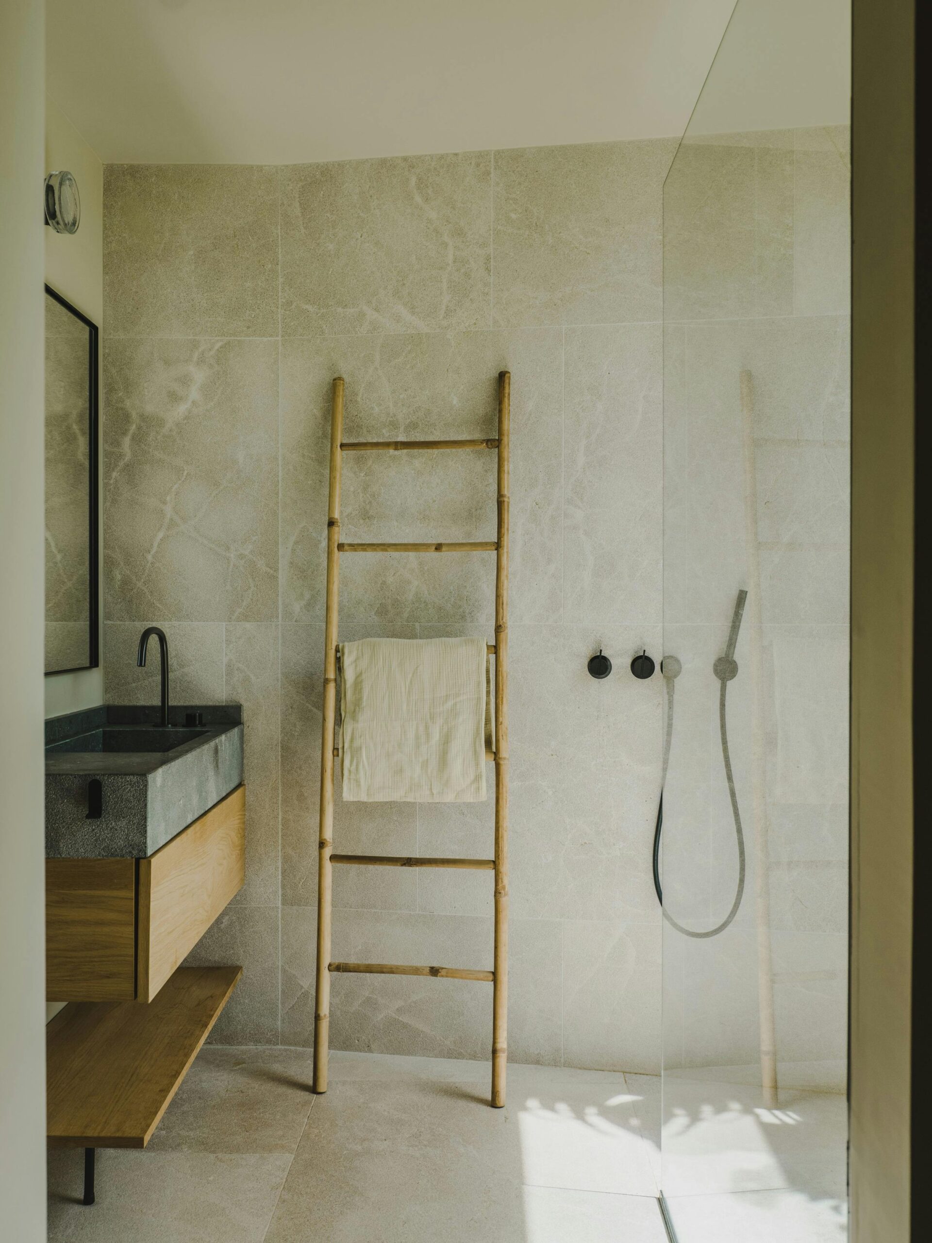 With a private terrace and unobstructed views of the sea, each of the villa’s five bedrooms is a peaceful haven. Crisp white linens, natural textures, and gentle neutral color schemes all carry on the design philosophy. Each room features a large dressing area and an opulent bathroom with warm wood tones and smooth stone finishes.