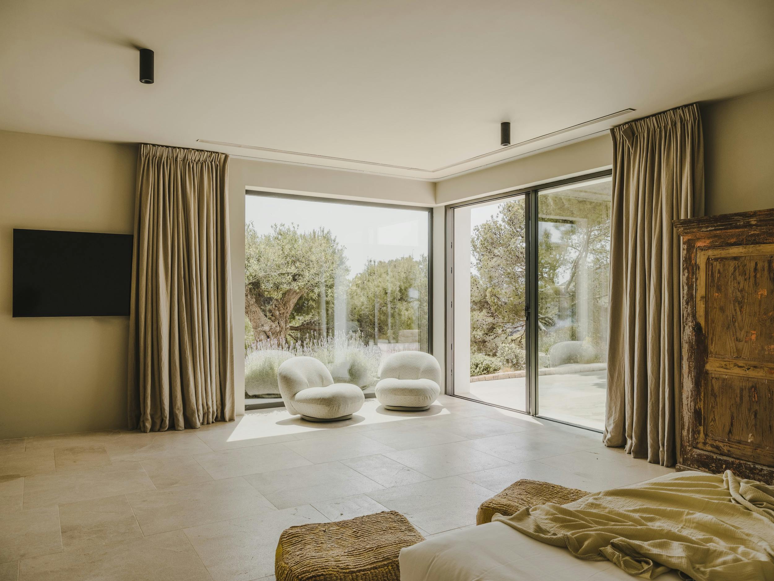 Villa Nereo is ideally situated for those who want seclusion and closeness, situated in the upscale gated community of Roca Llisa, between the bustling town of Ibiza and the quaint village of Santa Eulalia. Olive trees, aromatic herbs, and colorful bougainvillea abound in the property’s 3,000 square meters of well-kept Mediterranean gardens, which frame a breathtaking 180-degree view of the ocean. From the living room to the bedrooms, every angle overlooks the limitless blue horizon.