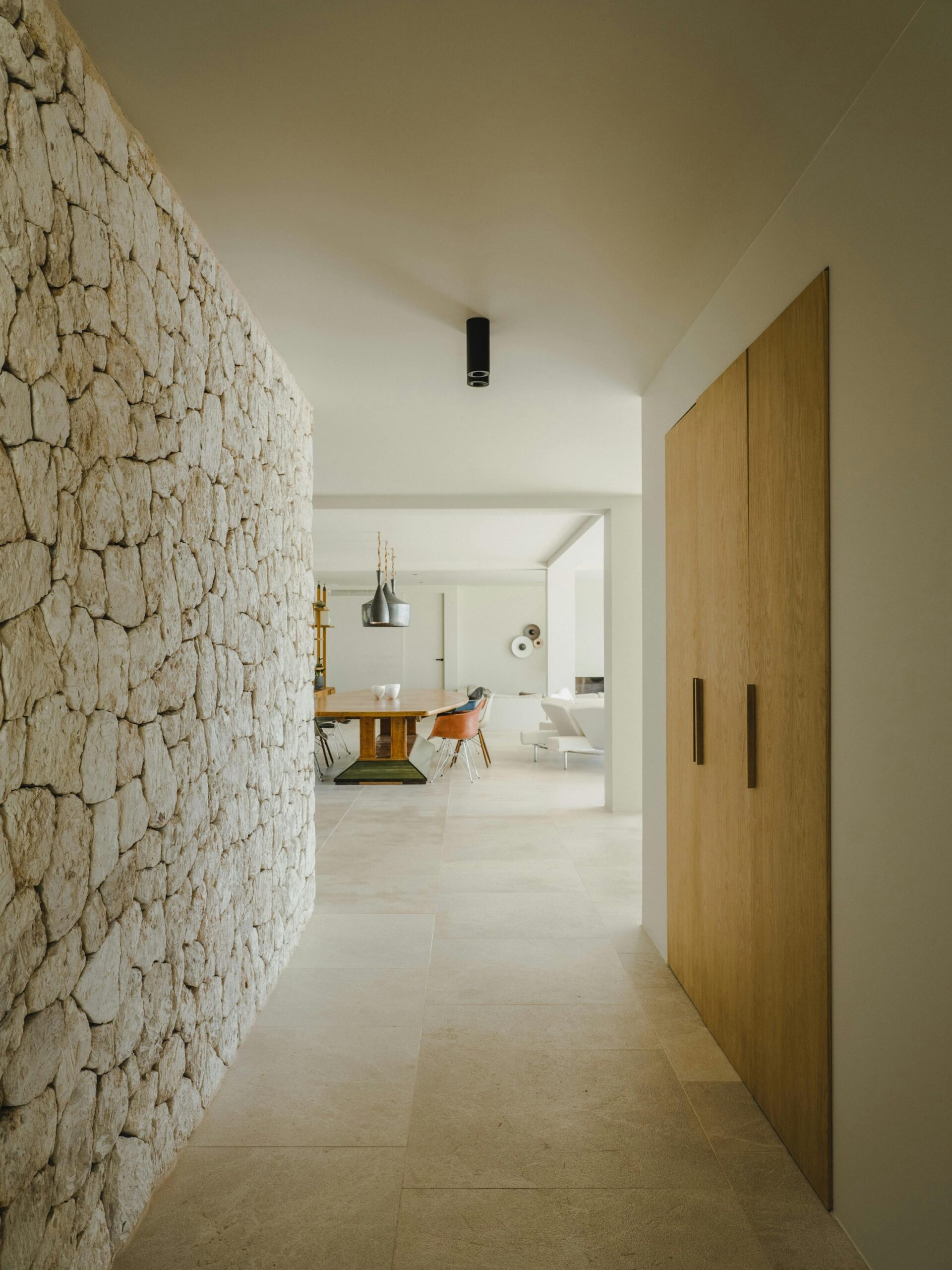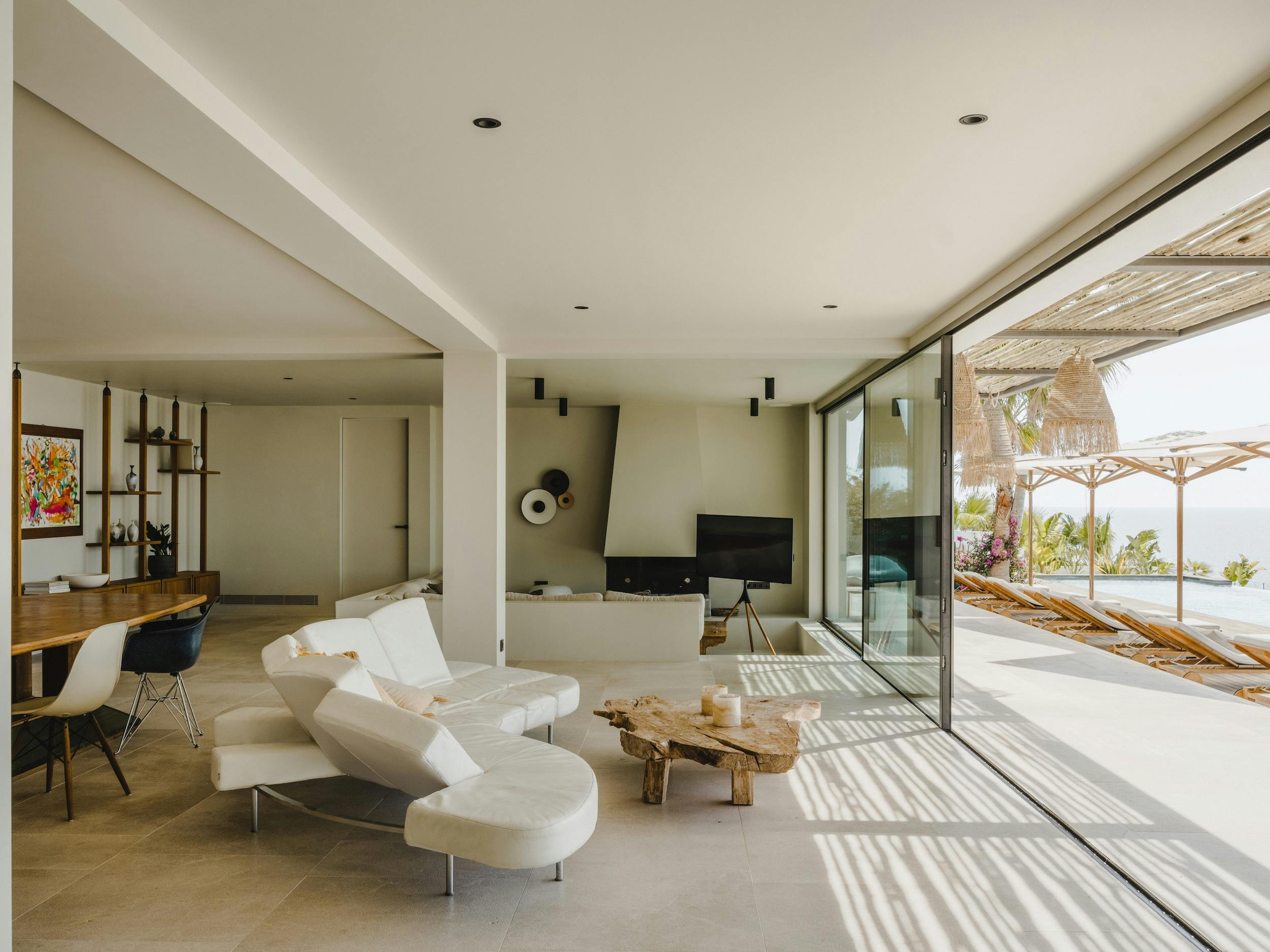 The villa’s interiors, created by Dutch designer Jurjen Van Hulzen and designed by well-known local architect Jaime Serra, have a subtle, modern elegance. A timeless ambiance is produced by the use of natural materials like stone, wood, and glass, as well as clean architectural lines and expansive open areas. Its design revolves around the interaction of light and space; expansive sliding glass doors blur the line between indoor and outdoor spaces, letting sunlight and sea breezes flood the house from sunrise to sunset.