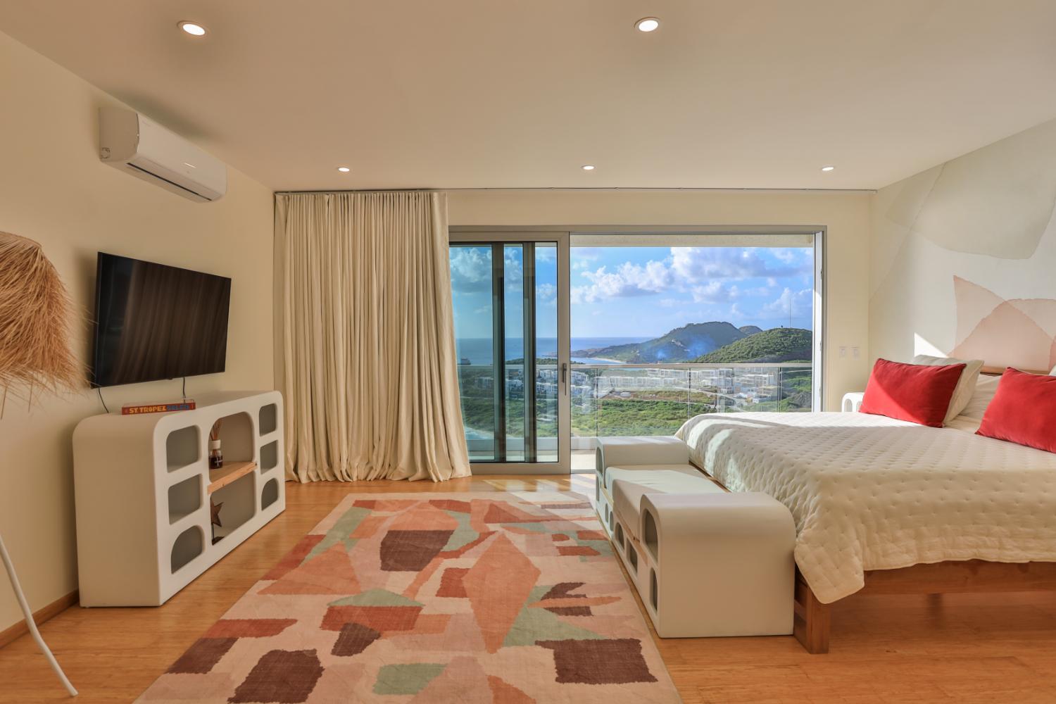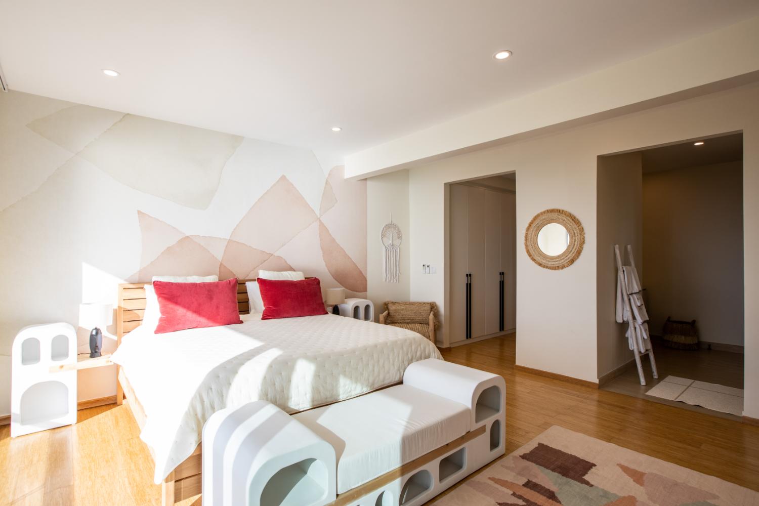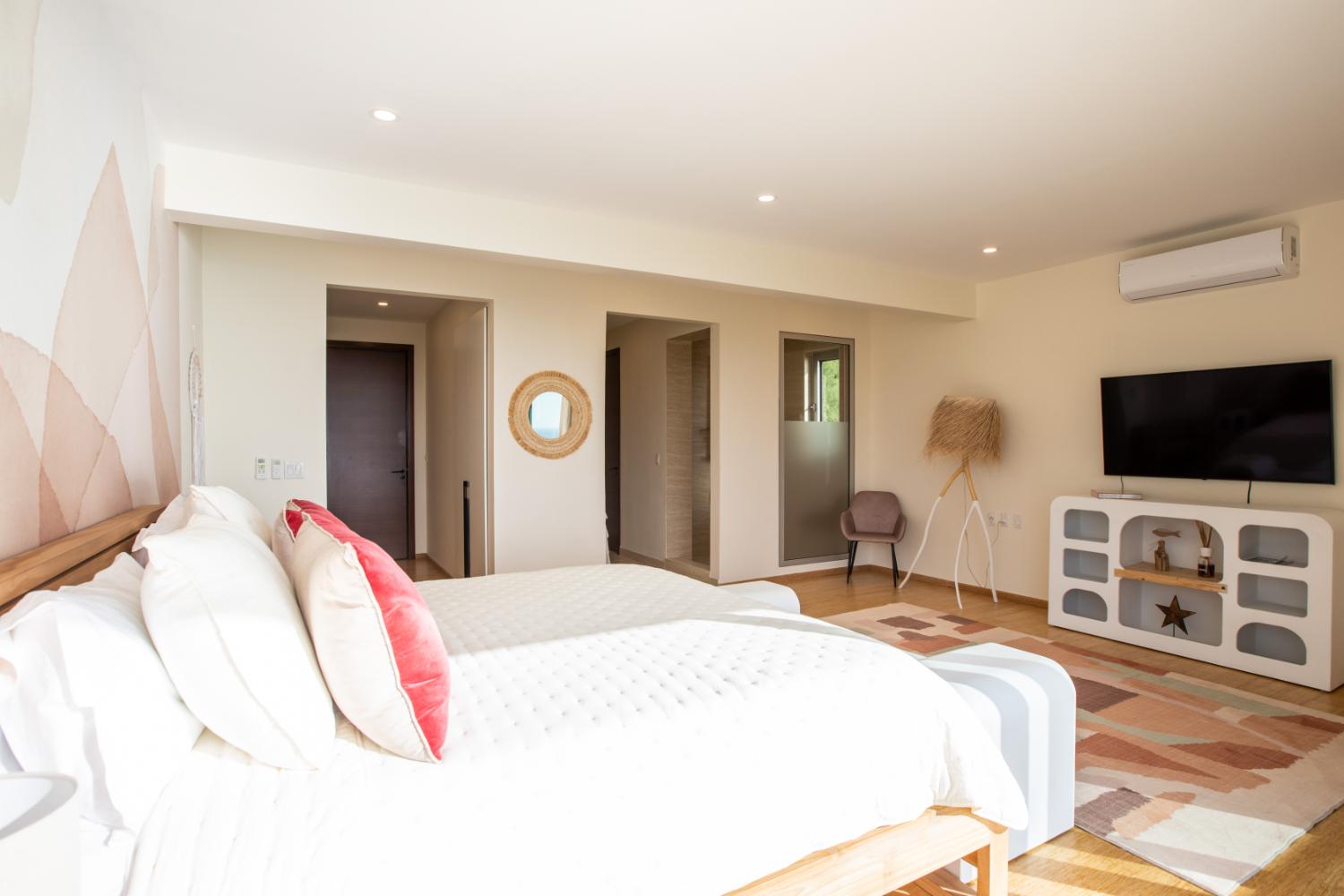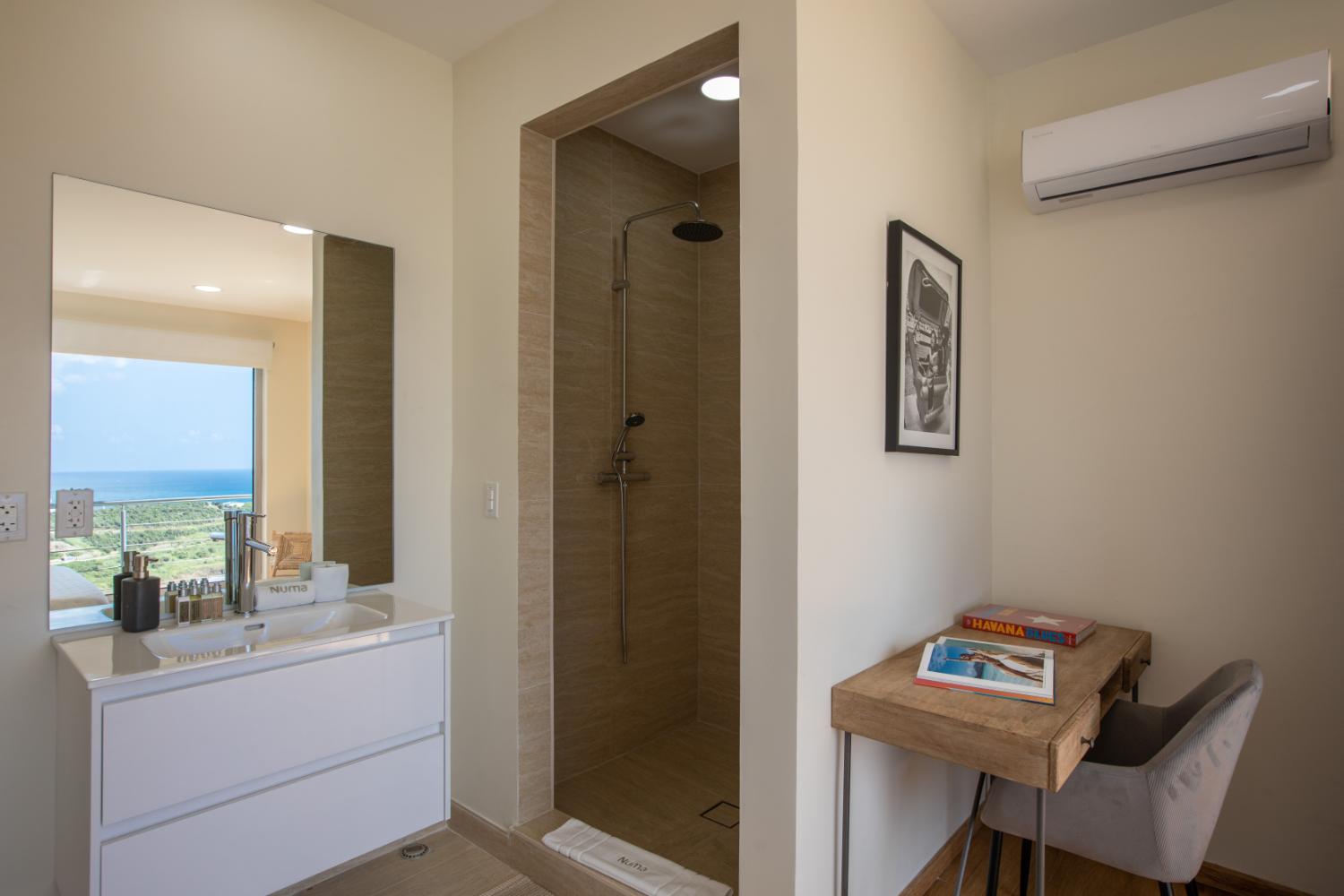 Villa Numa features six beautifully designed bedrooms, each offering unobstructed ocean views and its own private bathroom finished with elegant materials and thoughtful amenities. Four of the bedrooms sit on the entry level, connected by a bright hallway that ensures both privacy and easy access. Two additional suites are located on the second lower level and are reached via an exterior staircase, offering an added sense of independence. The sixth bedroom includes its own living room and kitchenette, an ideal arrangement for a nanny, extended family member, or guests seeking extra privacy during their stay.
