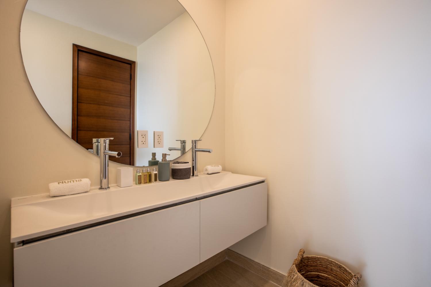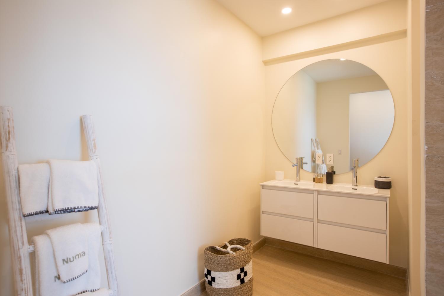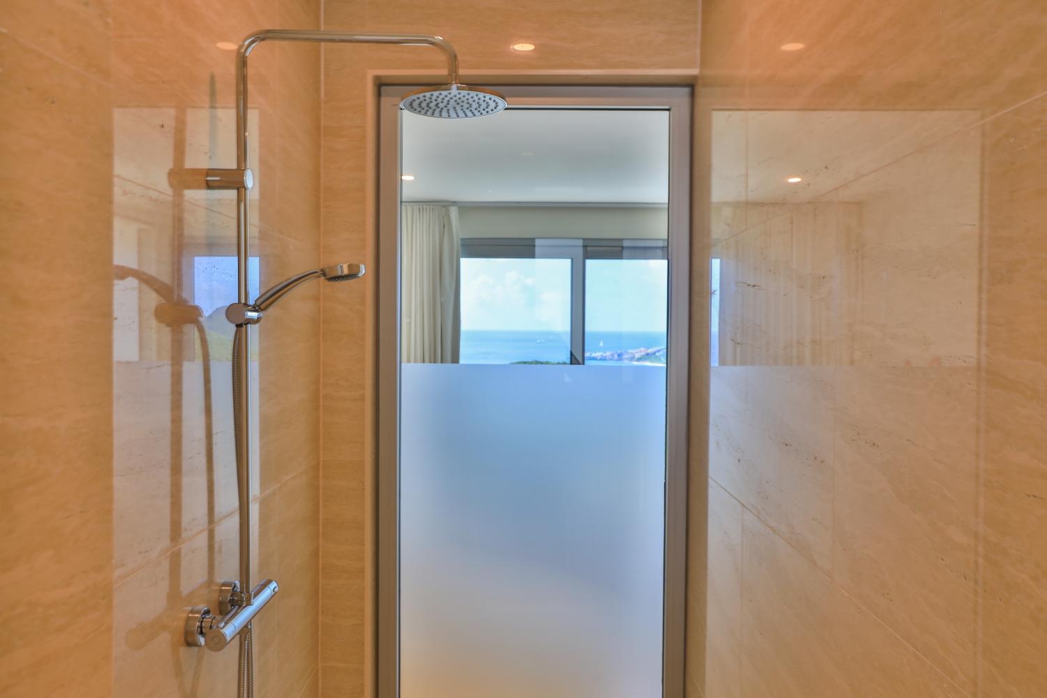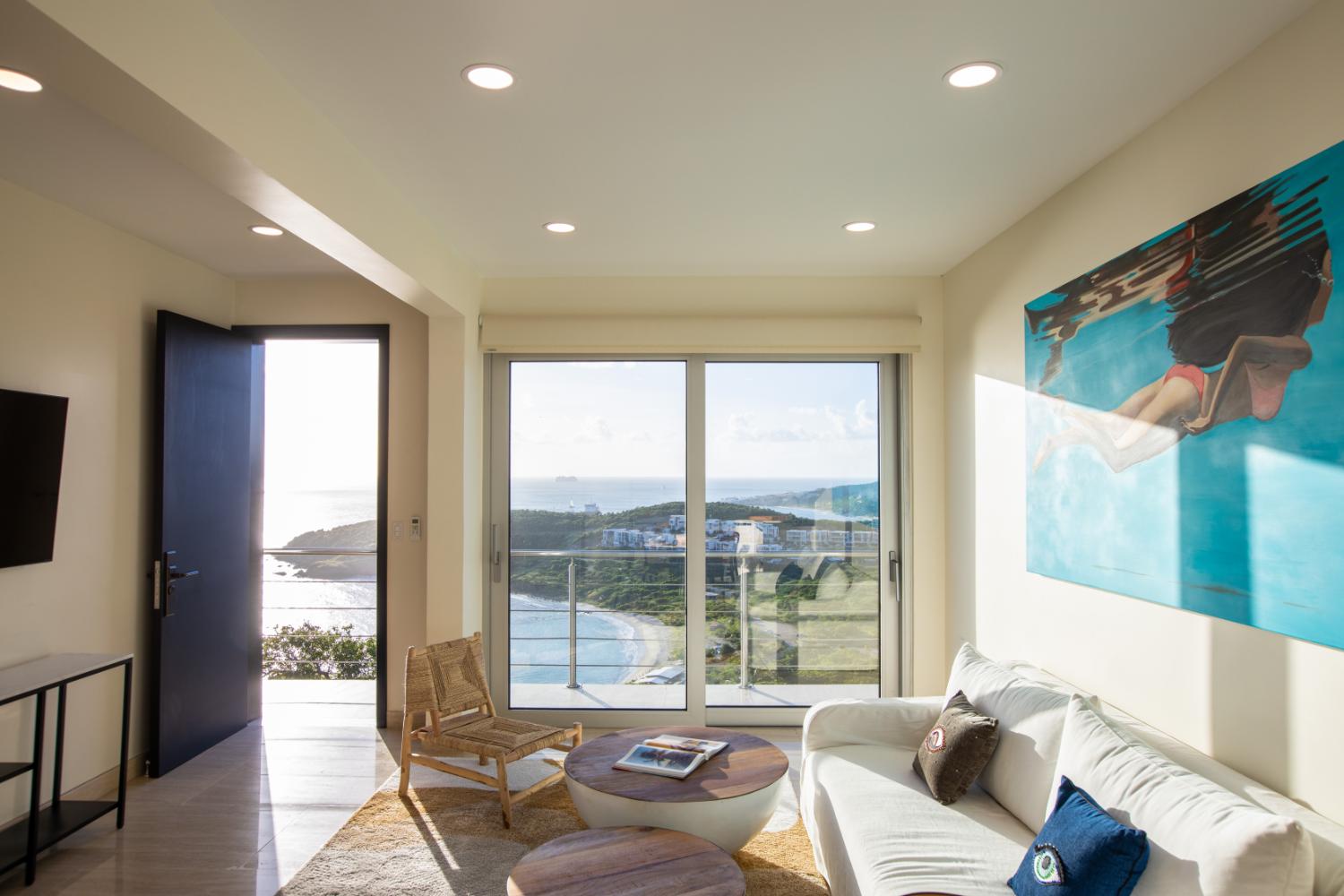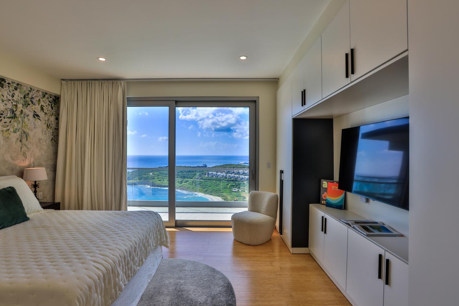 Villa Numa features six beautifully designed bedrooms, each offering unobstructed ocean views and its own private bathroom finished with elegant materials and thoughtful amenities. Four of the bedrooms sit on the entry level, connected by a bright hallway that ensures both privacy and easy access. Two additional suites are located on the second lower level and are reached via an exterior staircase, offering an added sense of independence. The sixth bedroom includes its own living room and kitchenette, an ideal arrangement for a nanny, extended family member, or guests seeking extra privacy during their stay.