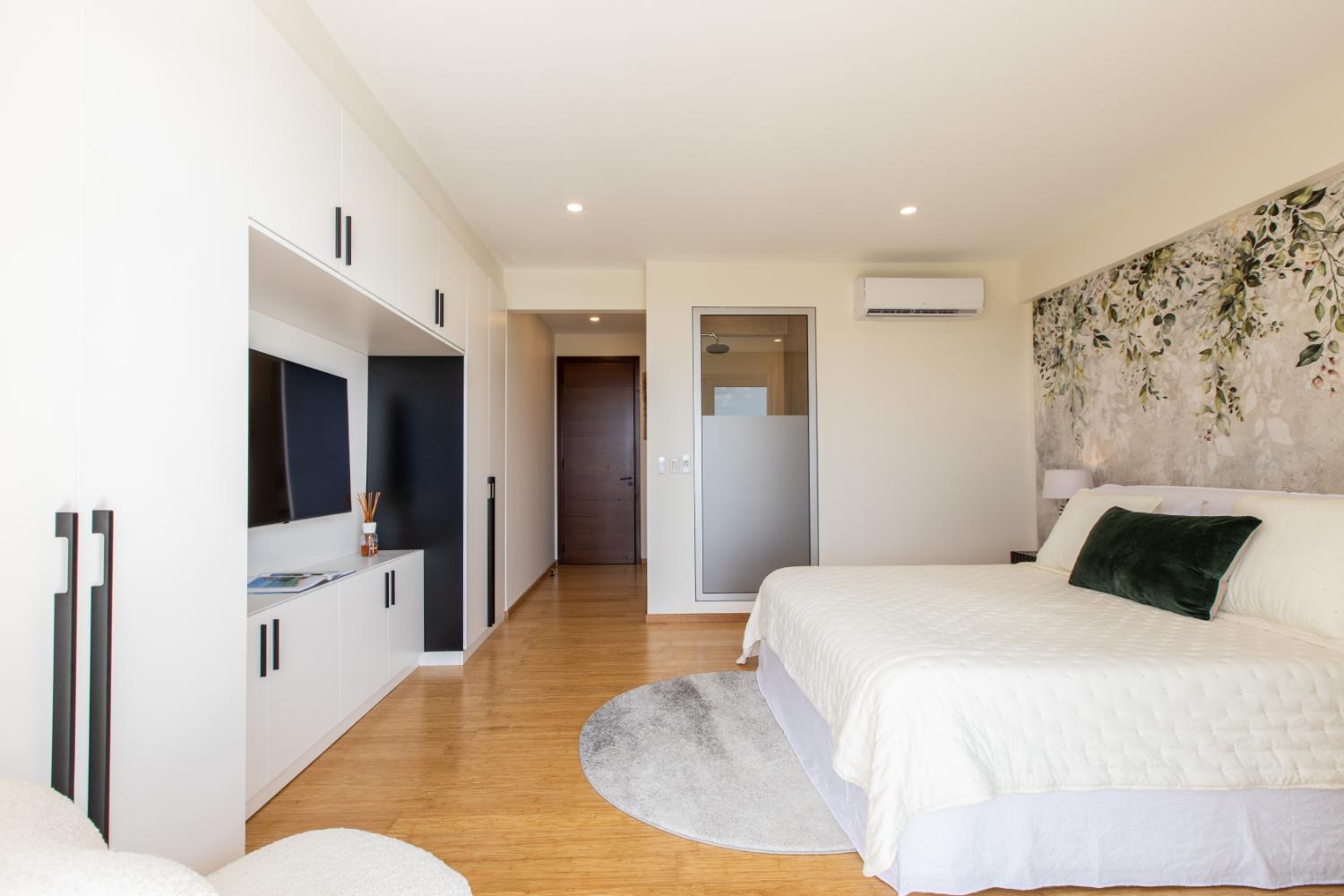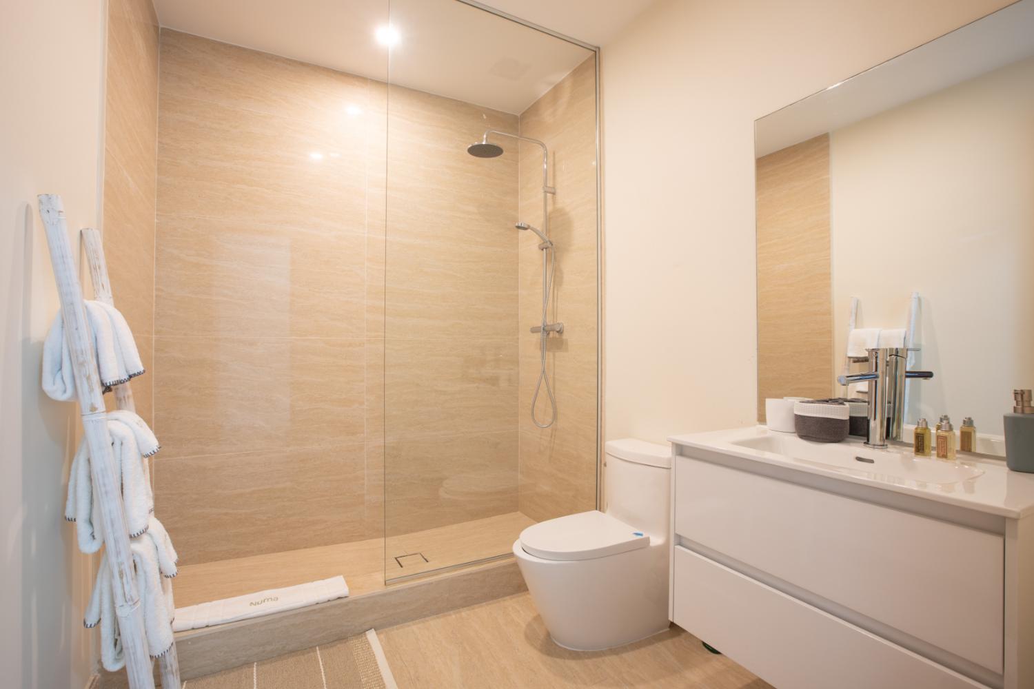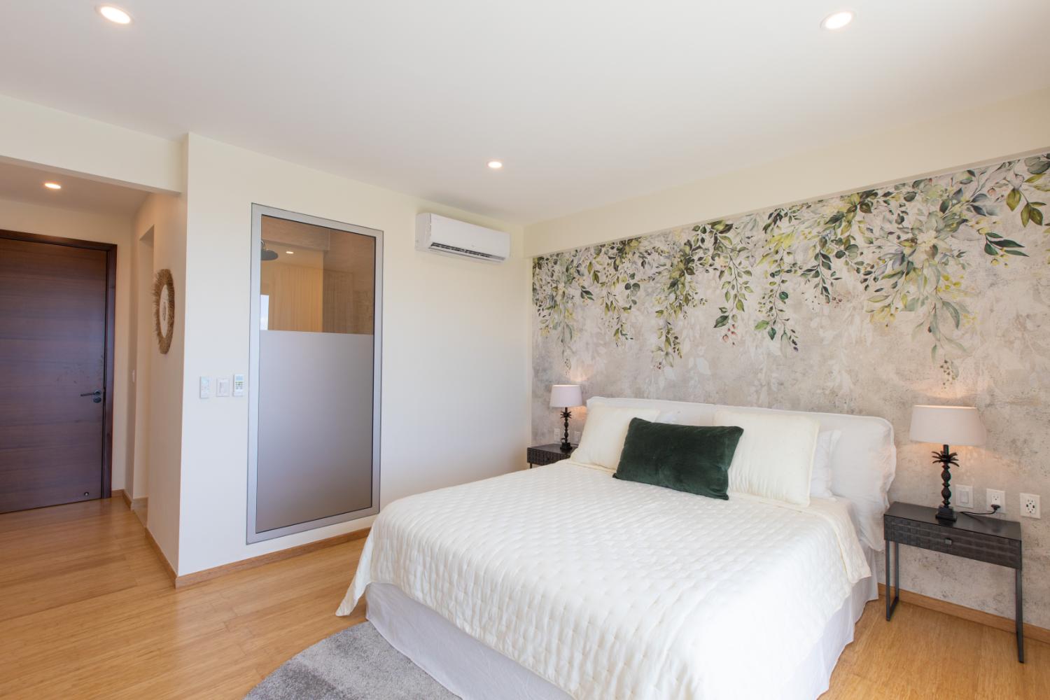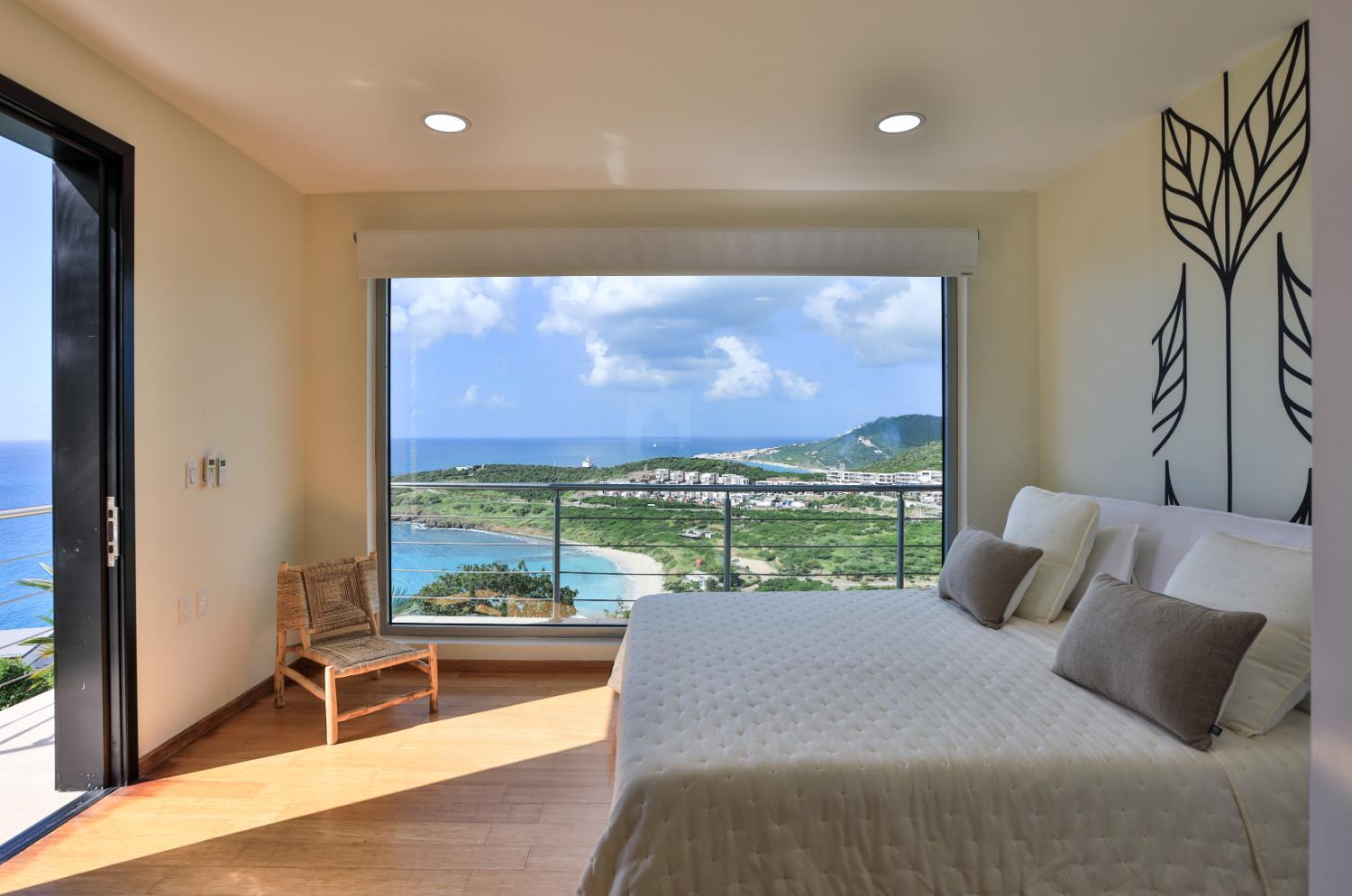 Villa Numa features six beautifully designed bedrooms, each offering unobstructed ocean views and its own private bathroom finished with elegant materials and thoughtful amenities. Four of the bedrooms sit on the entry level, connected by a bright hallway that ensures both privacy and easy access. Two additional suites are located on the second lower level and are reached via an exterior staircase, offering an added sense of independence. The sixth bedroom includes its own living room and kitchenette, an ideal arrangement for a nanny, extended family member, or guests seeking extra privacy during their stay.