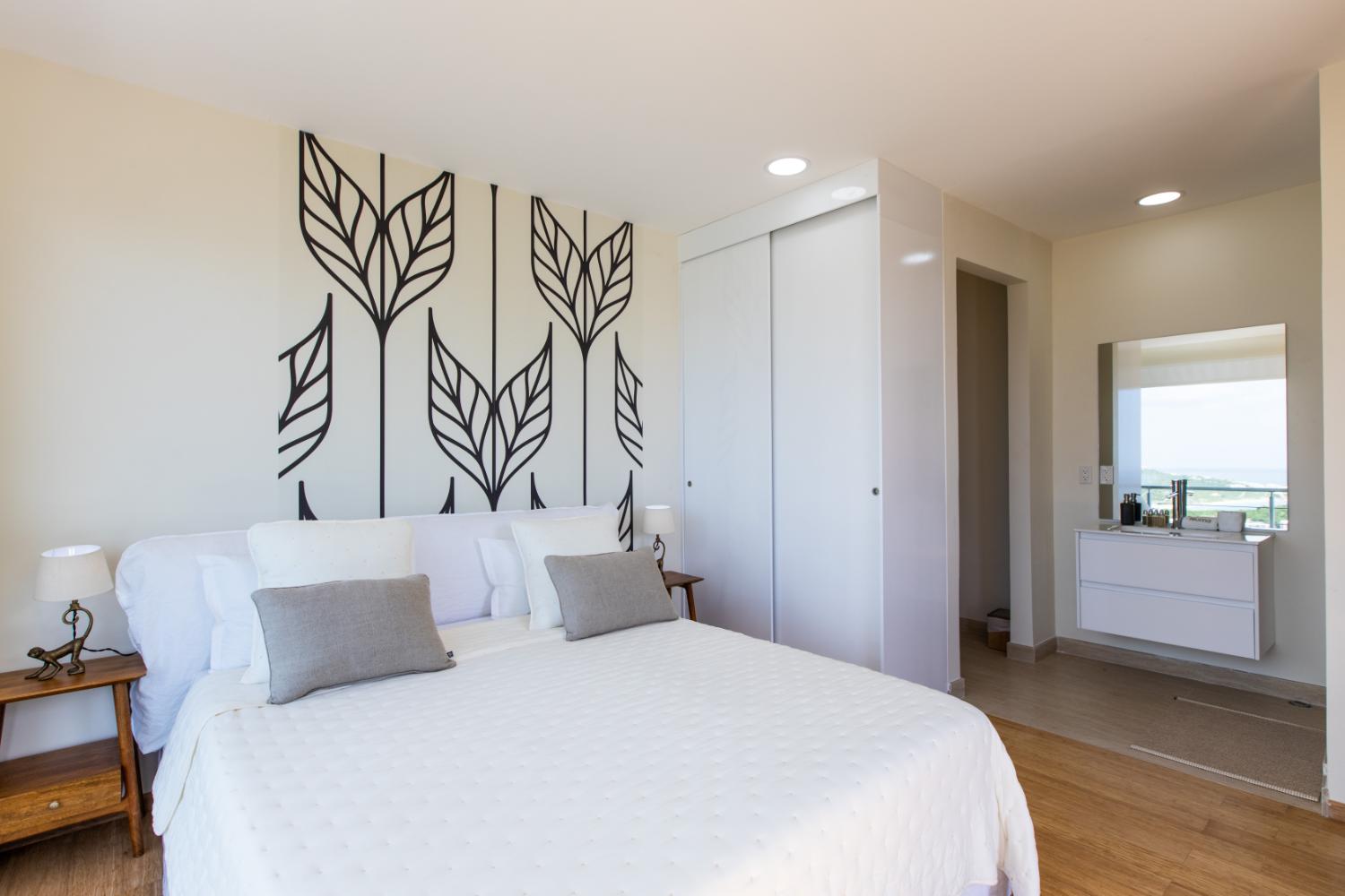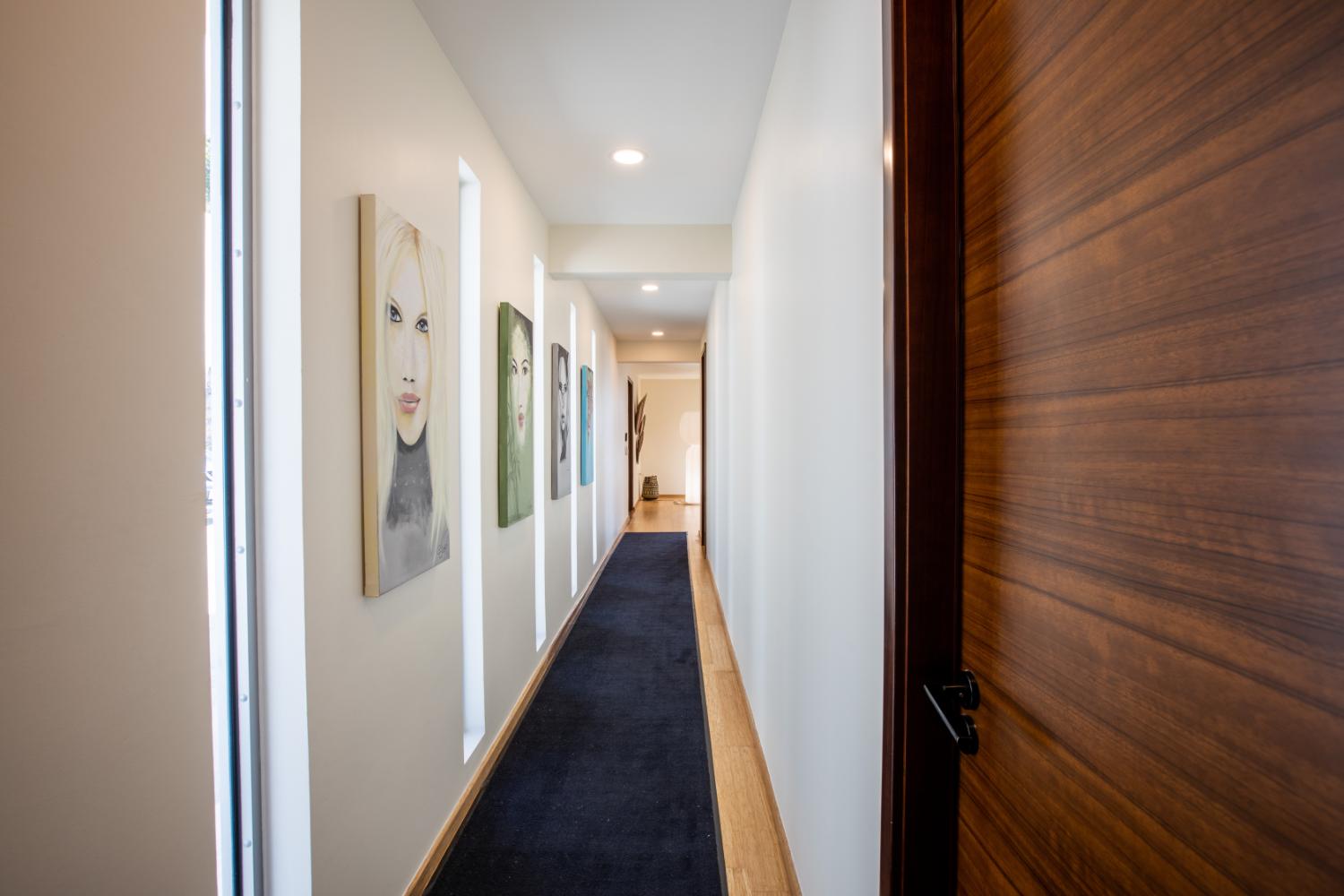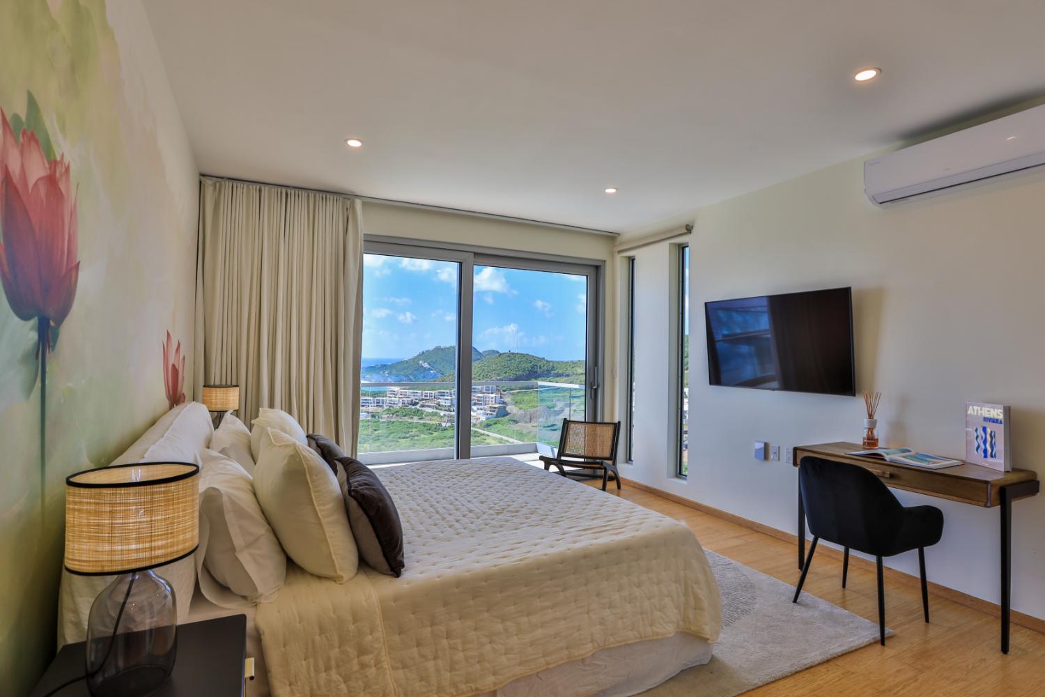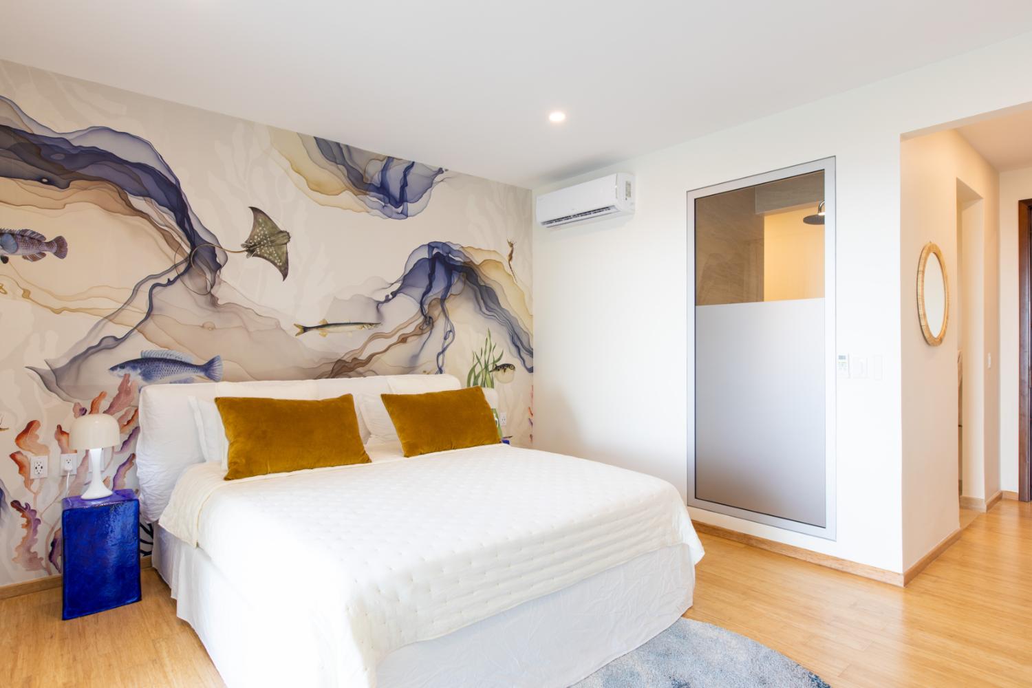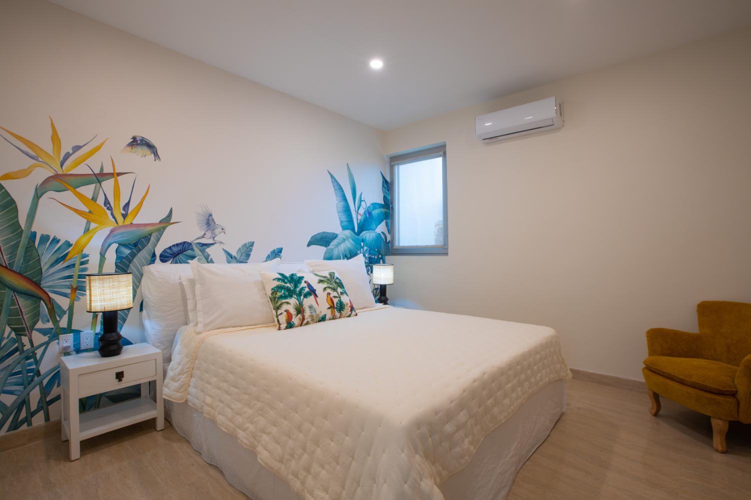 Villa Numa features six beautifully designed bedrooms, each offering unobstructed ocean views and its own private bathroom finished with elegant materials and thoughtful amenities. Four of the bedrooms sit on the entry level, connected by a bright hallway that ensures both privacy and easy access. Two additional suites are located on the second lower level and are reached via an exterior staircase, offering an added sense of independence. The sixth bedroom includes its own living room and kitchenette, an ideal arrangement for a nanny, extended family member, or guests seeking extra privacy during their stay.