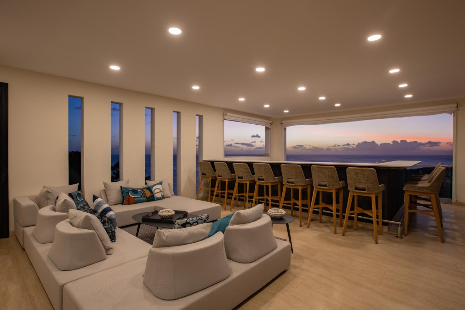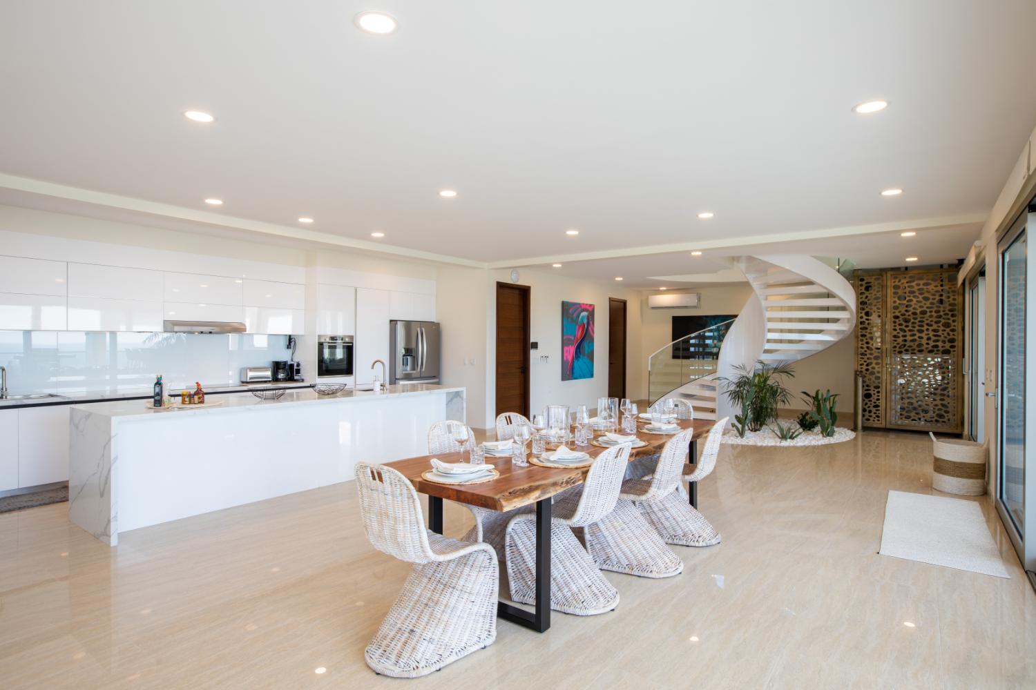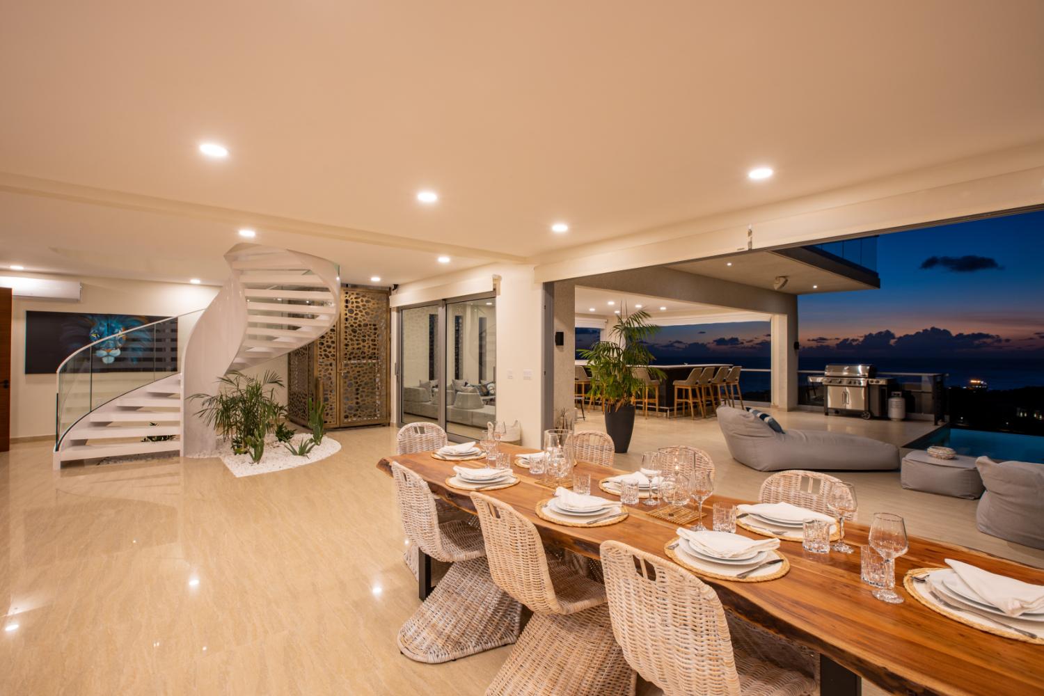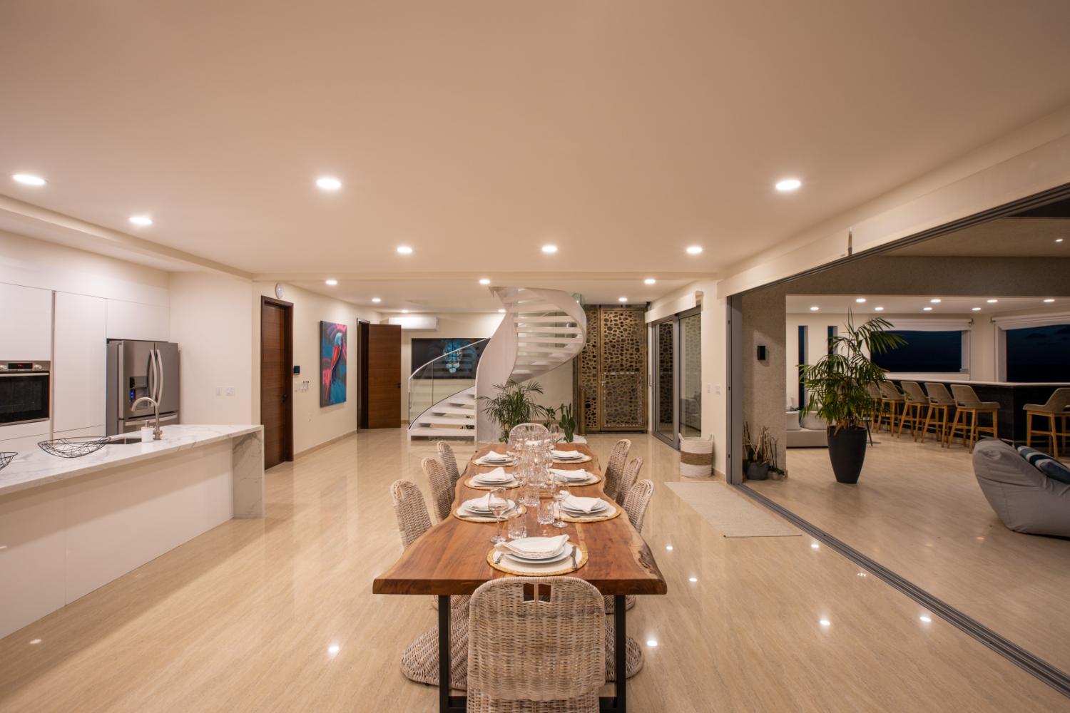 Entering Villa Numa on the main level, guests are welcomed by an impressive lobby where a sculptural spiral staircase and a private elevator set the tone for the elegant design throughout the home. The architecture thoughtfully guides you downward to the main living level, where an expansive, air-conditioned living and kitchen space becomes the heart of the villa. This open-plan area is designed for gathering, conversation, and effortless indoor-outdoor living. Large glass openings reveal the infinity pool terrace, where the water seems to melt into the horizon and the curve of Indigo Bay stretches below.