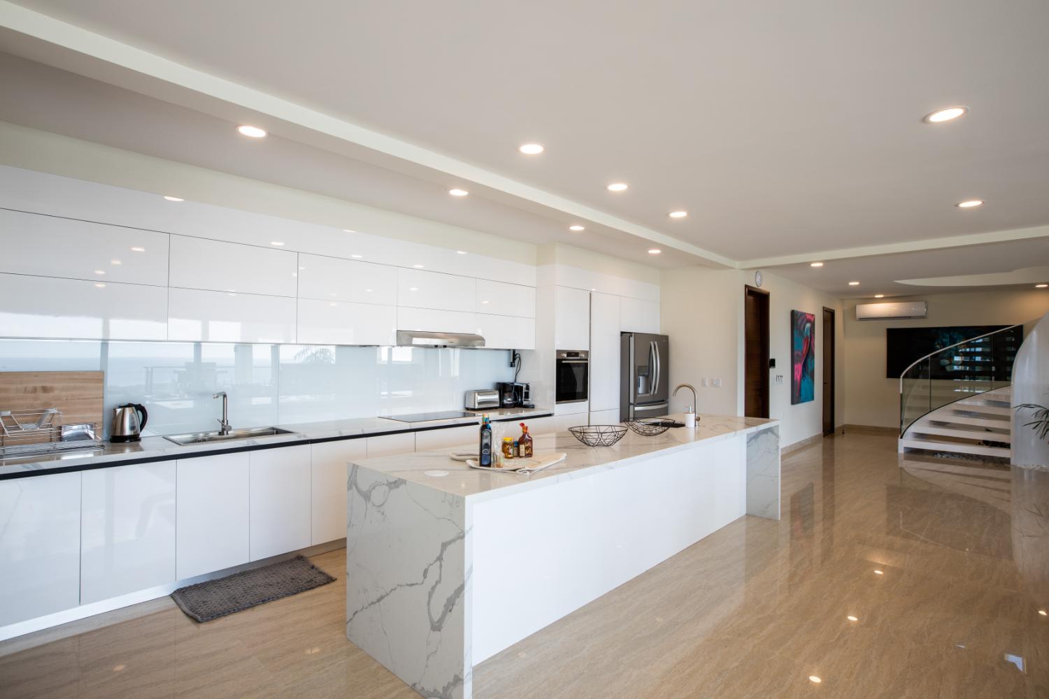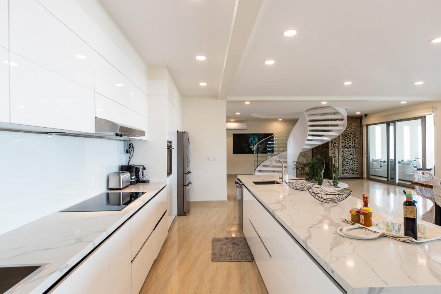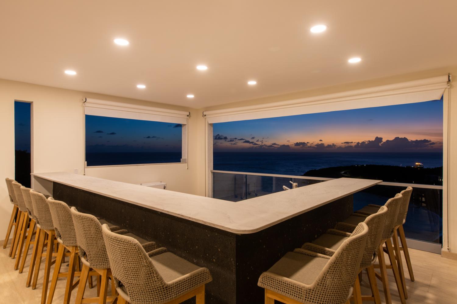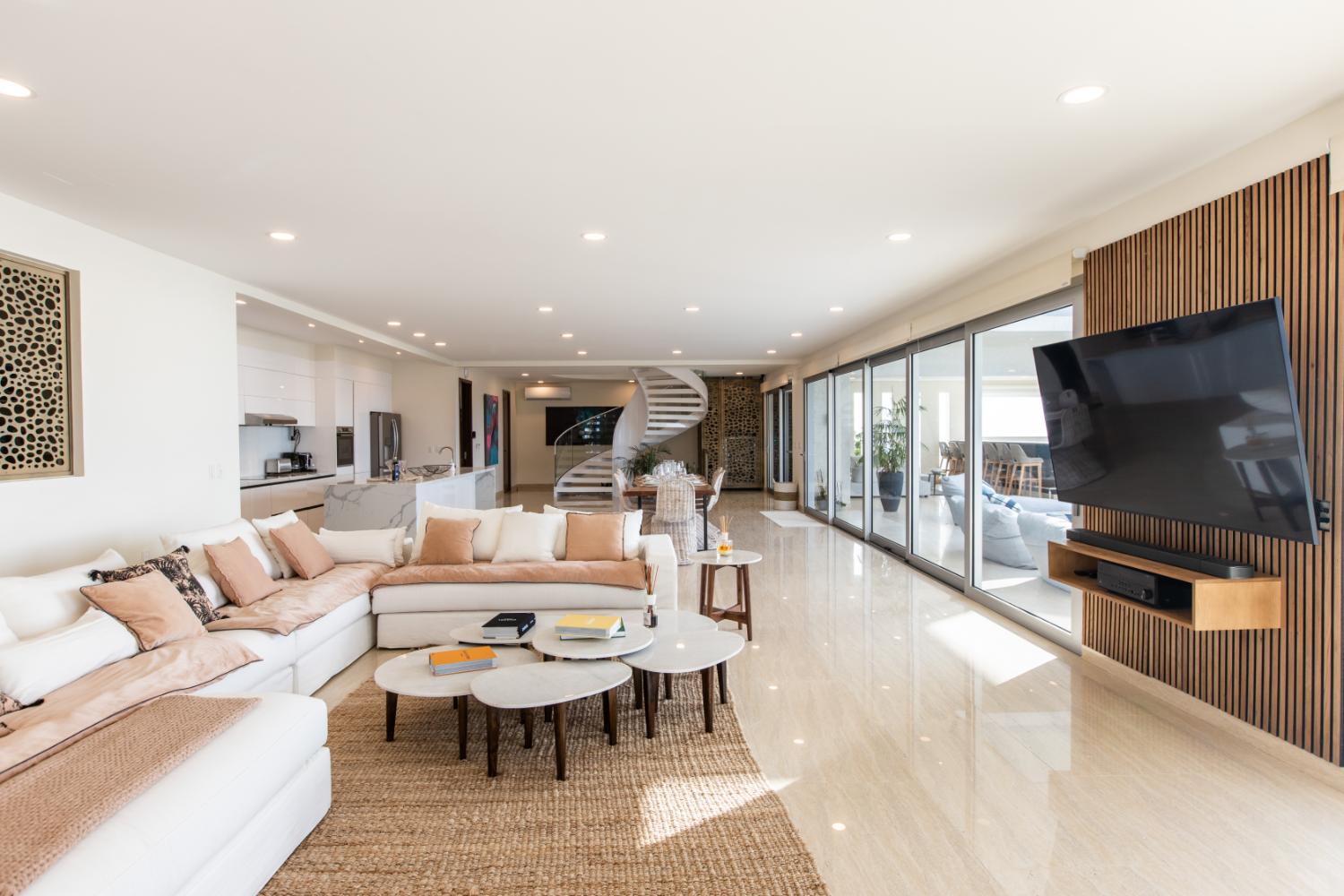 Entering Villa Numa on the main level, guests are welcomed by an impressive lobby where a sculptural spiral staircase and a private elevator set the tone for the elegant design throughout the home. The architecture thoughtfully guides you downward to the main living level, where an expansive, air-conditioned living and kitchen space becomes the heart of the villa. This open-plan area is designed for gathering, conversation, and effortless indoor-outdoor living. Large glass openings reveal the infinity pool terrace, where the water seems to melt into the horizon and the curve of Indigo Bay stretches below.