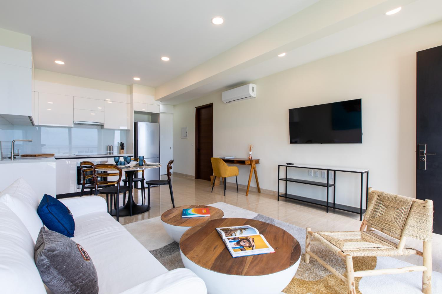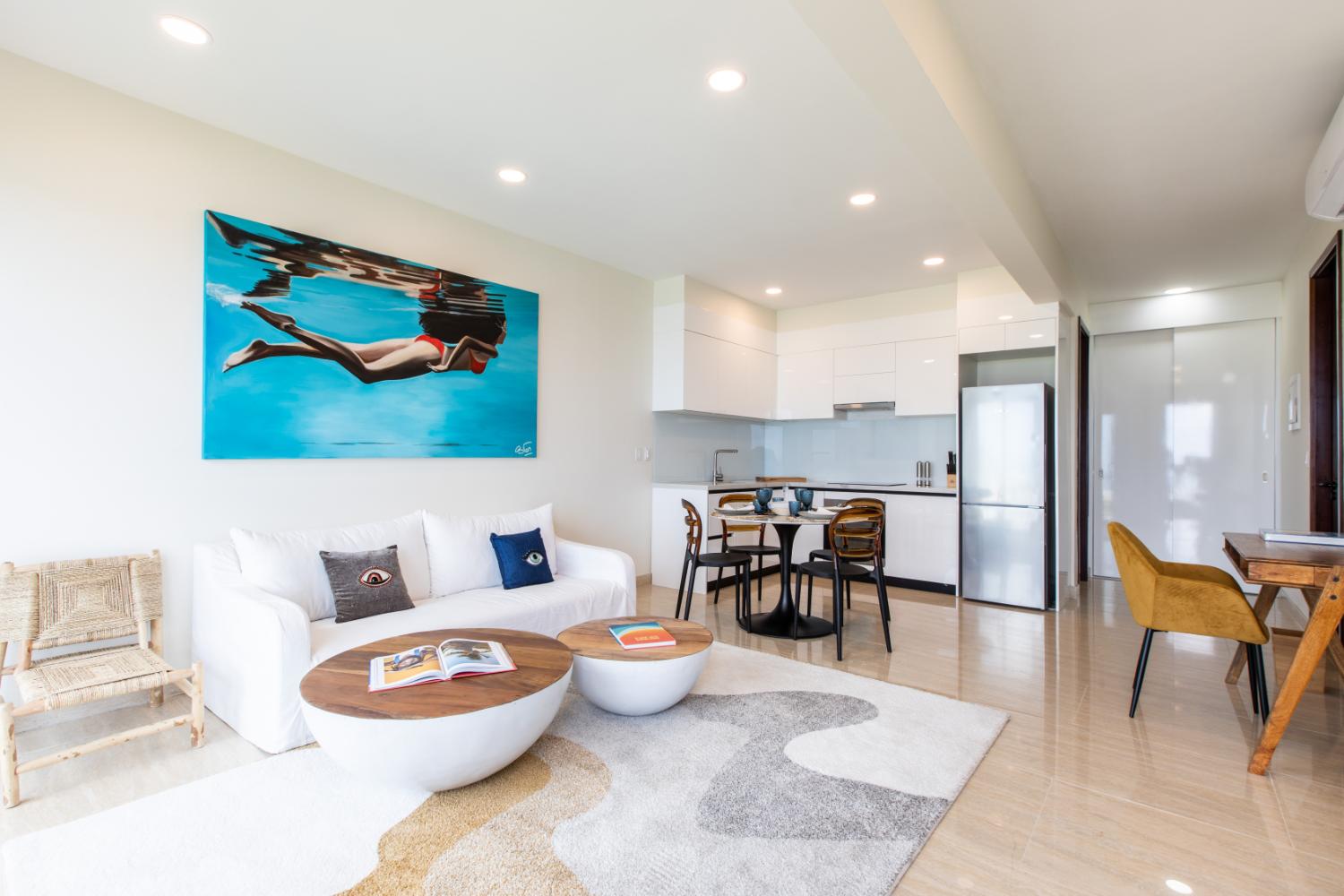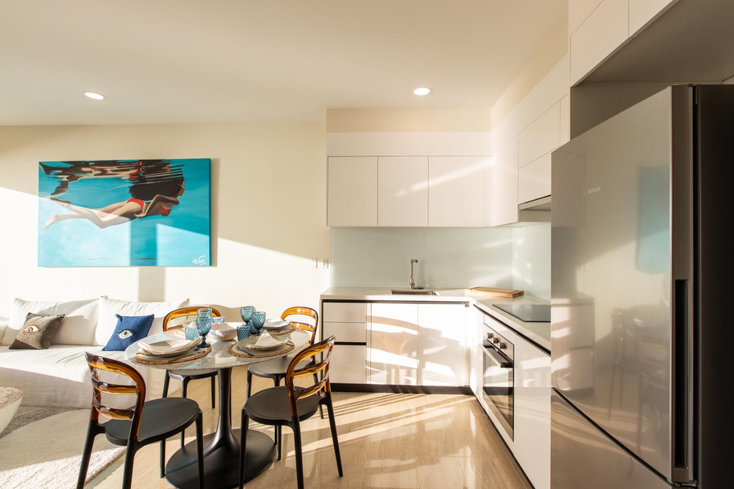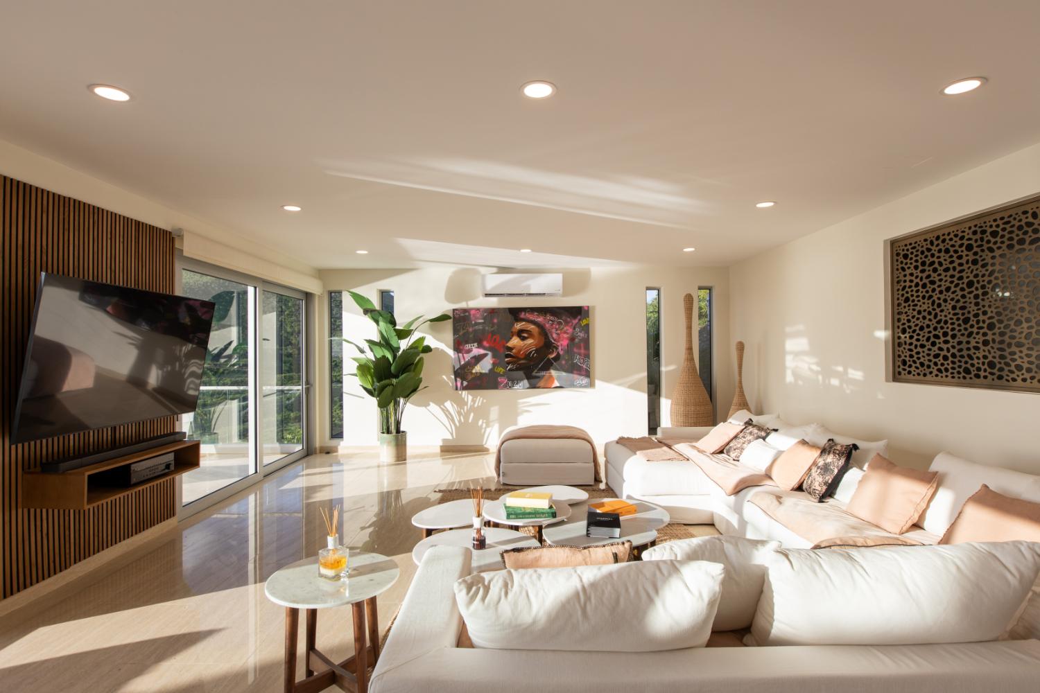 Entering Villa Numa on the main level, guests are welcomed by an impressive lobby where a sculptural spiral staircase and a private elevator set the tone for the elegant design throughout the home. The architecture thoughtfully guides you downward to the main living level, where an expansive, air-conditioned living and kitchen space becomes the heart of the villa. This open-plan area is designed for gathering, conversation, and effortless indoor-outdoor living. Large glass openings reveal the infinity pool terrace, where the water seems to melt into the horizon and the curve of Indigo Bay stretches below.