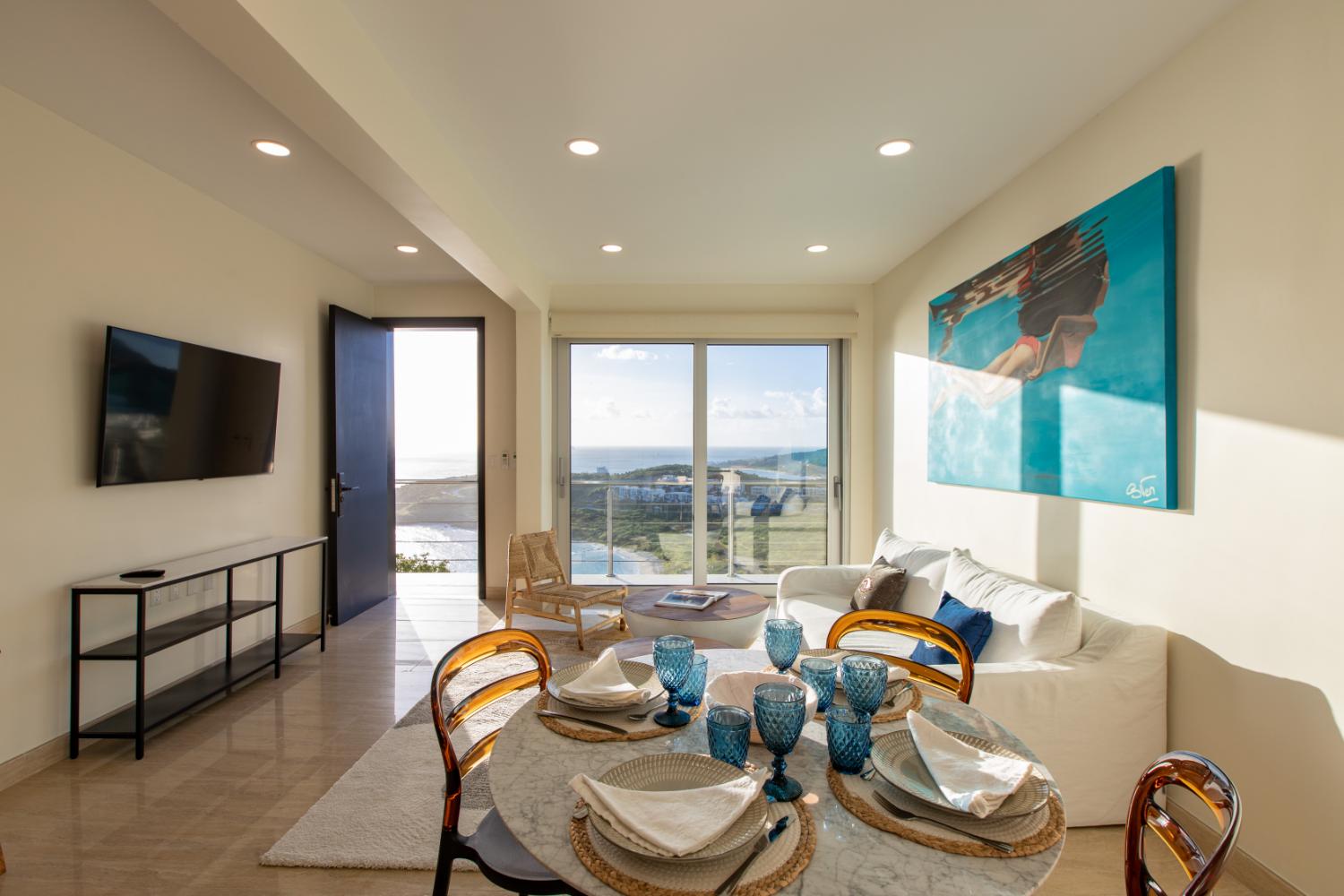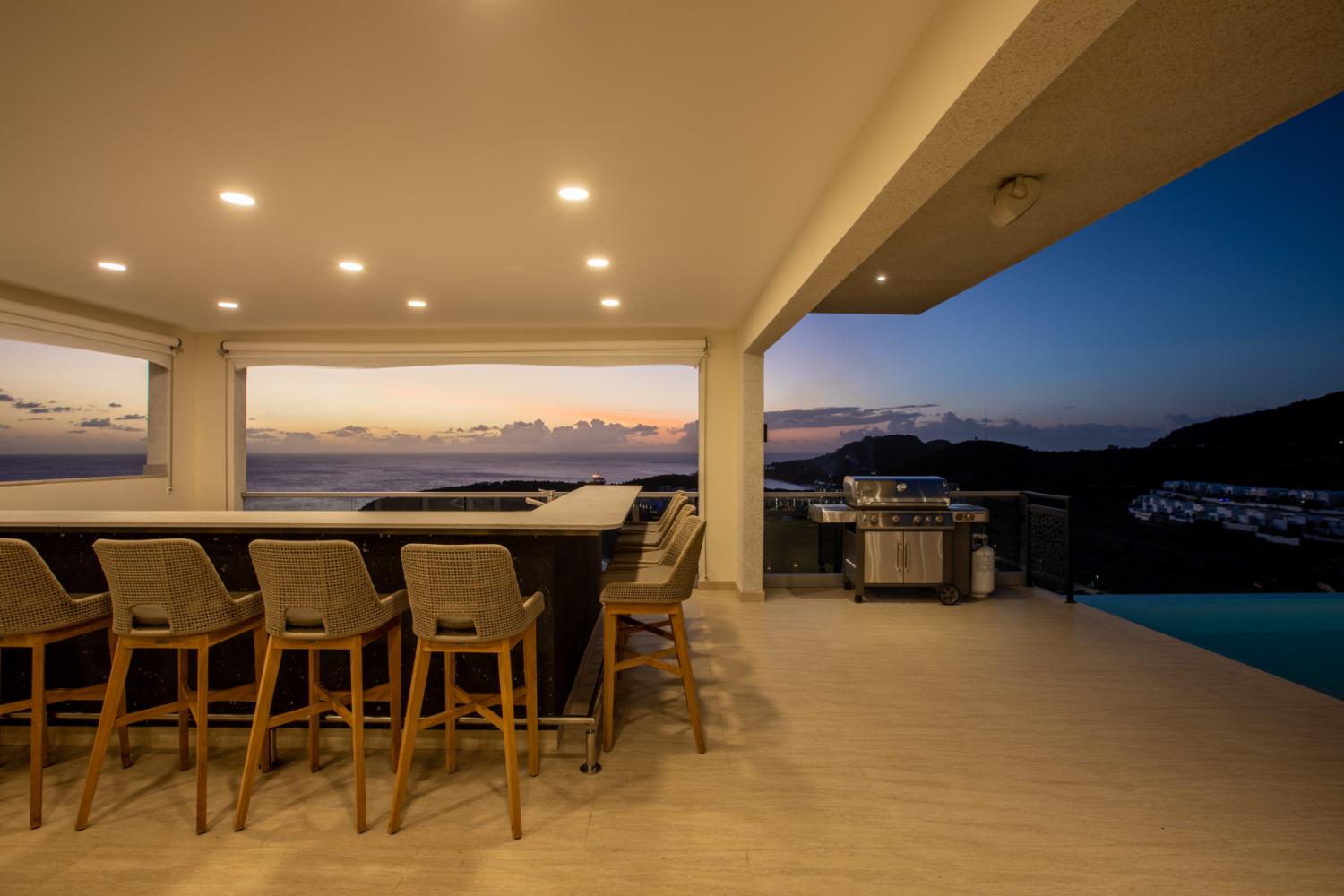 Outside, the terrace becomes the natural focal point of the day. Comfortable lounge seating creates a relaxed atmosphere for quiet mornings or sunset cocktails, while the fully equipped outdoor kitchen and bar make entertaining feel effortless. Guests often find themselves lingering here long after sunset, watching cruise ships glide across the horizon while the hillside villas begin to sparkle with lights.