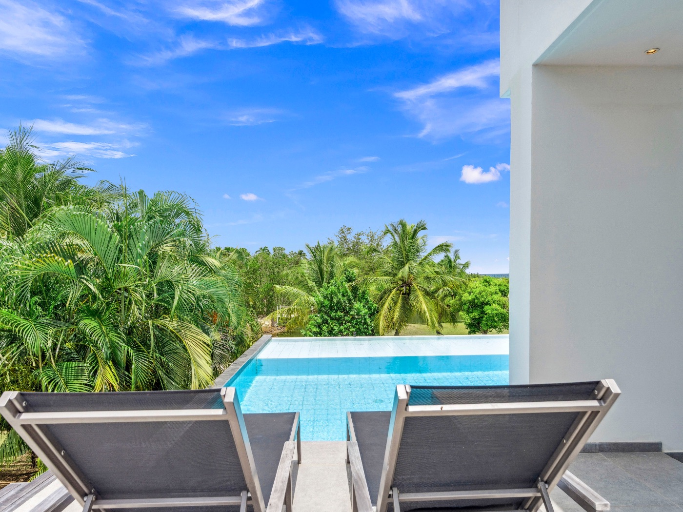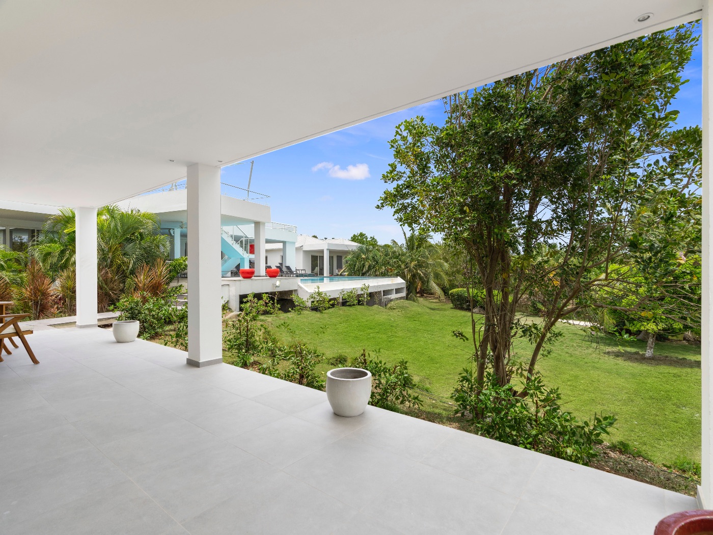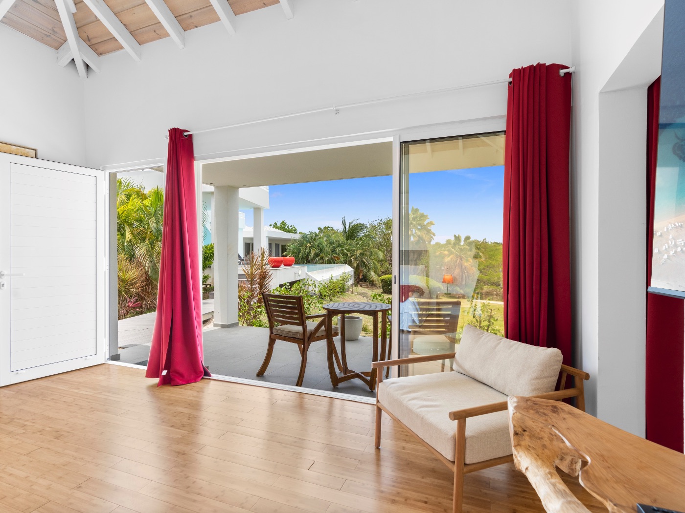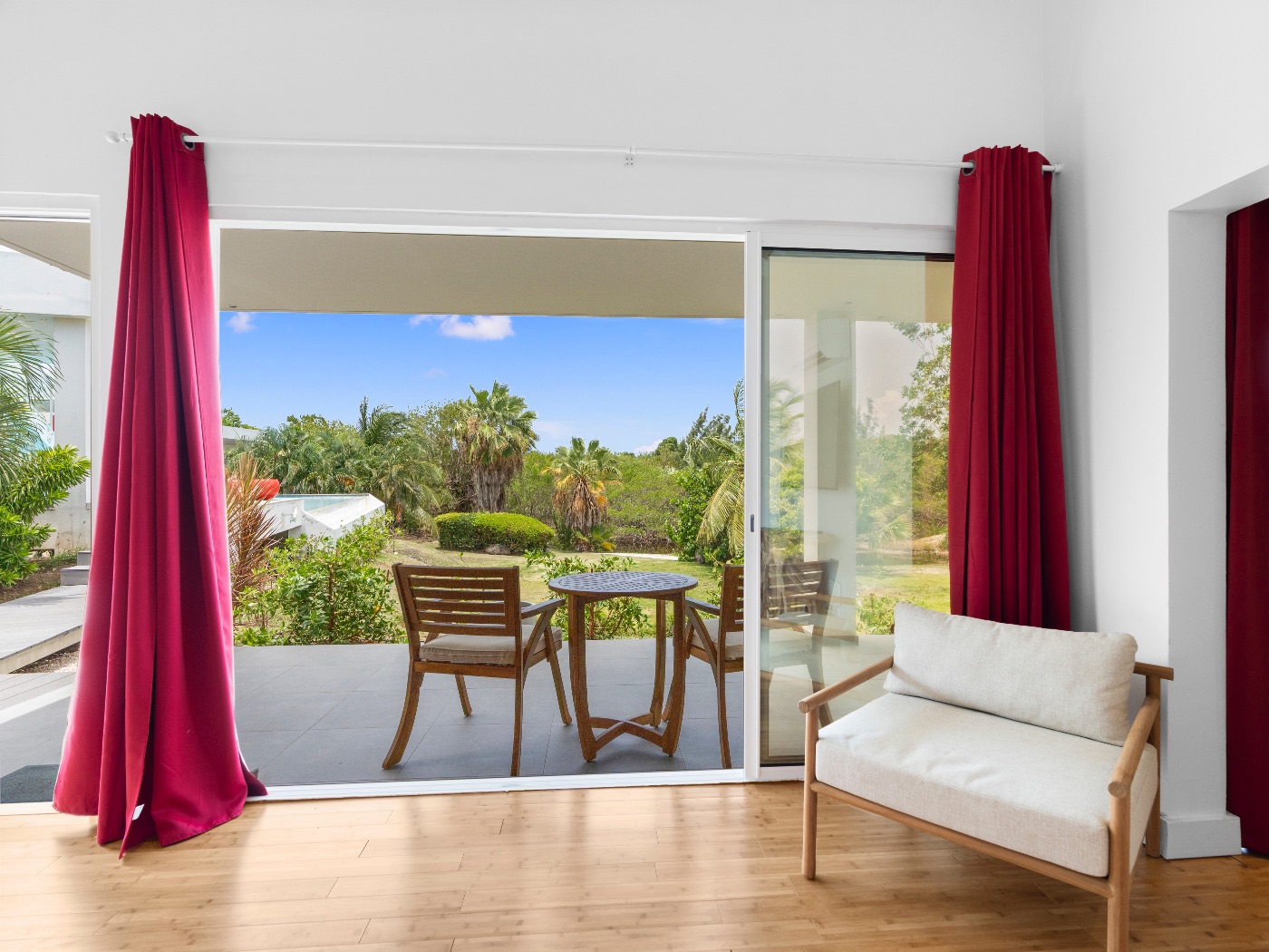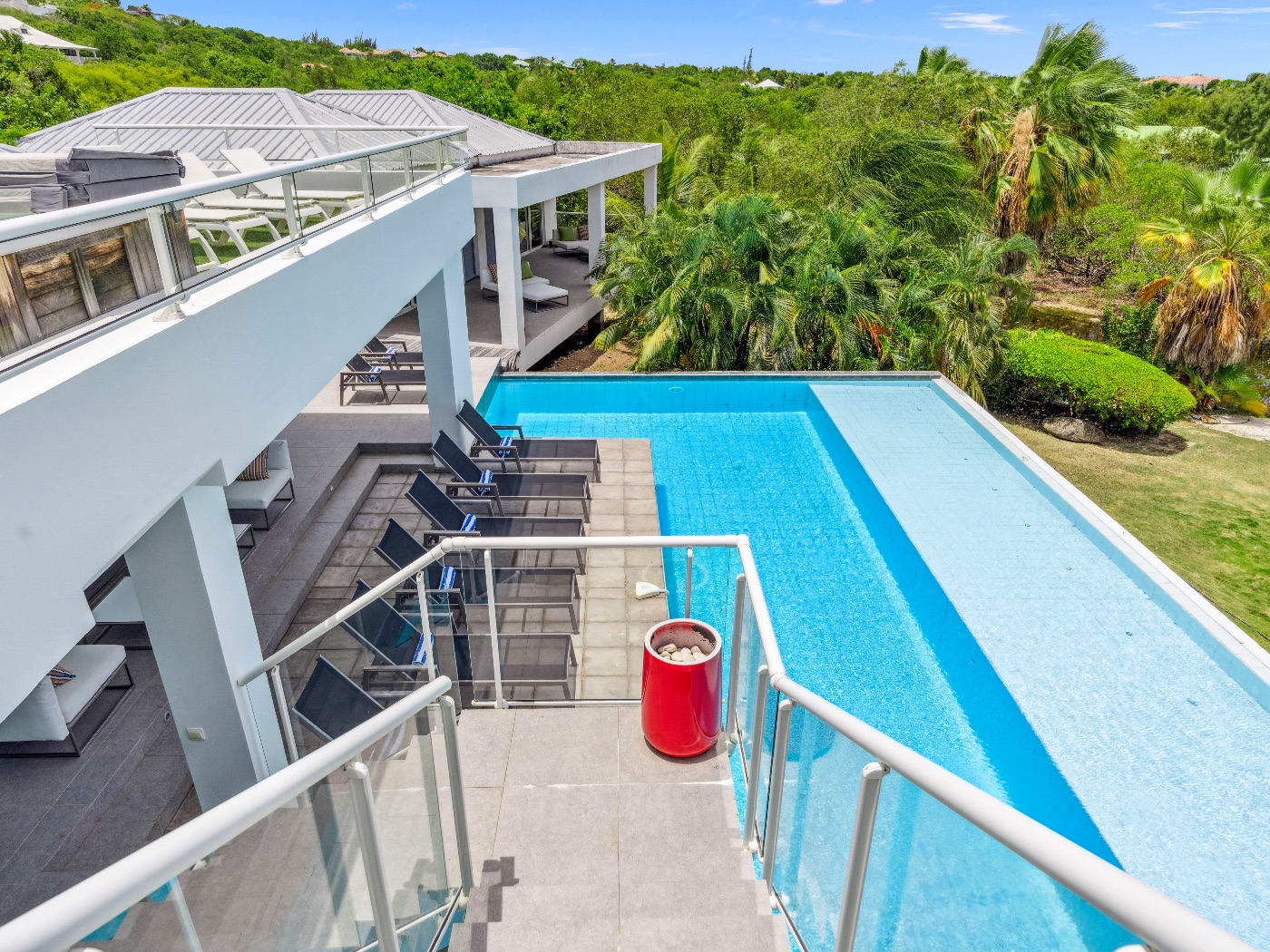 Set within a lush palm-filled garden in the prestigious Lowlands of Terres Basses, this sleek contemporary villa offers rare serenity just moments from the beach. Clean architectural lines draw the eye toward calming ocean views framed by vibrant tropical foliage. The atmosphere is effortlessly peaceful — a space designed to unwind with a book, a glass of champagne, and the rhythm of island life.