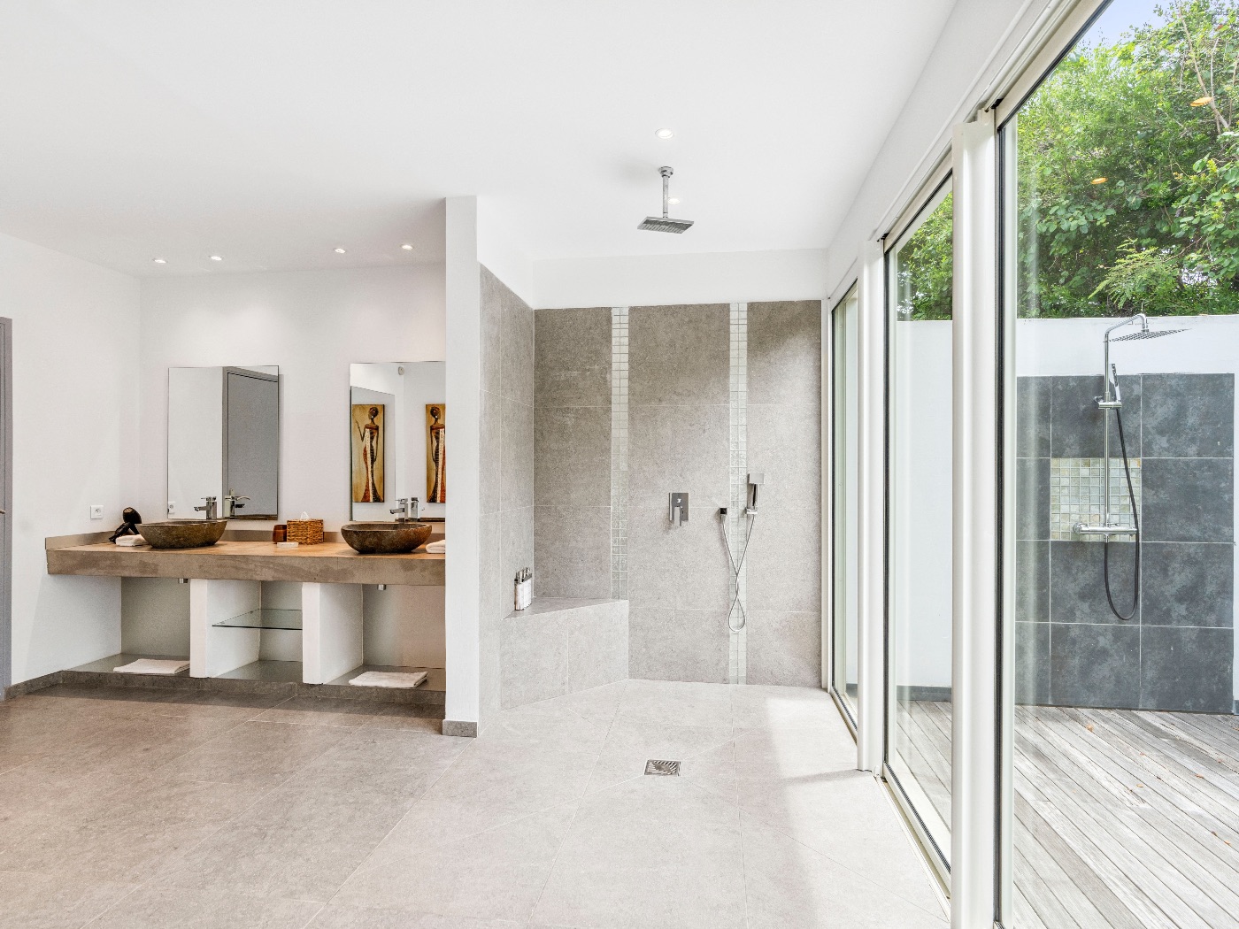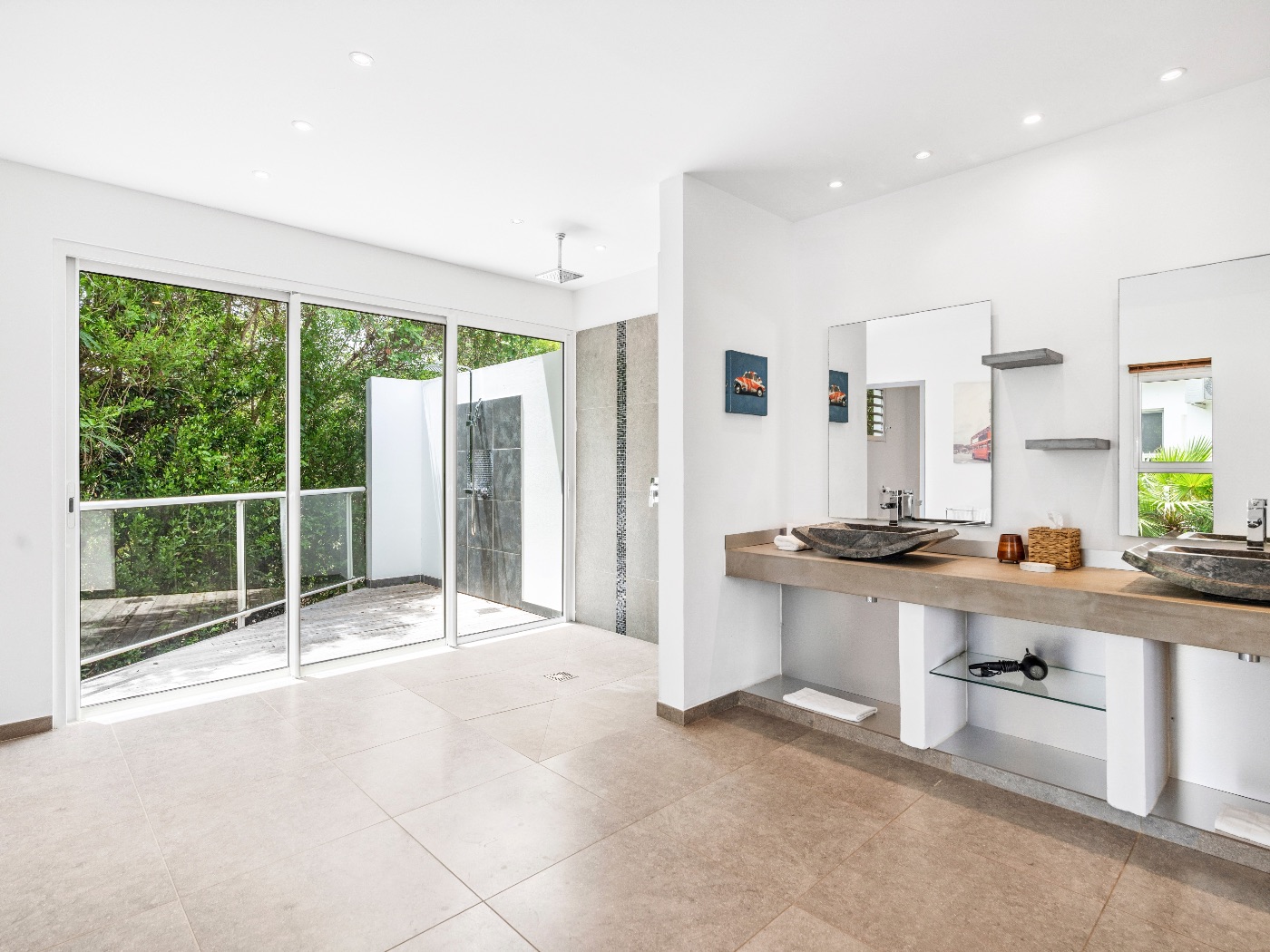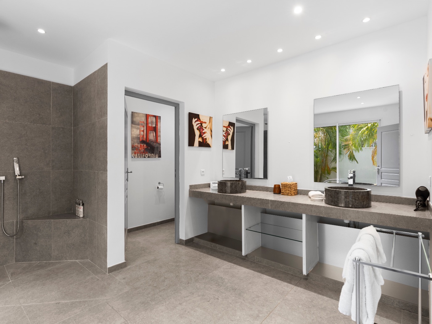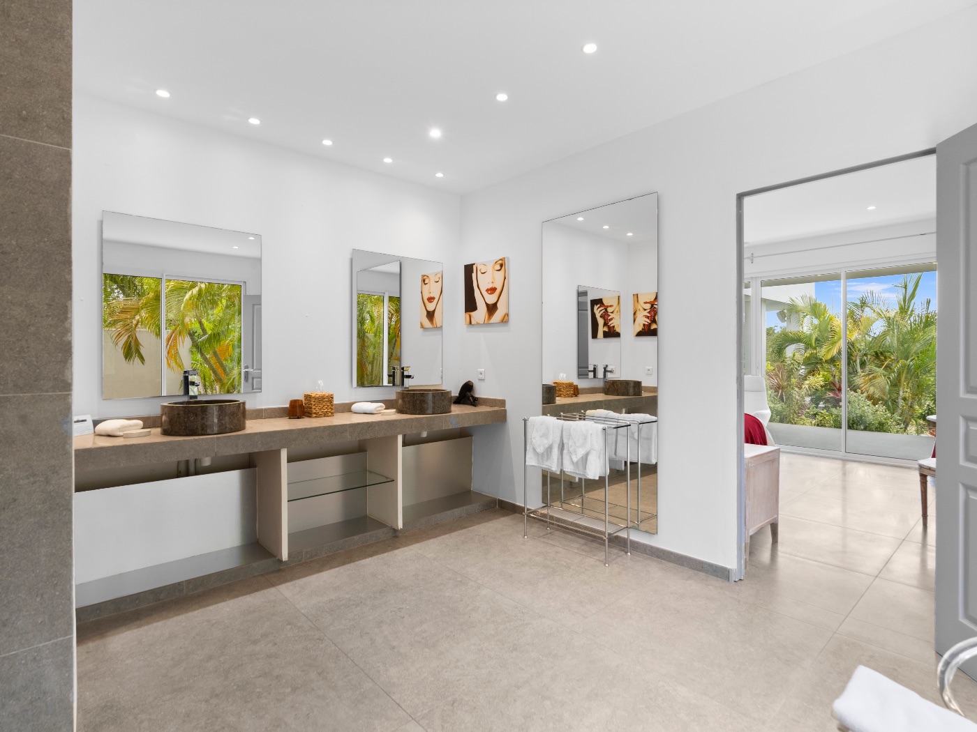 The oversized bathrooms include both indoor and outdoor showers opening onto private garden views. One bedroom is located off the main villa, while two are set within a separate casita — offering flexibility and privacy for multi-couple or family stays.