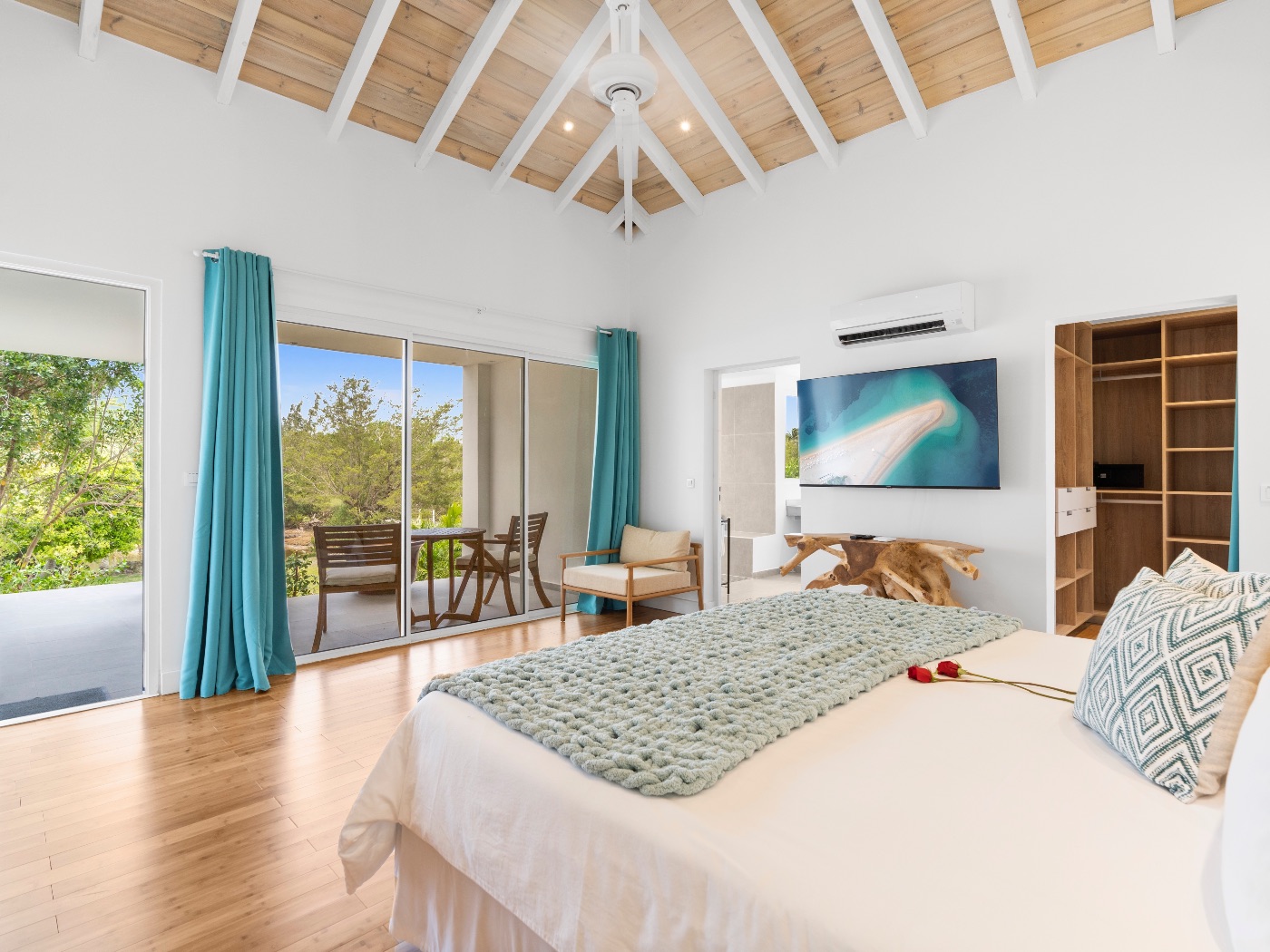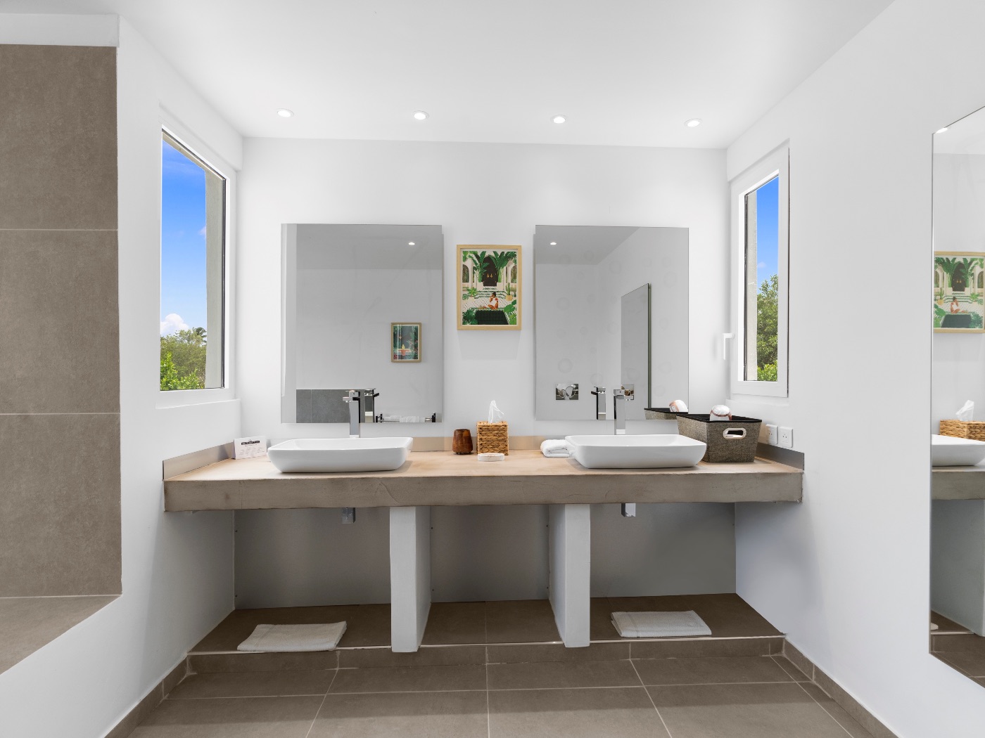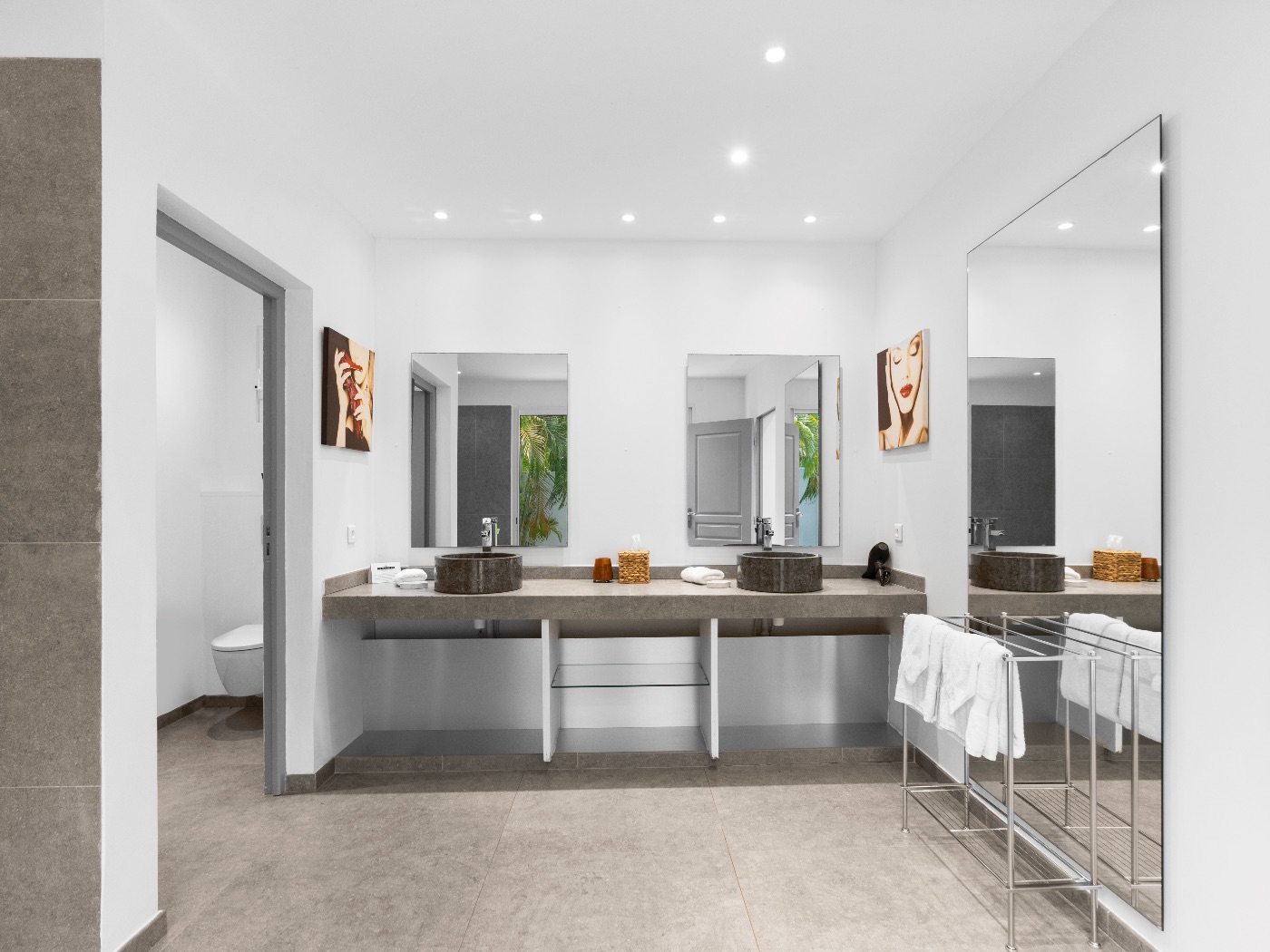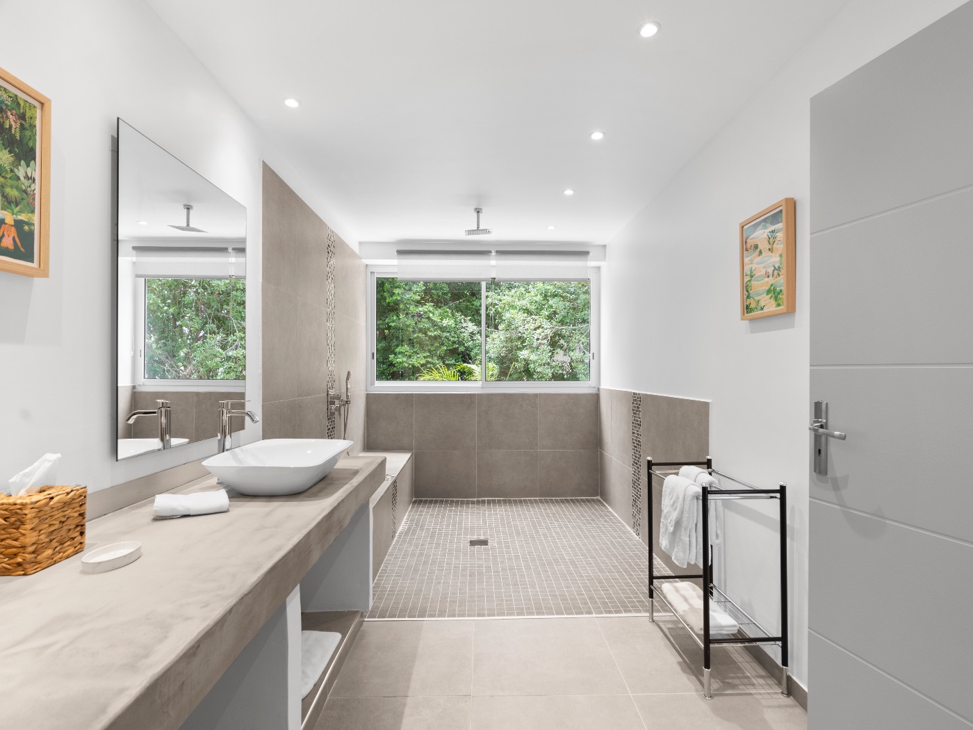 The oversized bathrooms include both indoor and outdoor showers opening onto private garden views. One bedroom is located off the main villa, while two are set within a separate casita — offering flexibility and privacy for multi-couple or family stays.