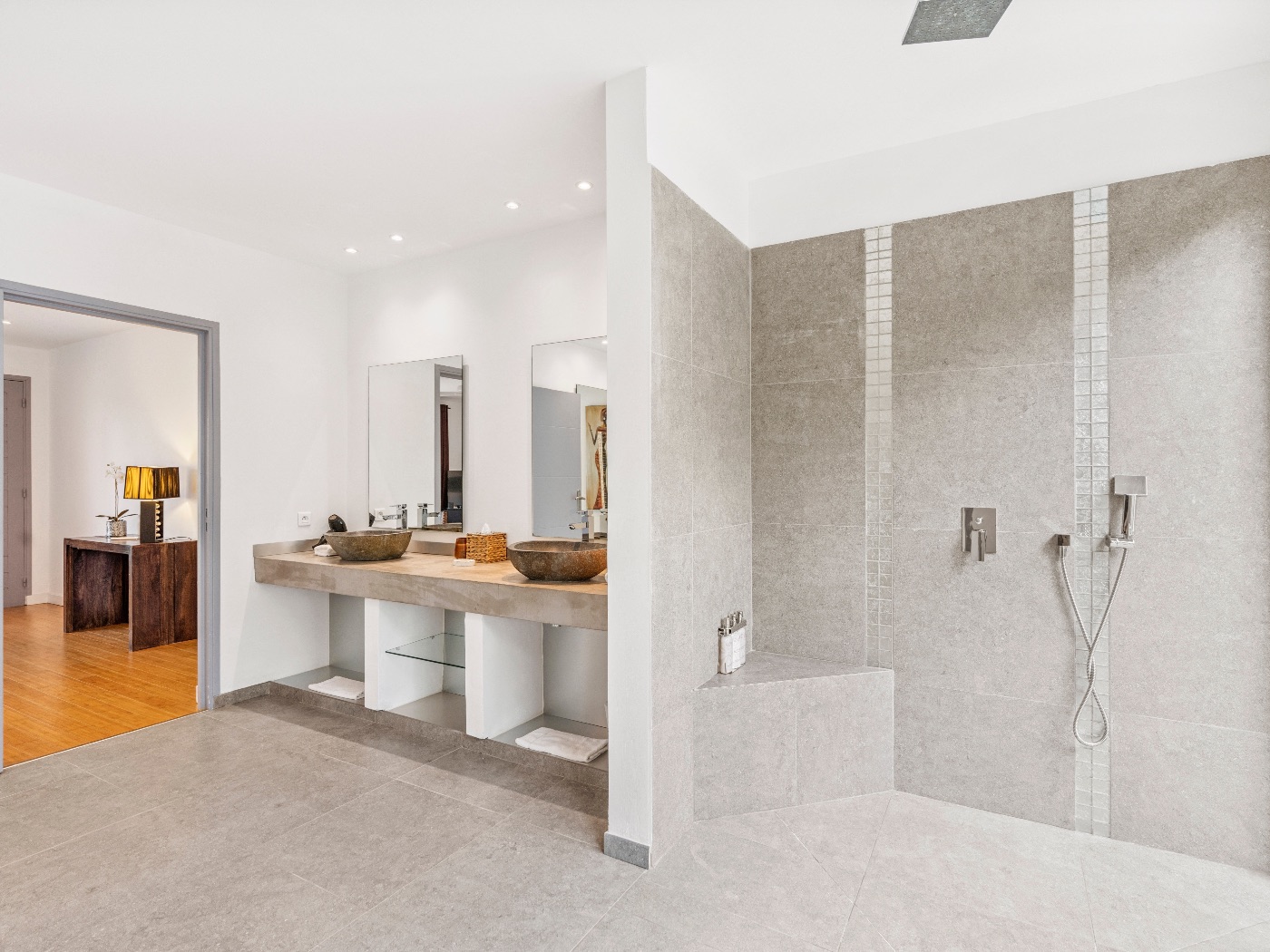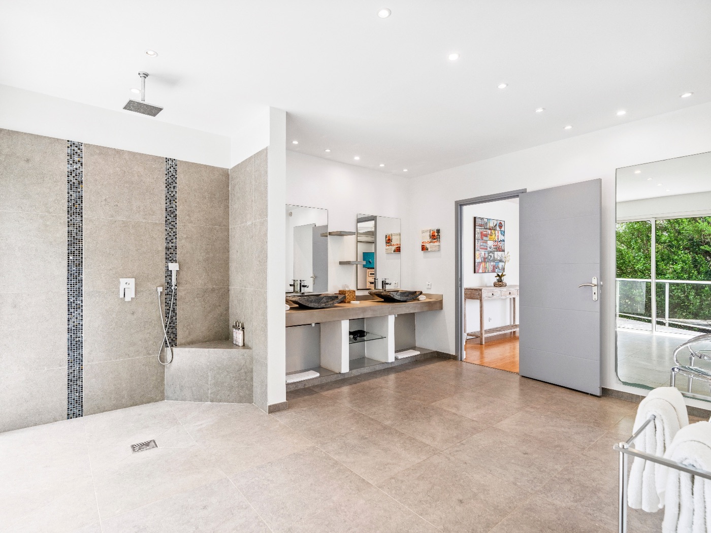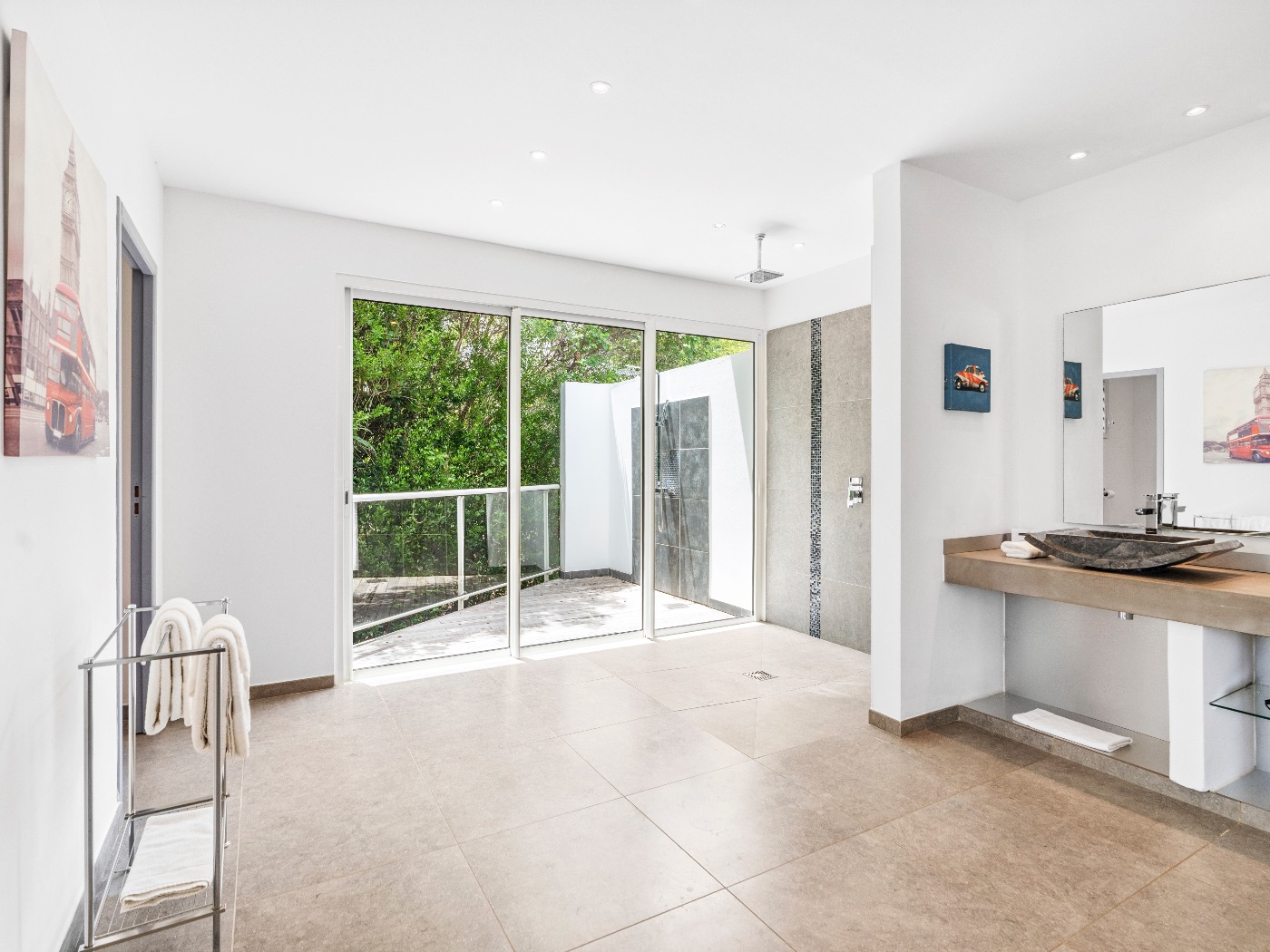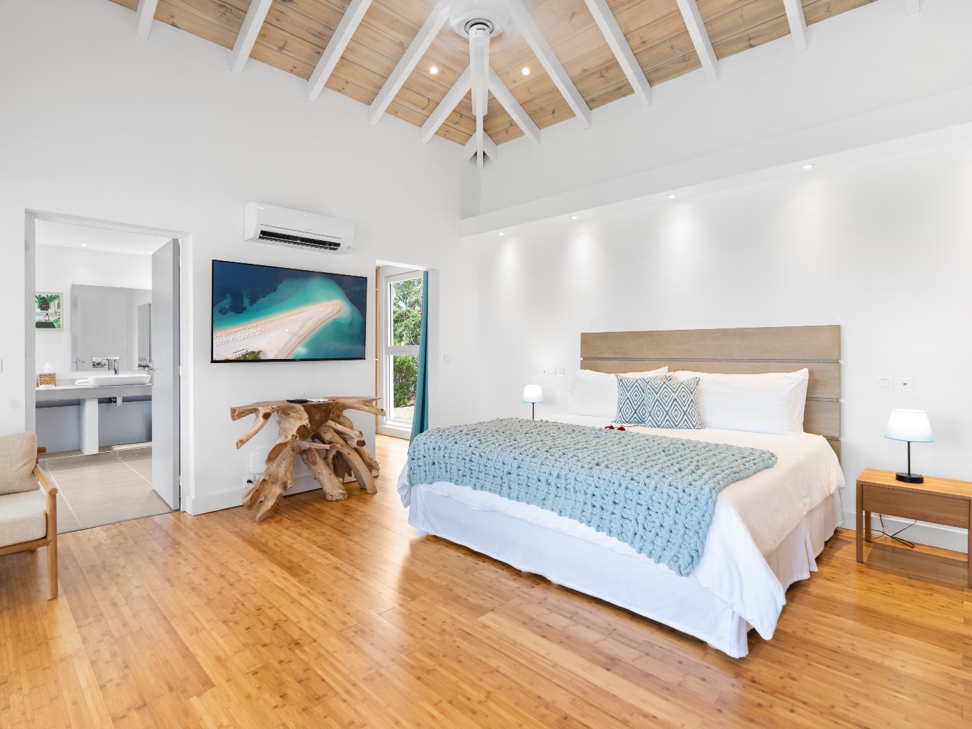The oversized bathrooms include both indoor and outdoor showers opening onto private garden views. One bedroom is located off the main villa, while two are set within a separate casita — offering flexibility and privacy for multi-couple or family stays.
