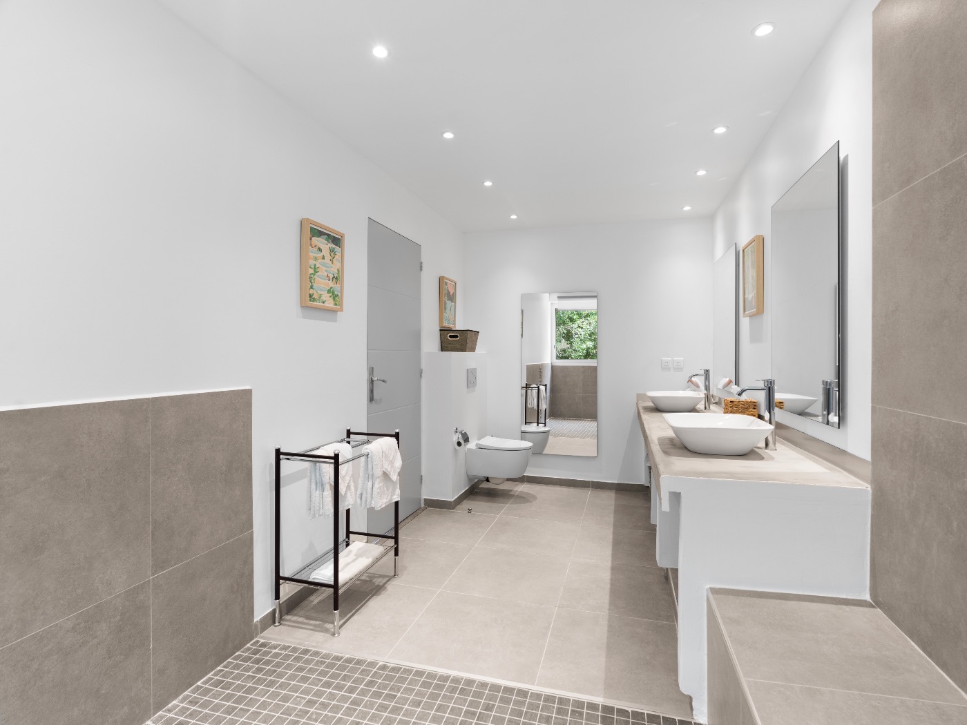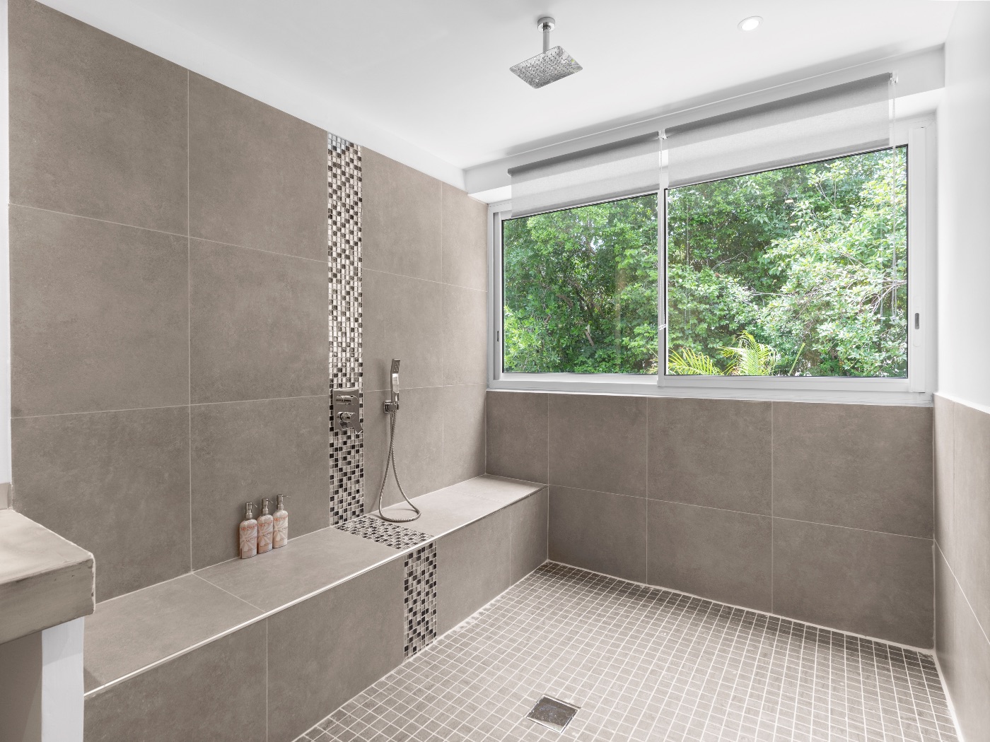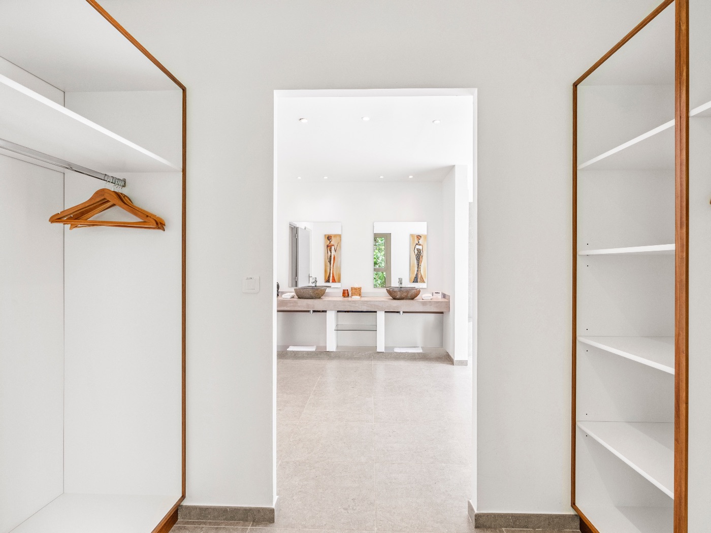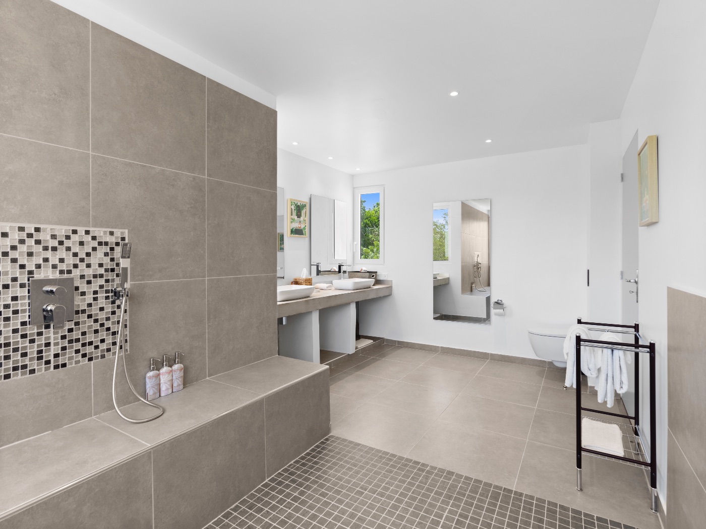 The oversized bathrooms include both indoor and outdoor showers opening onto private garden views. One bedroom is located off the main villa, while two are set within a separate casita — offering flexibility and privacy for multi-couple or family stays.