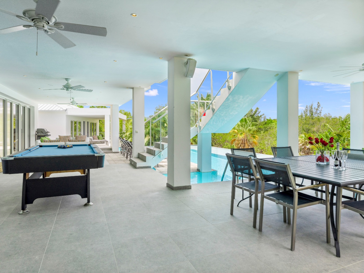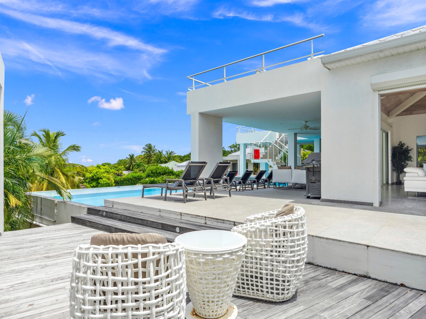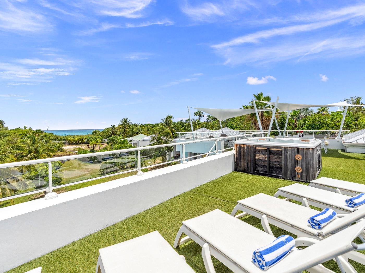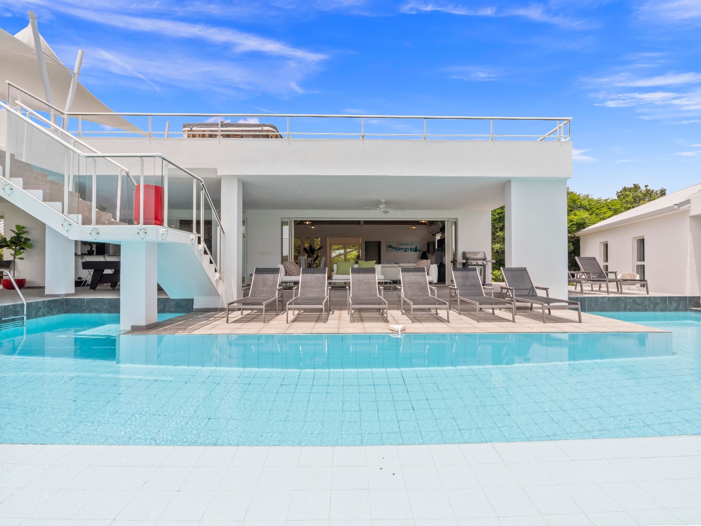 On the main level, a large fiber-optic swimming pool transforms into a glowing work of art at night. An outdoor pool table offers relaxed entertainment, while the rooftop terrace delivers breathtaking sunrise-to-sunset views over the sea. A private hot tub completes the experience — an elevated sanctuary for relaxation under Caribbean skies.