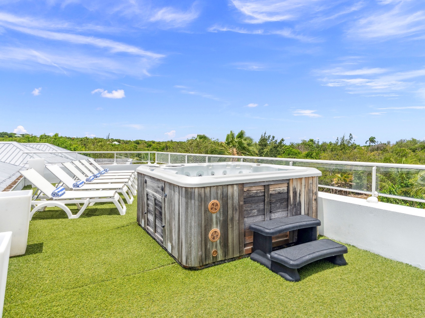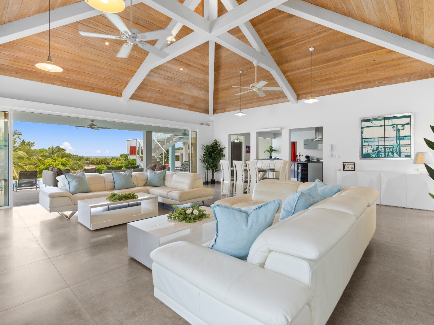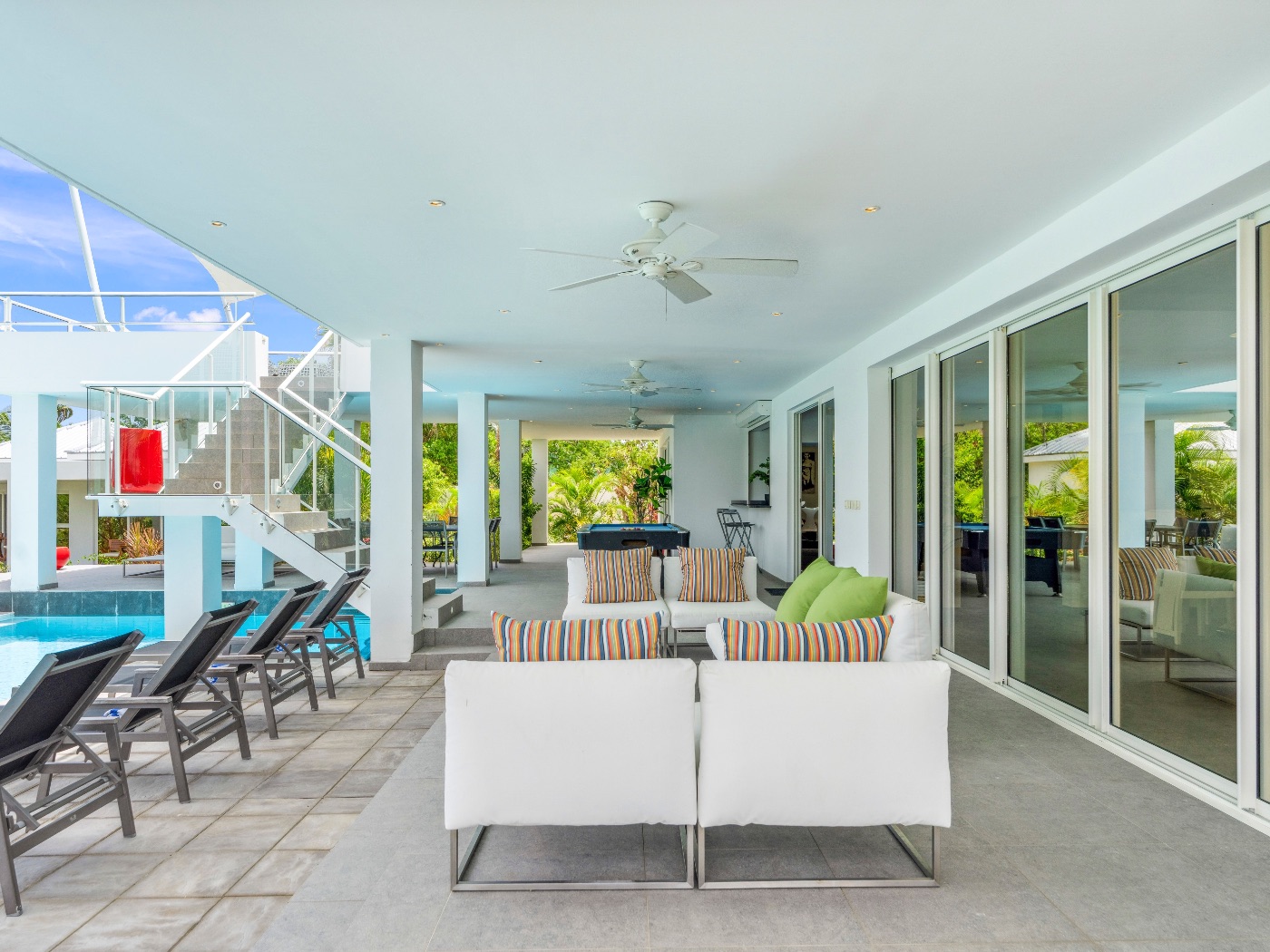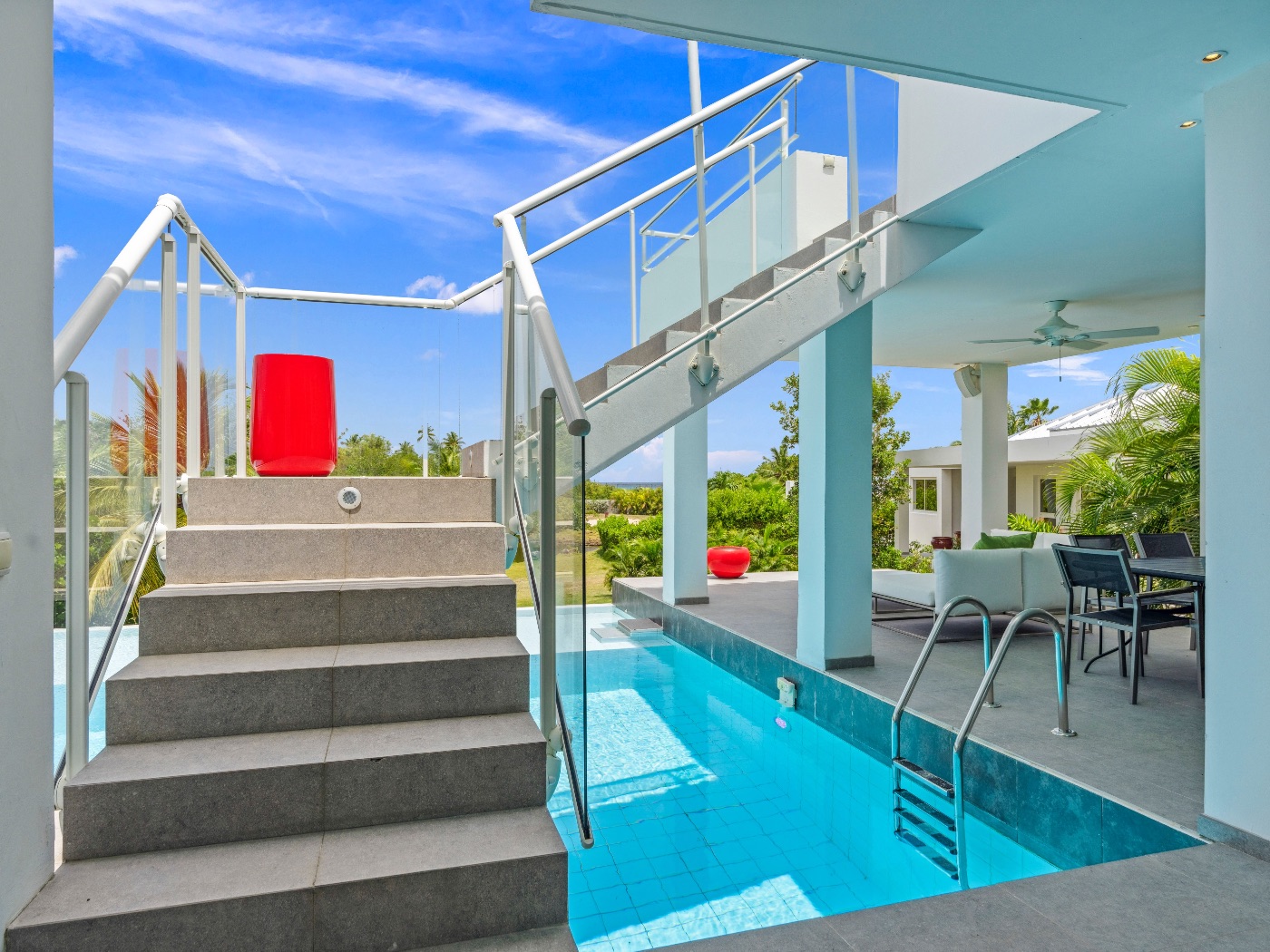 On the main level, a large fiber-optic swimming pool transforms into a glowing work of art at night. An outdoor pool table offers relaxed entertainment, while the rooftop terrace delivers breathtaking sunrise-to-sunset views over the sea. A private hot tub completes the experience — an elevated sanctuary for relaxation under Caribbean skies.
