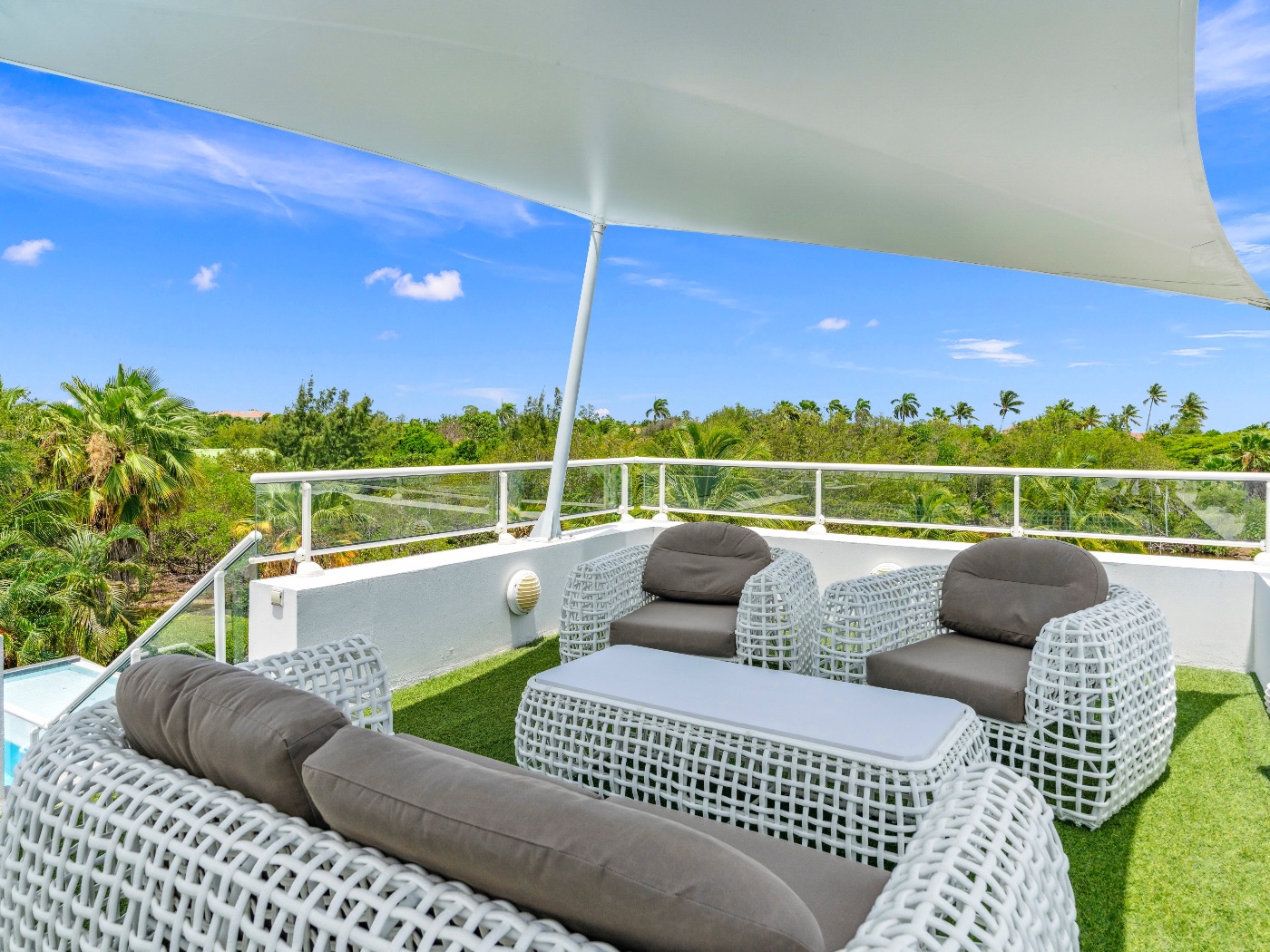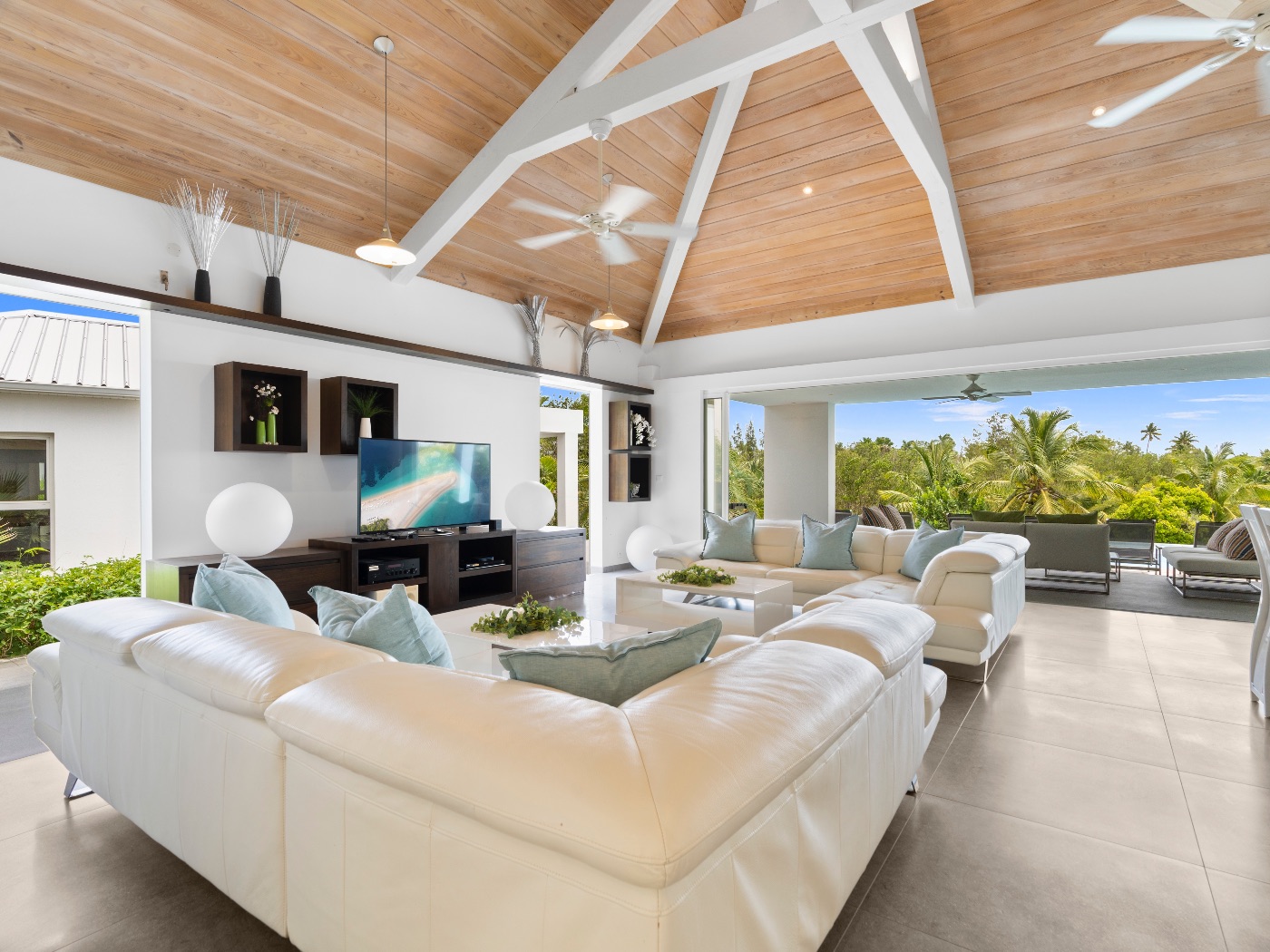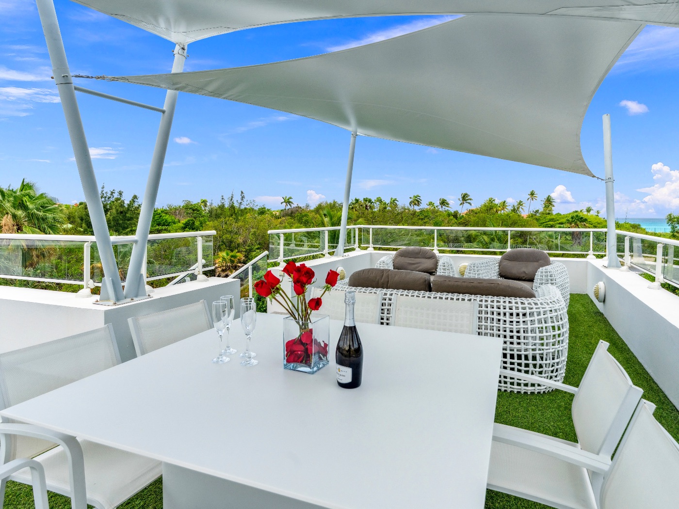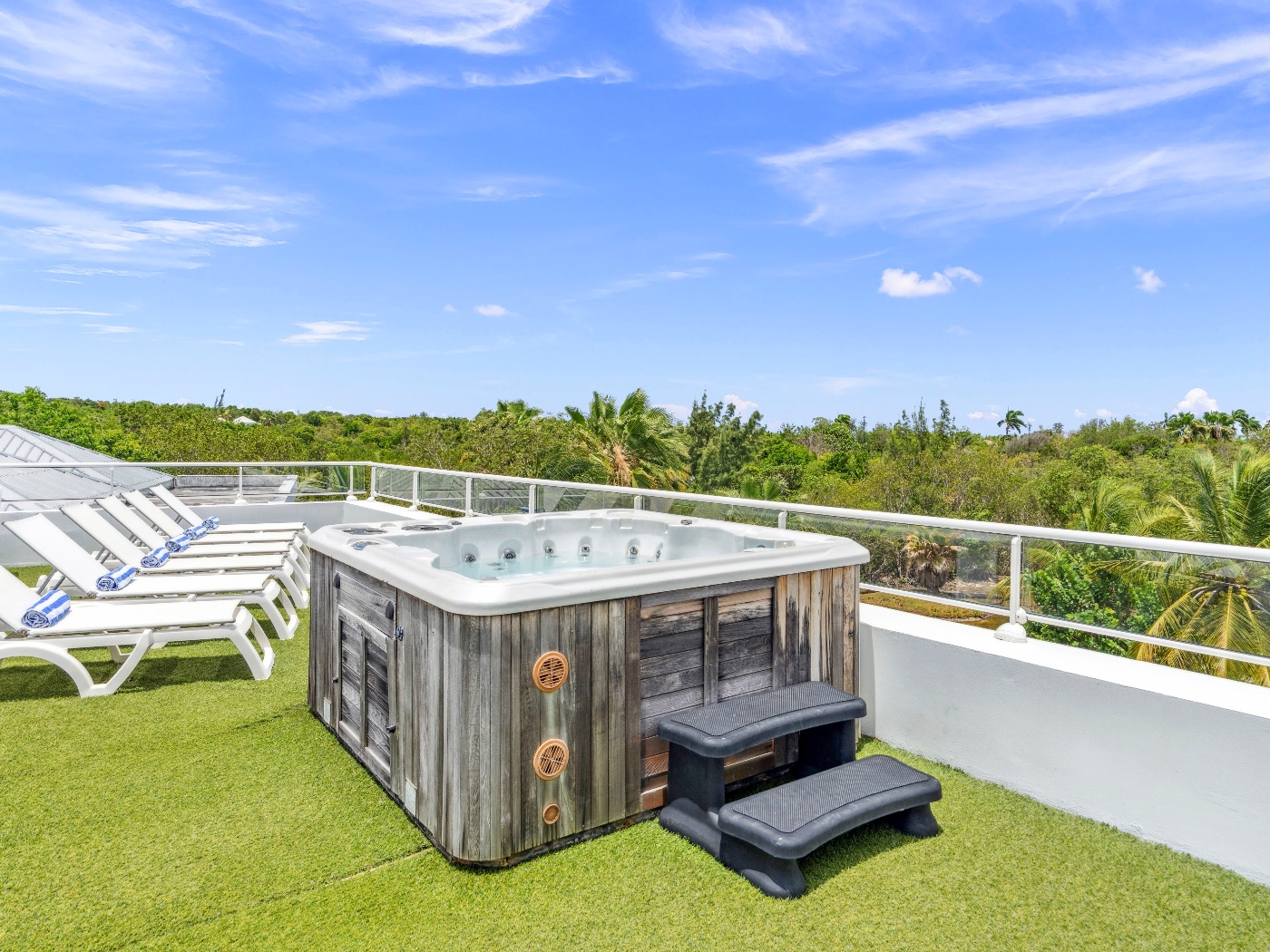 On the main level, a large fiber-optic swimming pool transforms into a glowing work of art at night. An outdoor pool table offers relaxed entertainment, while the rooftop terrace delivers breathtaking sunrise-to-sunset views over the sea. A private hot tub completes the experience — an elevated sanctuary for relaxation under Caribbean skies.