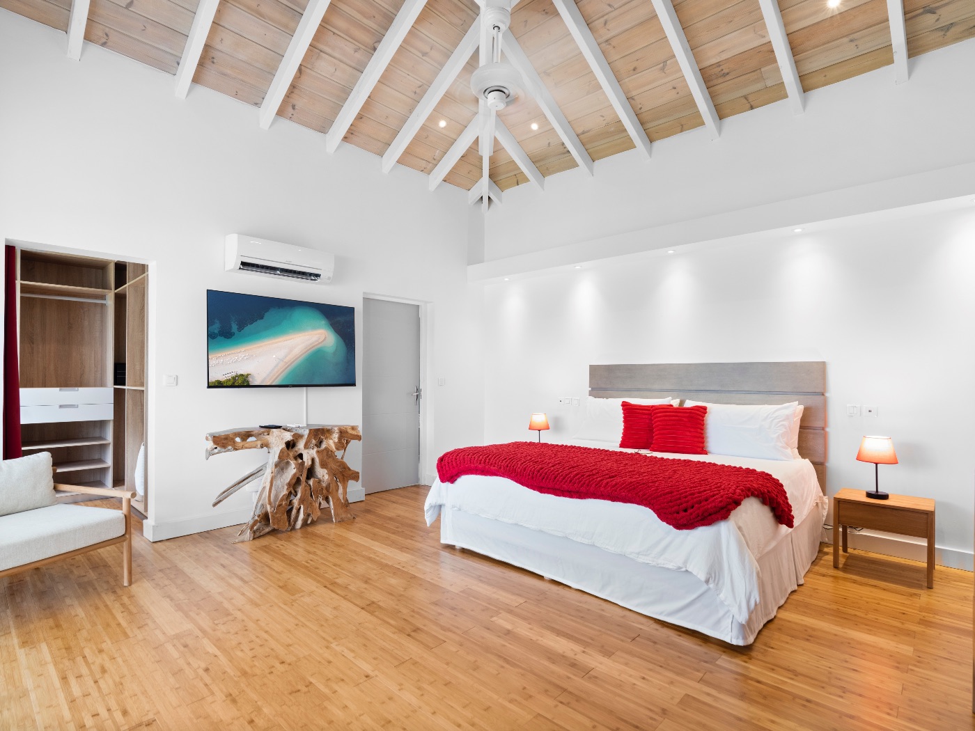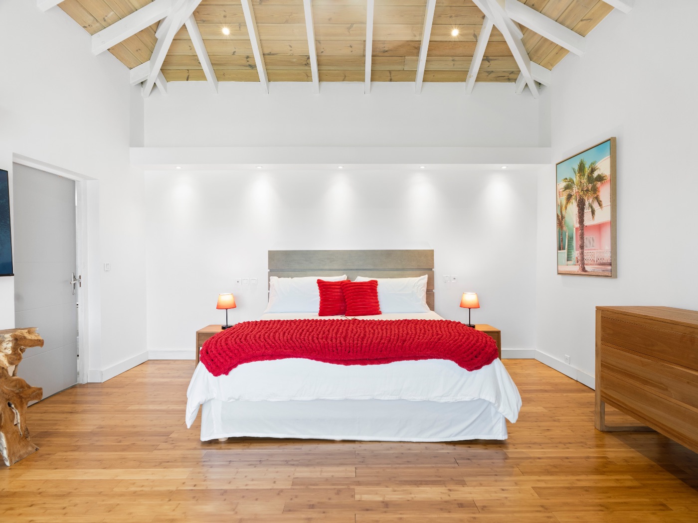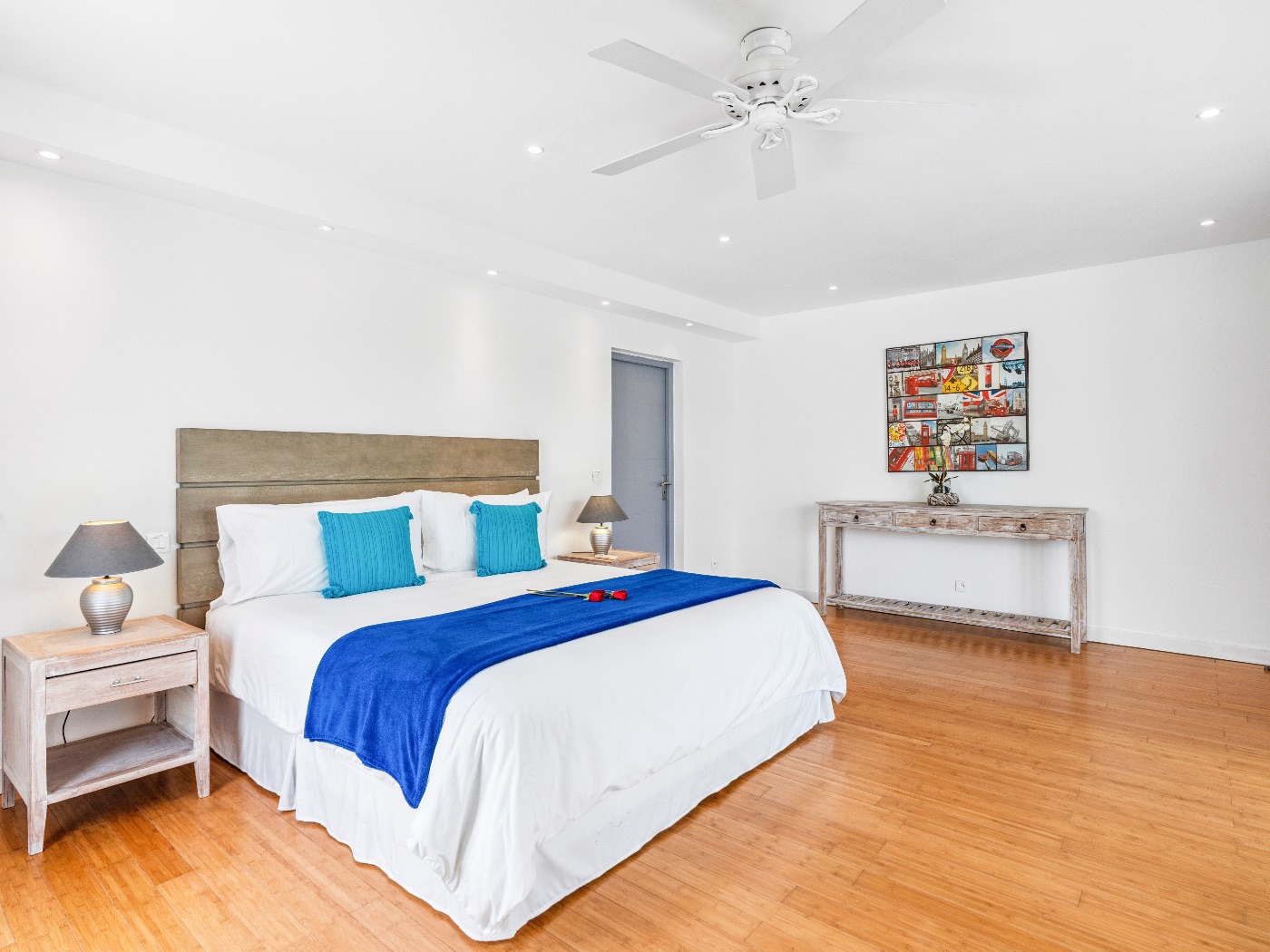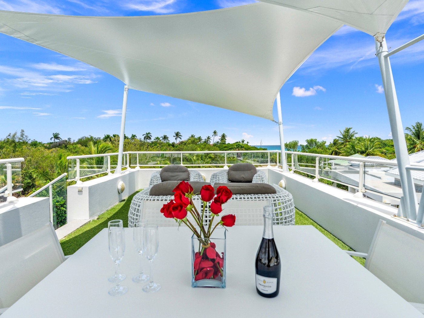 On the main level, a large fiber-optic swimming pool transforms into a glowing work of art at night. An outdoor pool table offers relaxed entertainment, while the rooftop terrace delivers breathtaking sunrise-to-sunset views over the sea. A private hot tub completes the experience — an elevated sanctuary for relaxation under Caribbean skies.