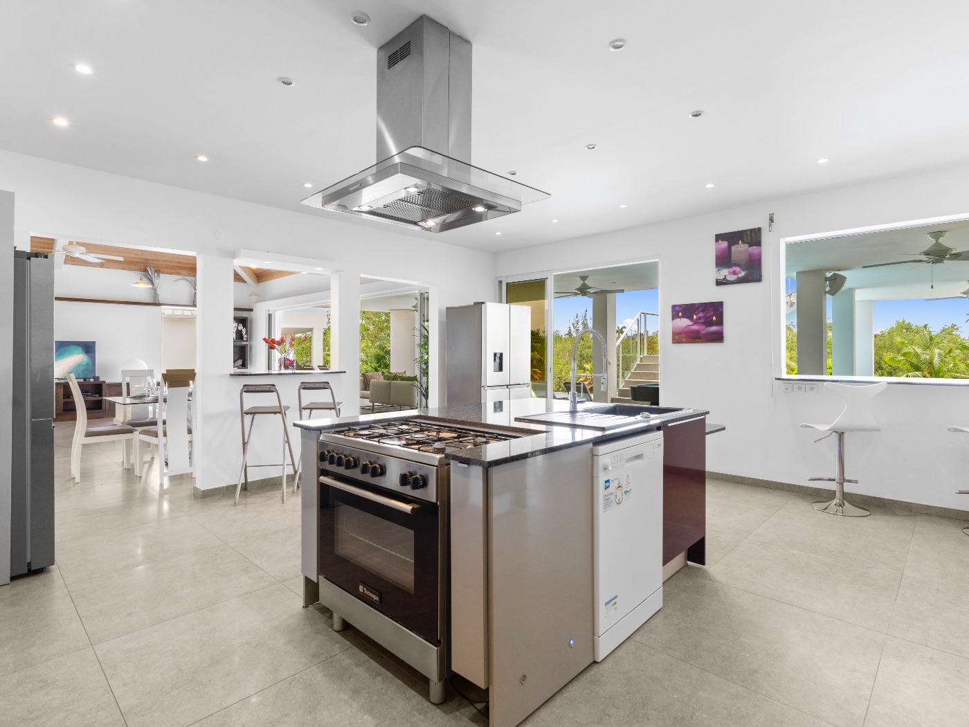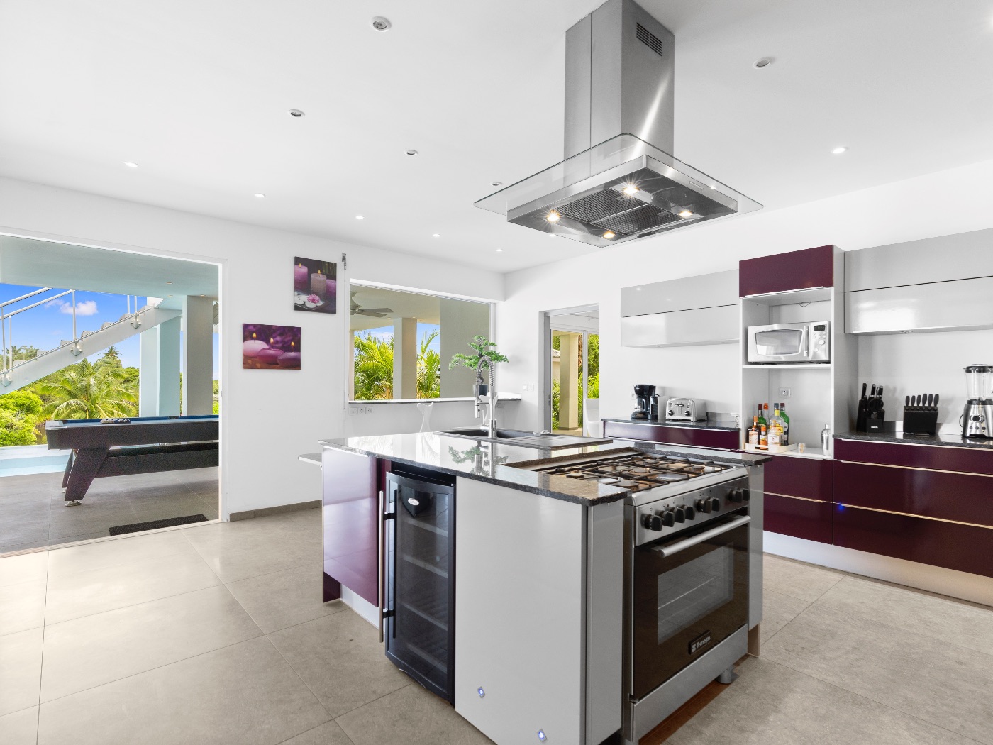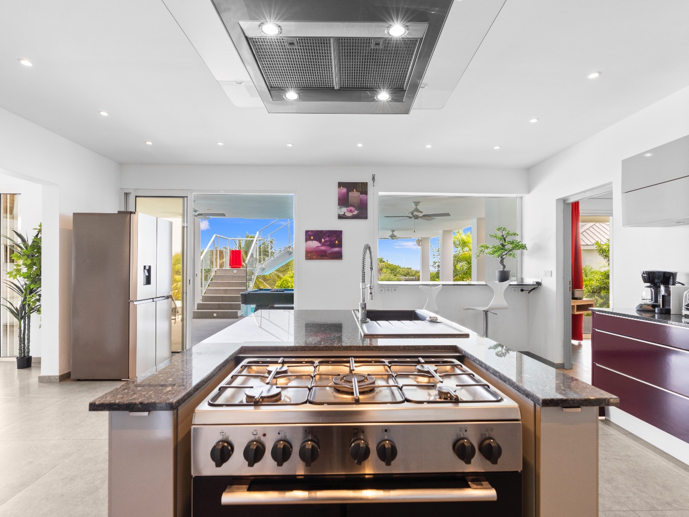 The heart of the home is a beautifully appointed kitchen in deep aubergine, steel, and granite. Designed to open onto both interior and exterior spaces, it allows the chef to remain connected to guests during gatherings. Multiple covered terraces provide varied settings throughout the day — from shaded lounging to open-air dining.