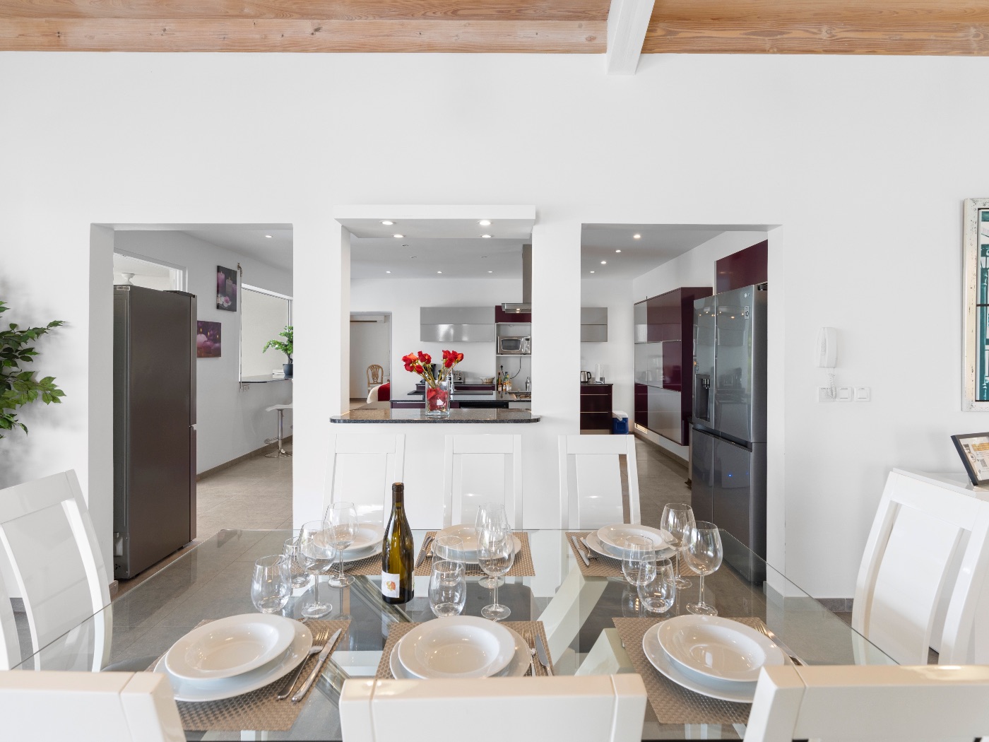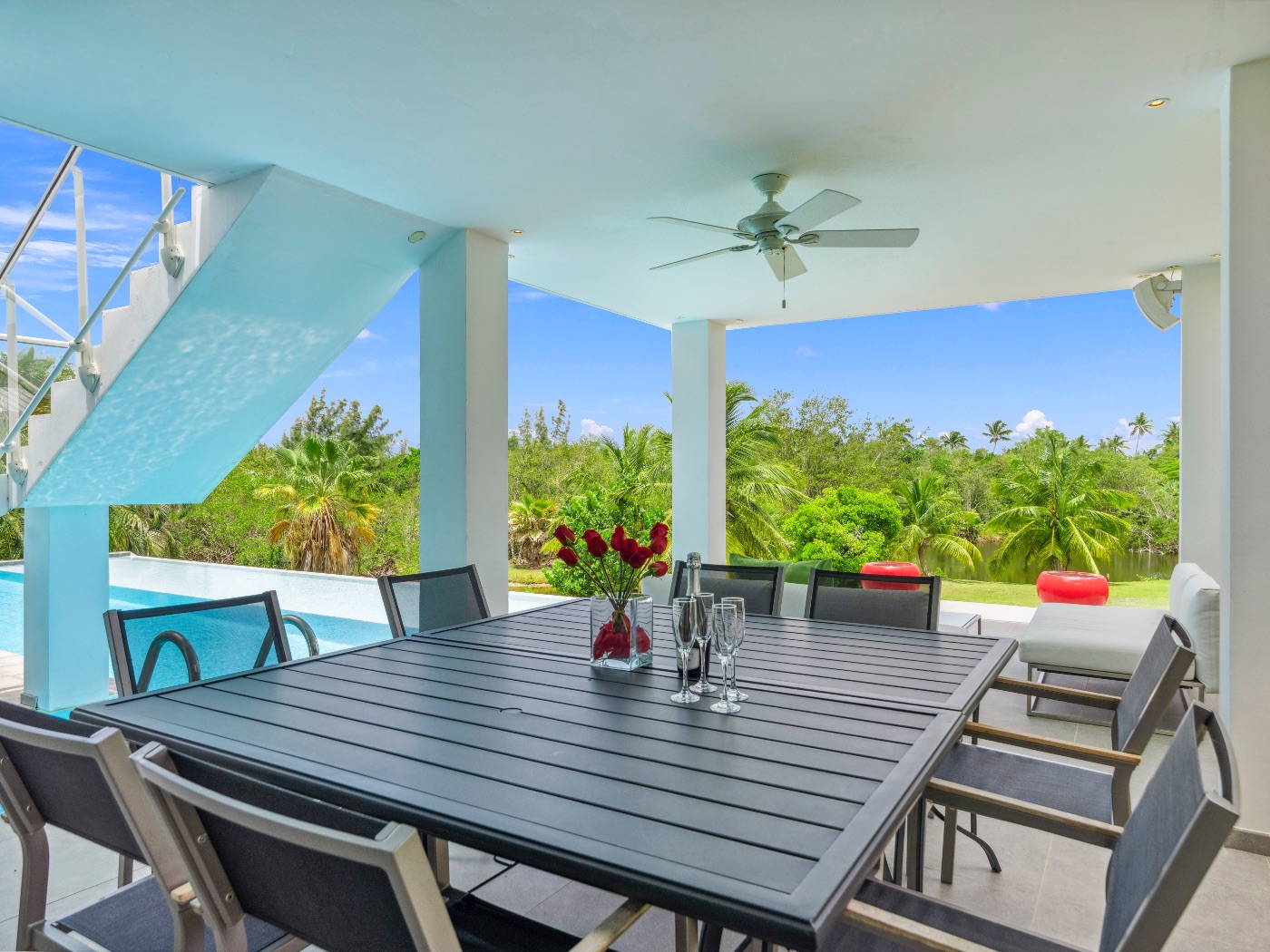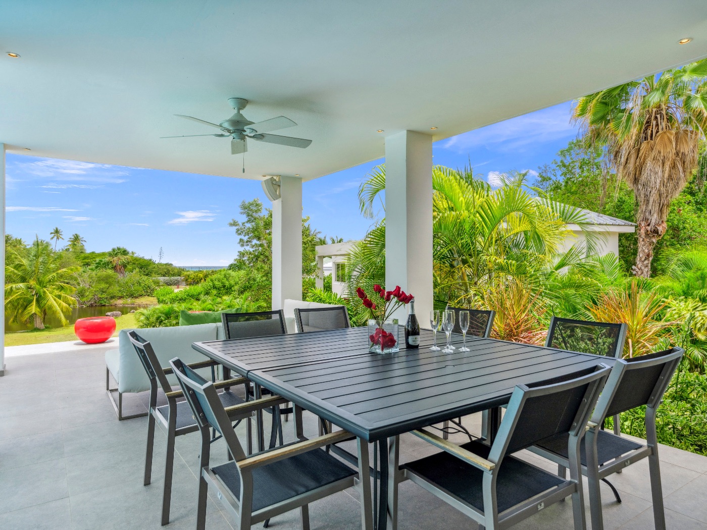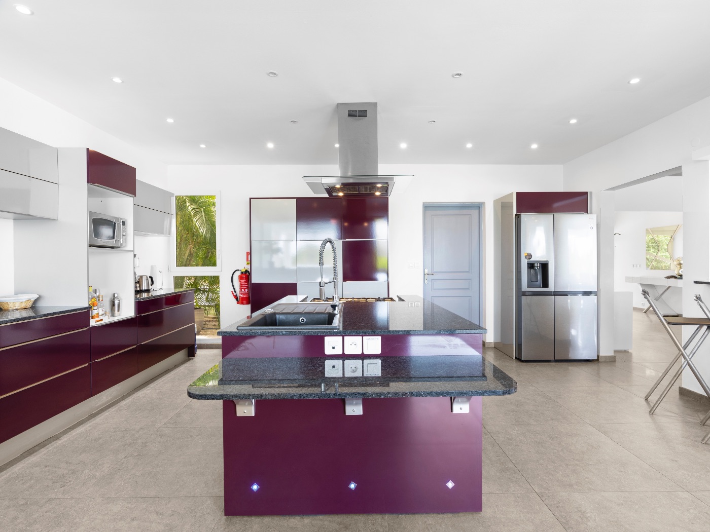 The heart of the home is a beautifully appointed kitchen in deep aubergine, steel, and granite. Designed to open onto both interior and exterior spaces, it allows the chef to remain connected to guests during gatherings. Multiple covered terraces provide varied settings throughout the day — from shaded lounging to open-air dining.