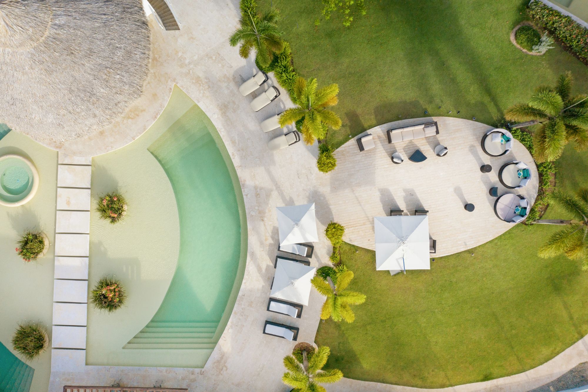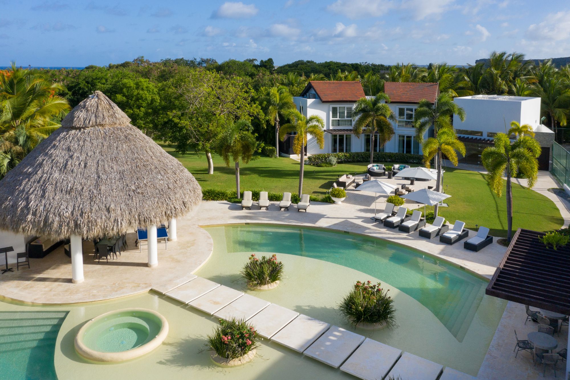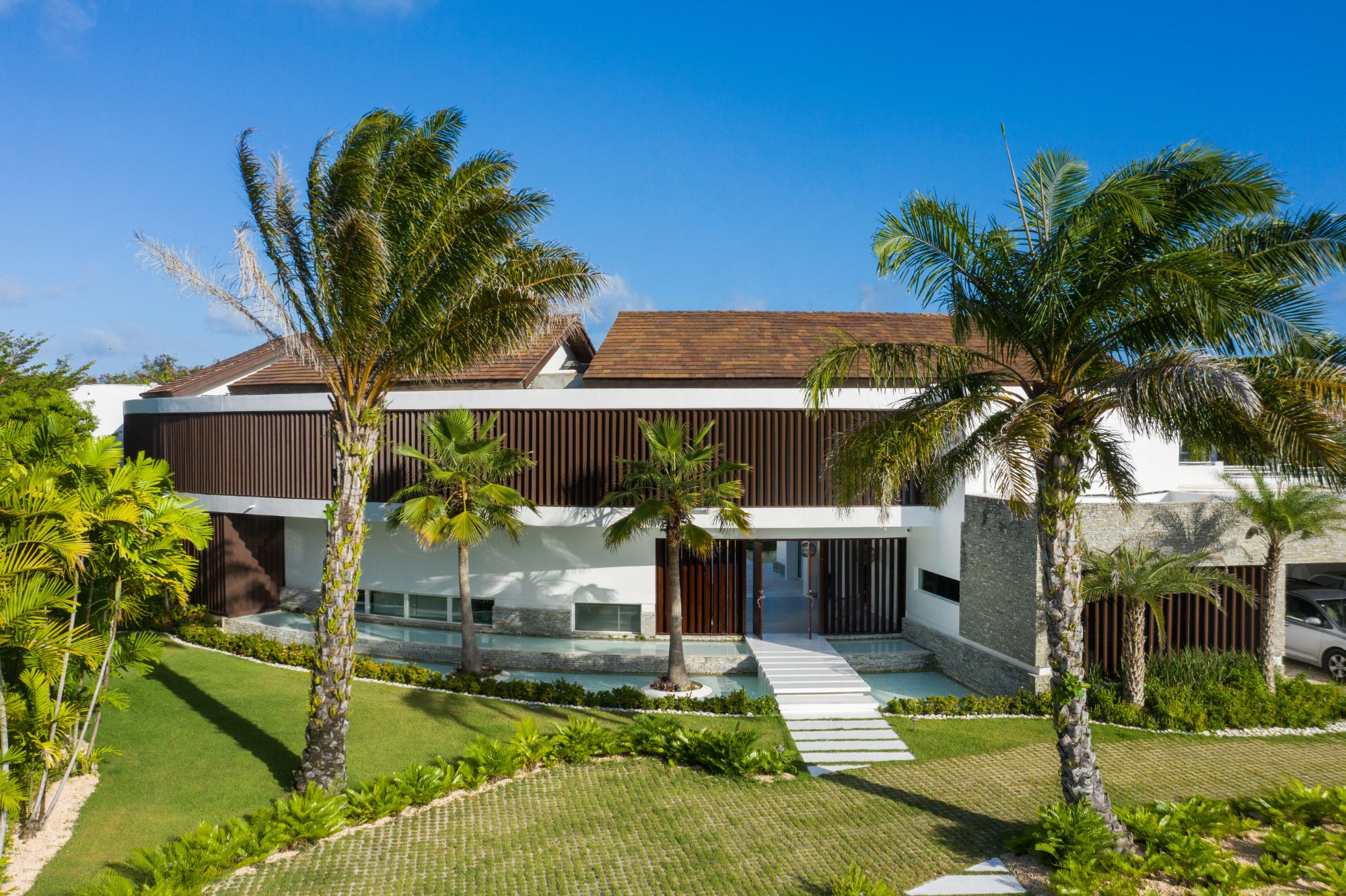 Villa Sambarela rises in a graceful semi-circle amid the manicured tropical gardens of Cap Cana, where towering coconut palms sway above three shimmering pools and the air feels permanently salt-kissed and calm.