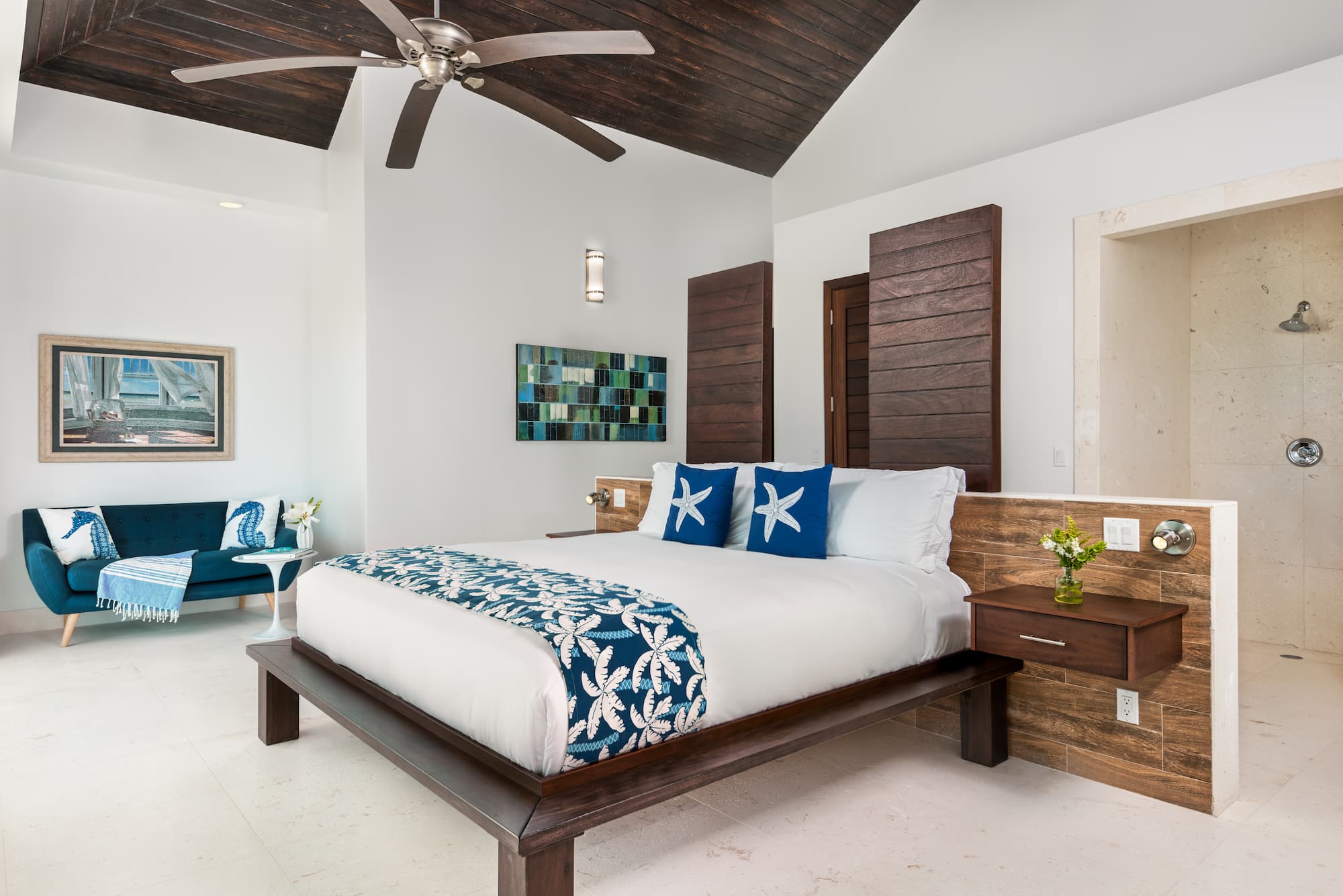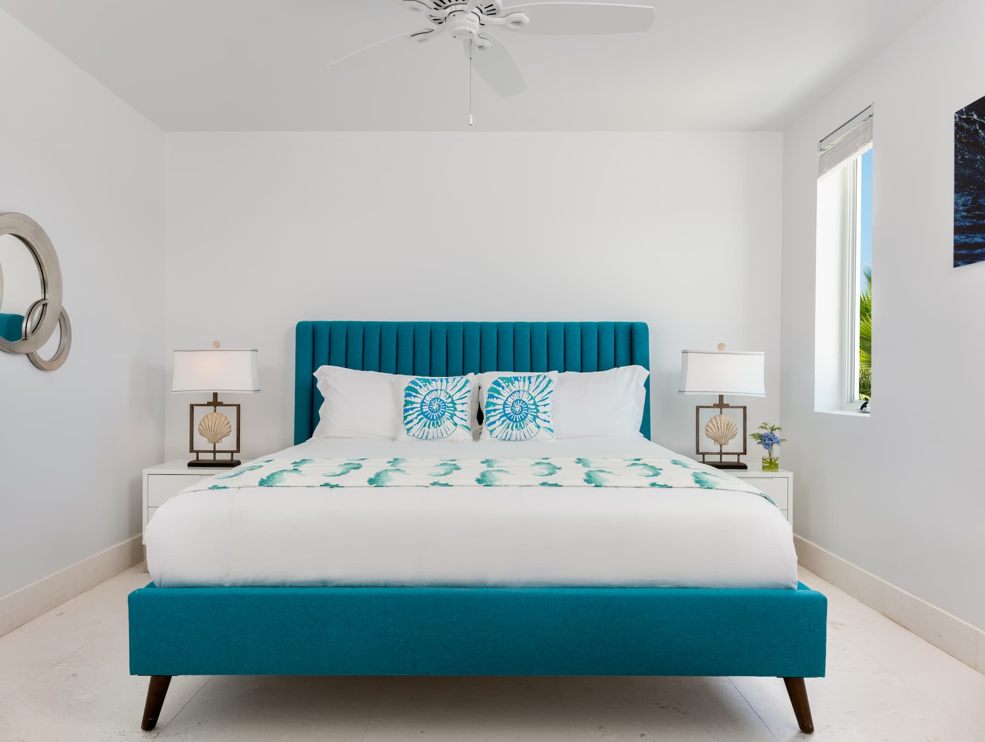 The villa features three beautifully appointed king suites, offering both comfort and privacy. One suite is located on the main level, while two additional suites are positioned on the upper floor, each with a private balcony—one overlooking the ocean, the other with views toward Turtle Cove Marina.