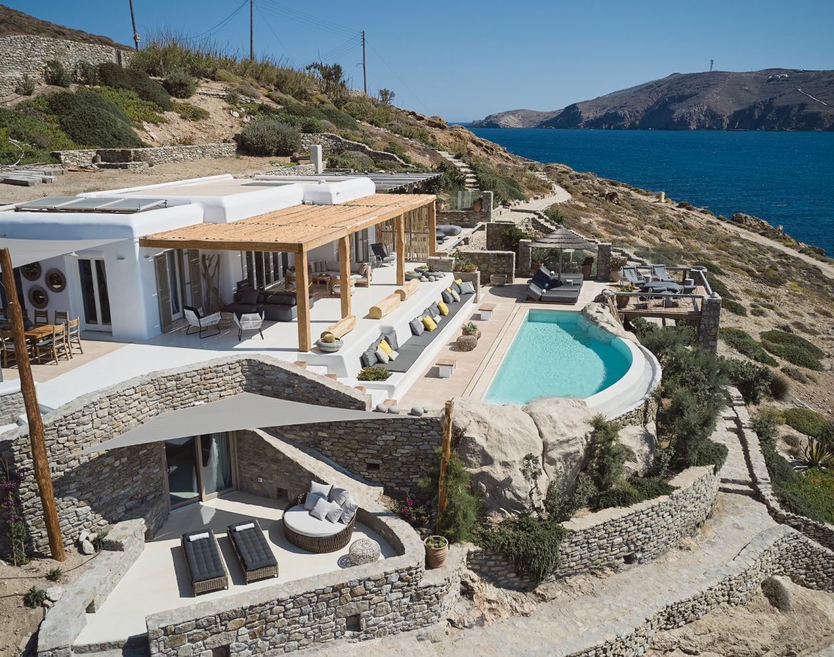 Bright, airy, and effortlessly elegant, Villa Serene’s interior perfectly embodies the Greek island way of life. With its clean lines, gentle hues, and organic materials like stone, wood, and linen, the interior design blends sophistication and simplicity. Each room has been carefully planned to produce a cozy, welcoming ambiance that captures the easygoing allure of Mykonos while retaining a distinct feeling of luxury. Each of the villa’s two floors offers seclusion, comfort, and breathtaking views of the ocean.