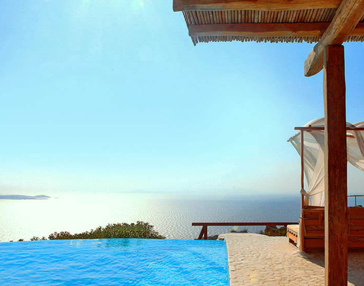 Encircled by rugged cliffs and tropical palm trees the gorgeous Villa Theseus with view to the endless horizon offers a fabulous array of luxury rooms in Mykonos Island for discerning travellers seeking an exquisite retreat near Mykonos town.