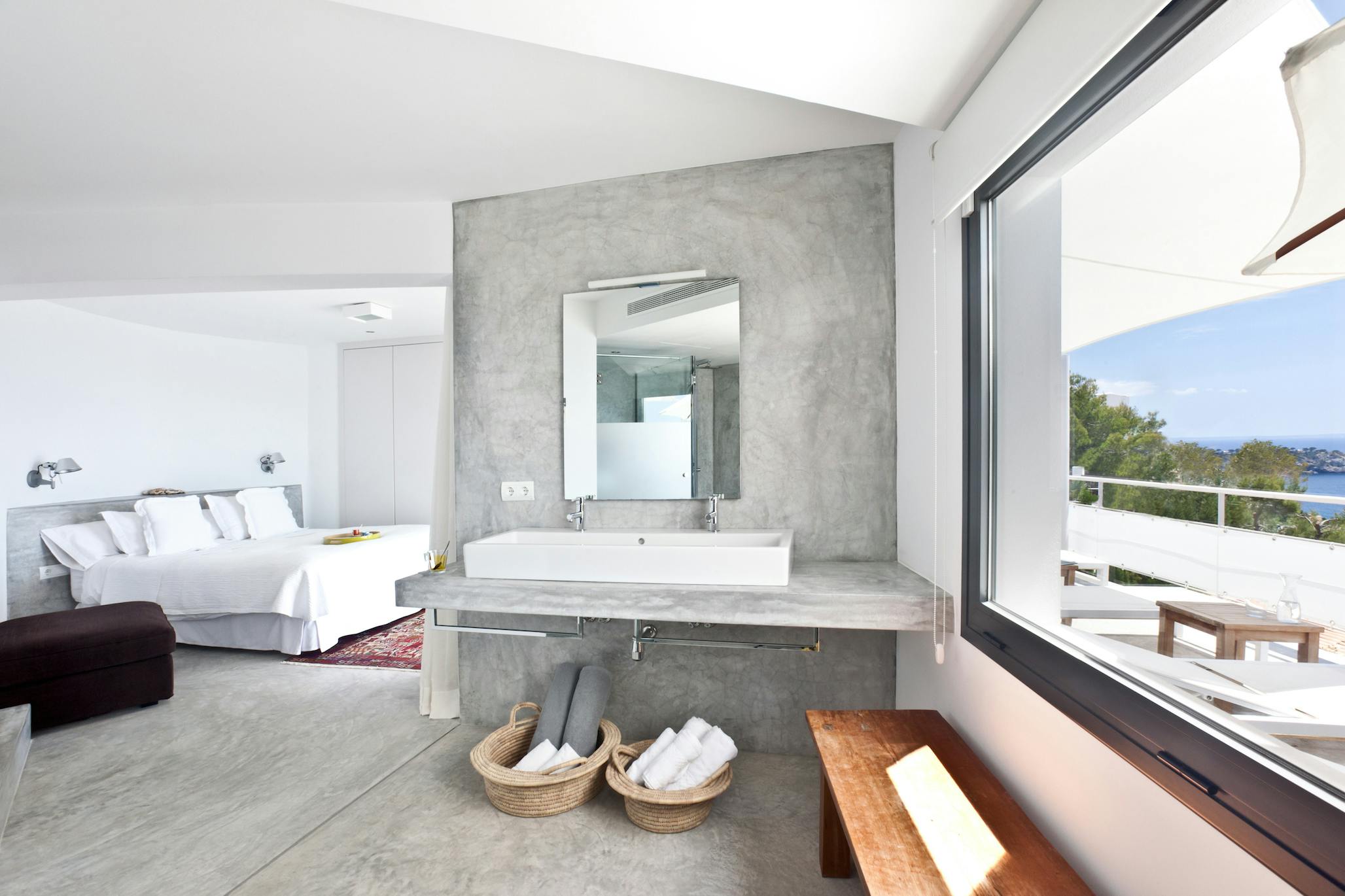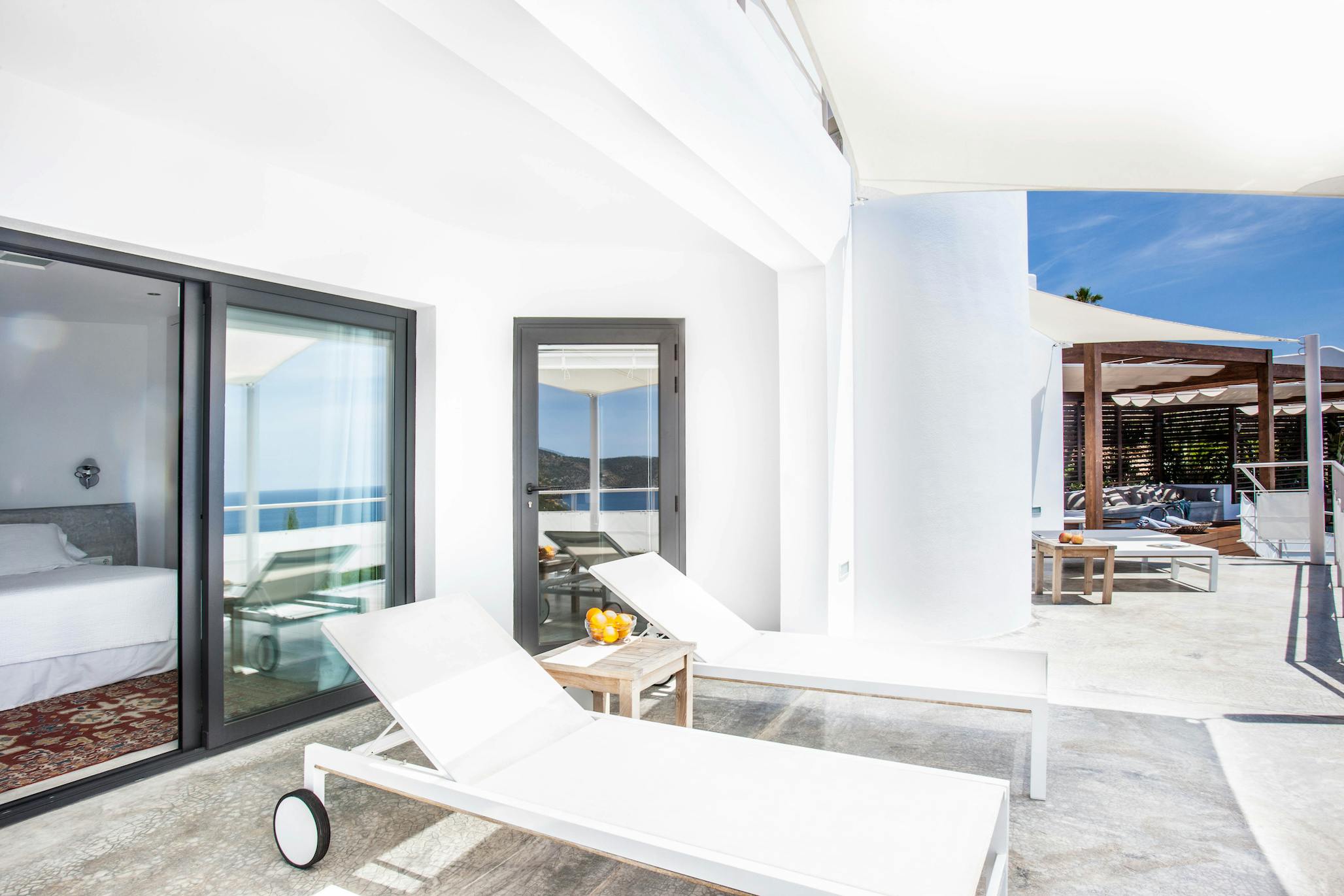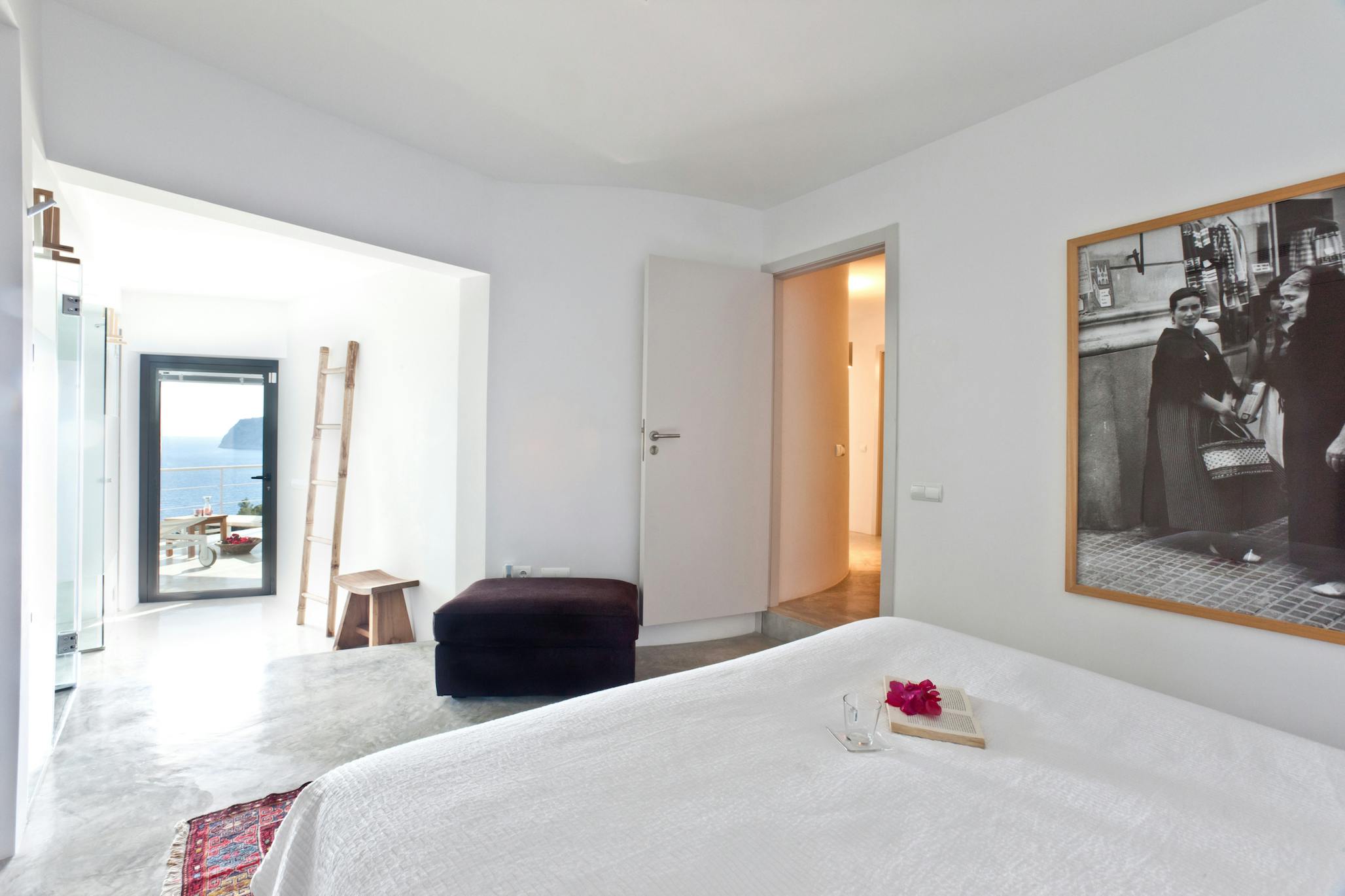 The conversation between comfort and sea views is carried on inside Villa Vista Es Torrent. A sleek galley kitchen, a rustic dining area for eight, and a comfortable den with built-in seating and a cinema-style TV—a convenient gathering place for kids’ movies or a relaxed aperitivo hour—all flow from the pool terrace. The bright, open-plan living area upstairs encircles brilliant blue horizons with white walls. The lounge is anchored by a freestanding hanging fireplace, and the conversation flows from coffee to nightcap thanks to a glass breakfast table and breakfast-bar kitchen. The room is extended into the sky by sliding doors that open to the upper terrace.