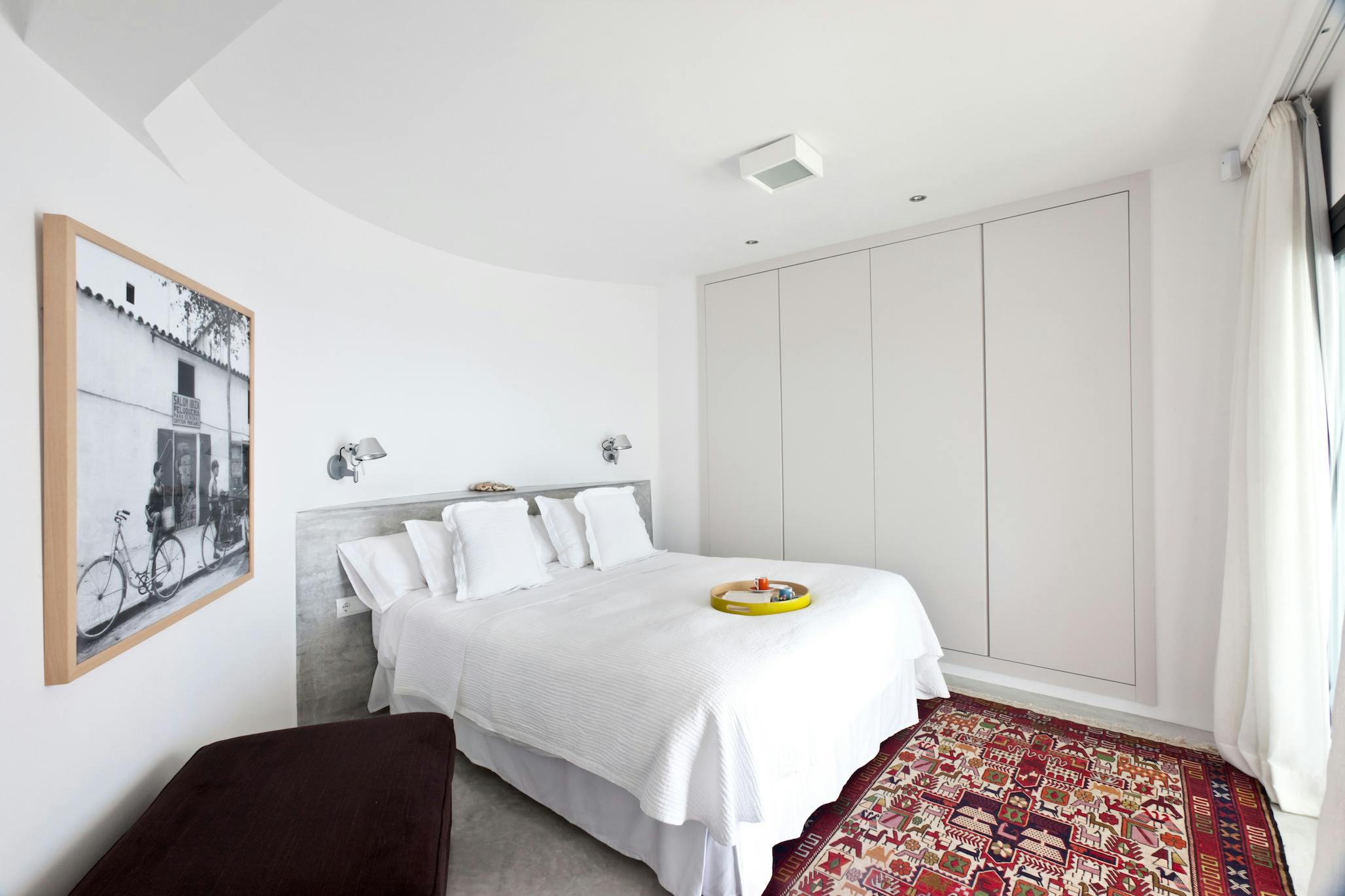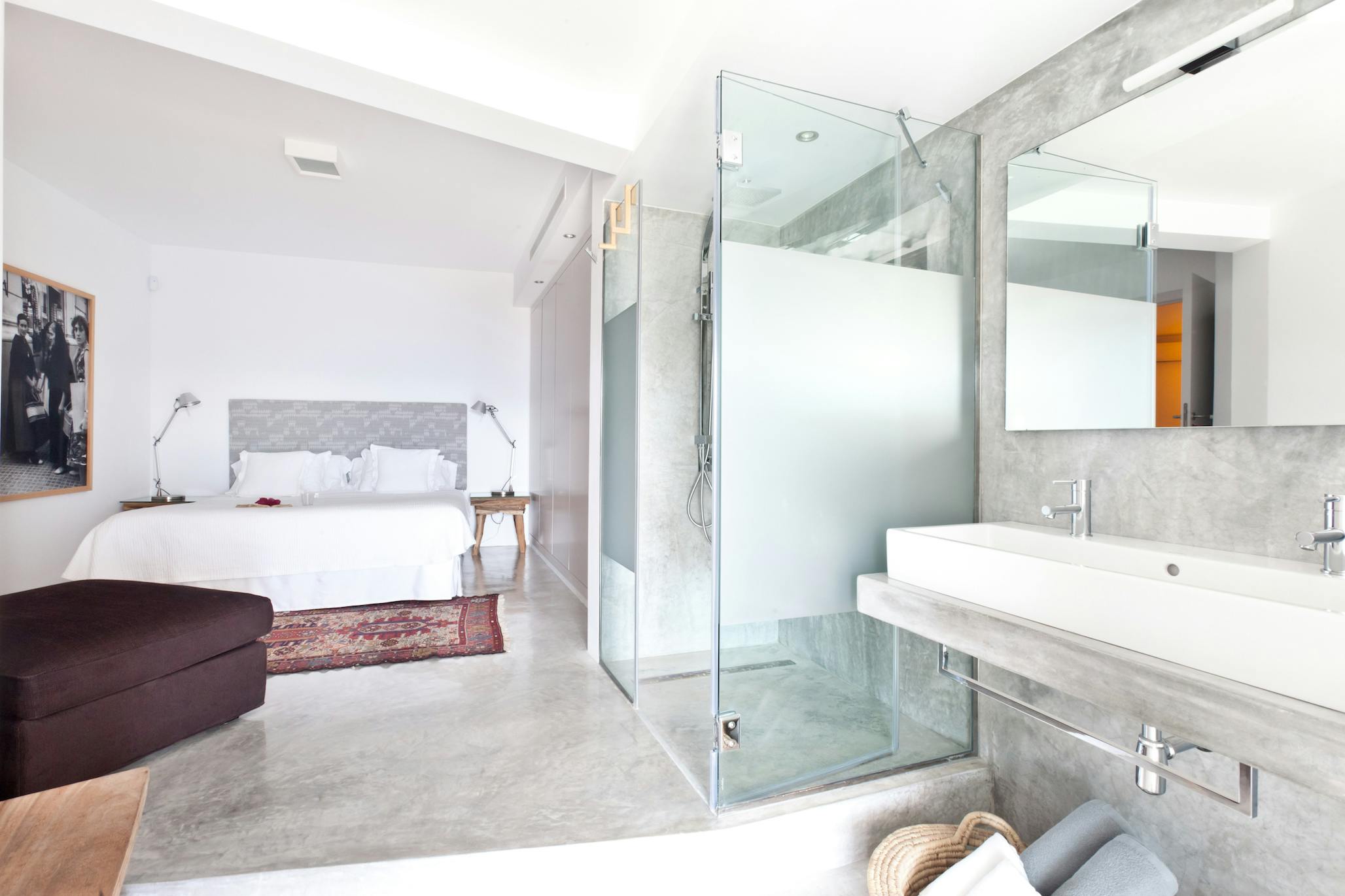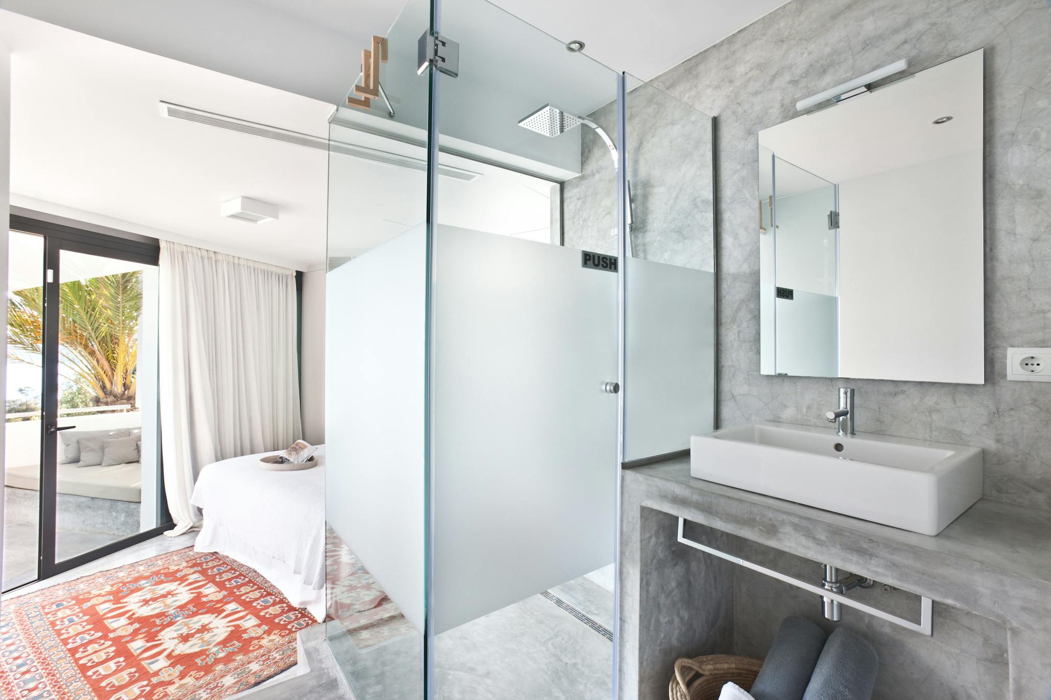 The conversation between comfort and sea views is carried on inside Villa Vista Es Torrent. A sleek galley kitchen, a rustic dining area for eight, and a comfortable den with built-in seating and a cinema-style TV—a convenient gathering place for kids’ movies or a relaxed aperitivo hour—all flow from the pool terrace. The bright, open-plan living area upstairs encircles brilliant blue horizons with white walls. The lounge is anchored by a freestanding hanging fireplace, and the conversation flows from coffee to nightcap thanks to a glass breakfast table and breakfast-bar kitchen. The room is extended into the sky by sliding doors that open to the upper terrace.