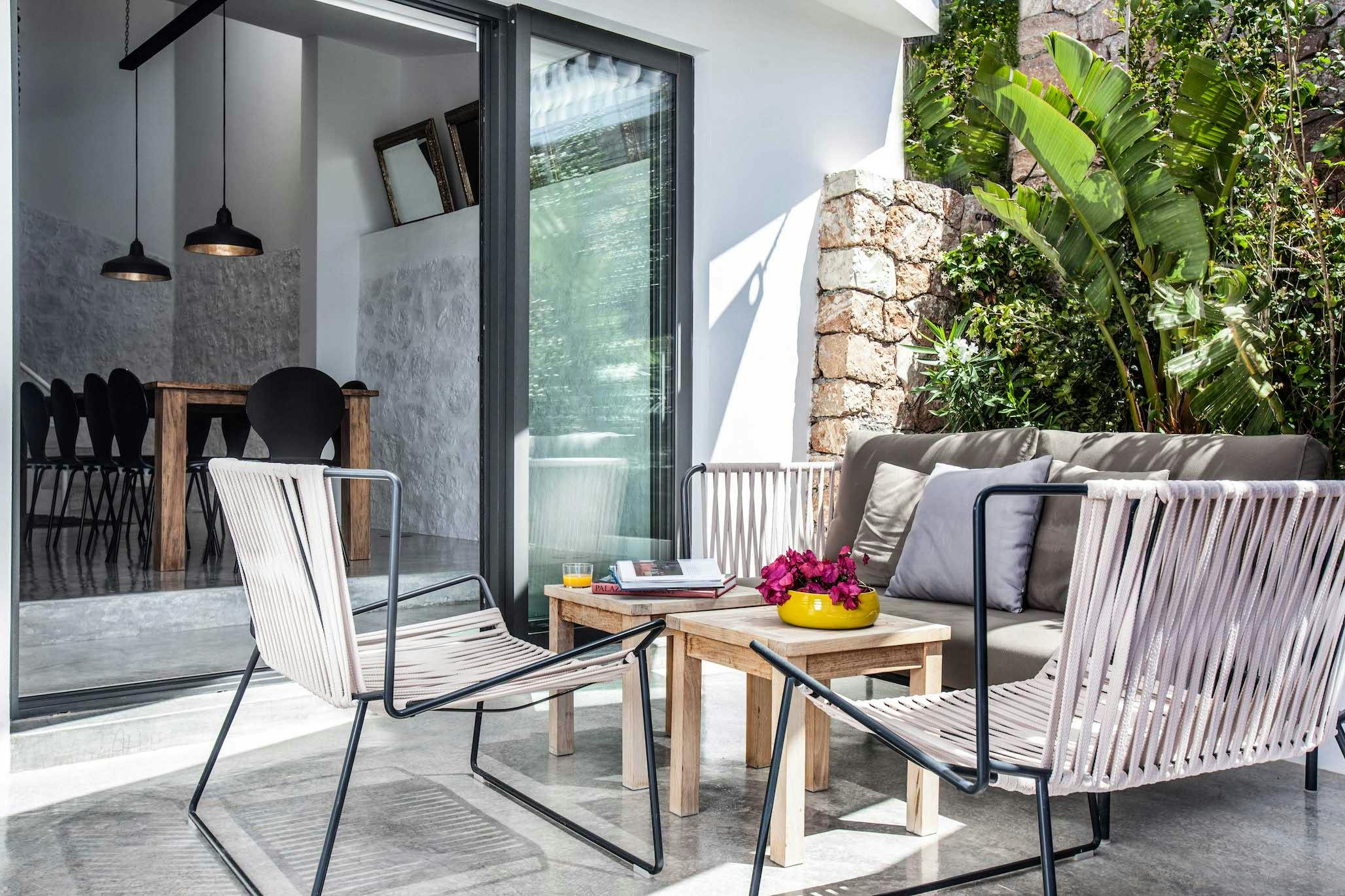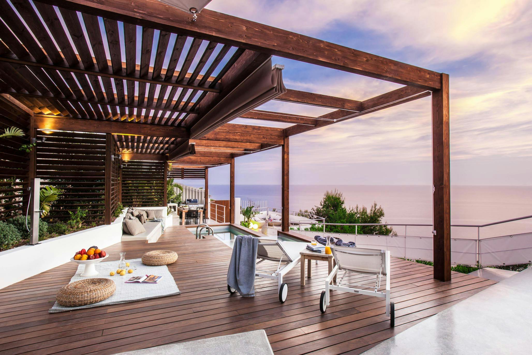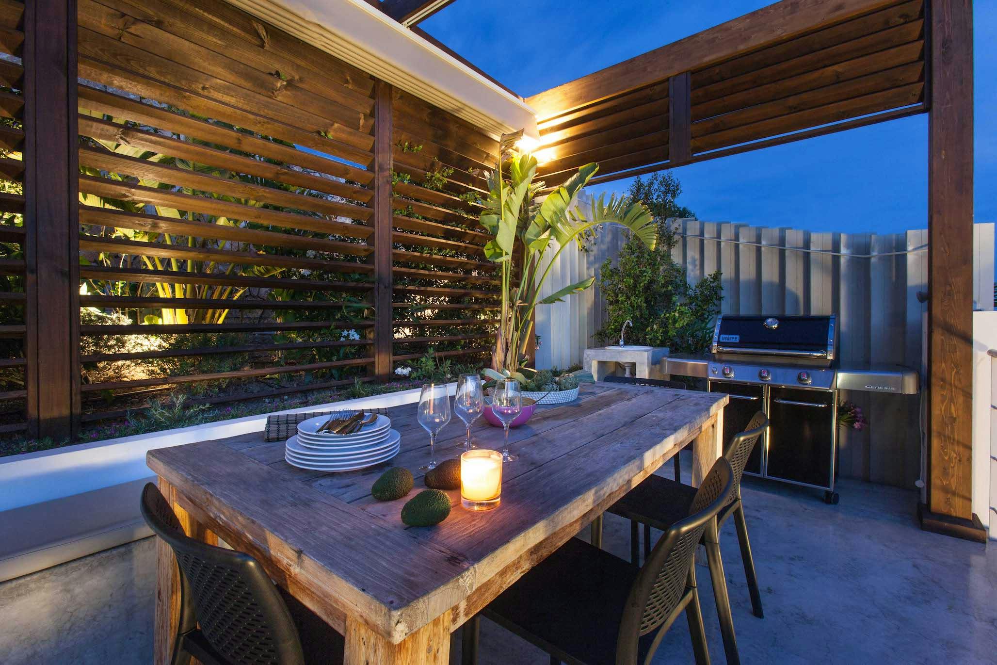 A series of terraces created for every mood awaits you upon arrival. Sliding glass doors off the dining room lead to a bright alcove with lounge chairs and a coffee table, ideal for leisurely mornings and conversations while enjoying the sea breeze. A 7-by-2-meter plunge pool and a dedicated yoga platform are at the end of a dark-wood deck that is softened by Balinese-style shutters. Stretch, plunge, repeat, then congregate on the spacious built-in couches to observe the water’s transformation from cobalt to silver throughout the day. A large wooden table for ten and a gas barbecue make up the alfresco dining area, which becomes your evening stage for long, leisurely meals while the sound of the surf plays below. Rattan cuddle seats on another terrace invite you to stay for sunset as it cantilevers toward the bay.