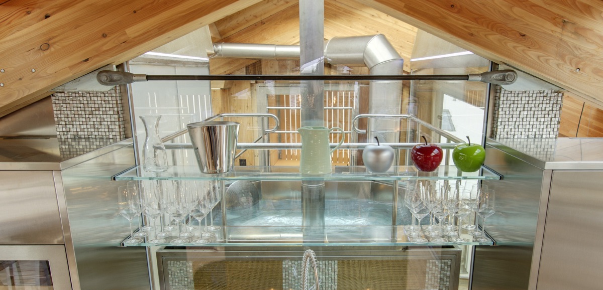 The chalet features 5 double bedrooms. The roof structure has open gables and offers an open living, dining and kitchen space, with the fireplace giving the place a warm atmosphere. At the opposite end of said chimney, the architect designed and built a spectacular hot tub – a fascinating feat of engineering, which is probably one of a kind worldwide. The hot tub can accommodate up to 6 people. At the touch of a button, the roof opens and the spa is hydraulically raised above the roof … The view is breathtaking, making the experience unique and memorable. To complete this exclusive experience, the chalet’s spa also includes a sauna.