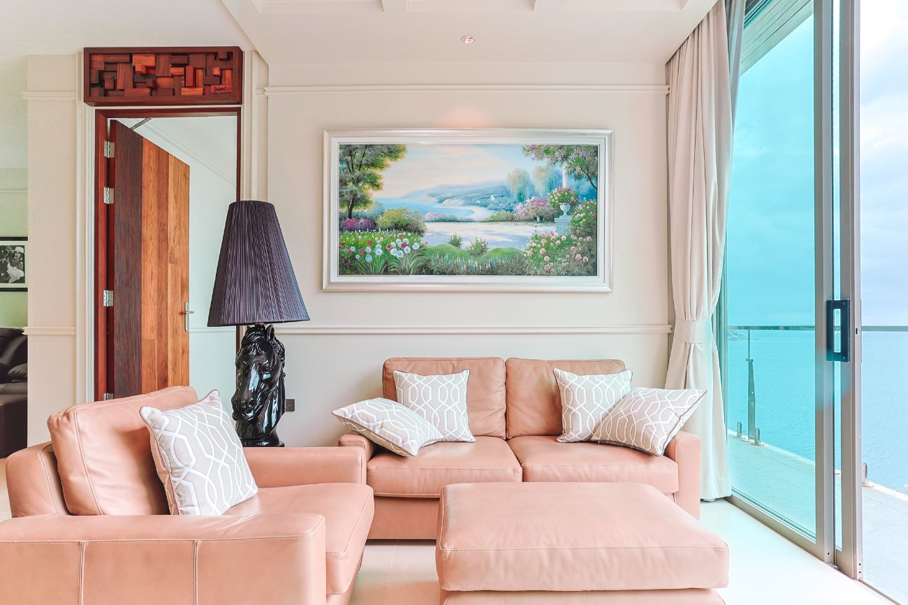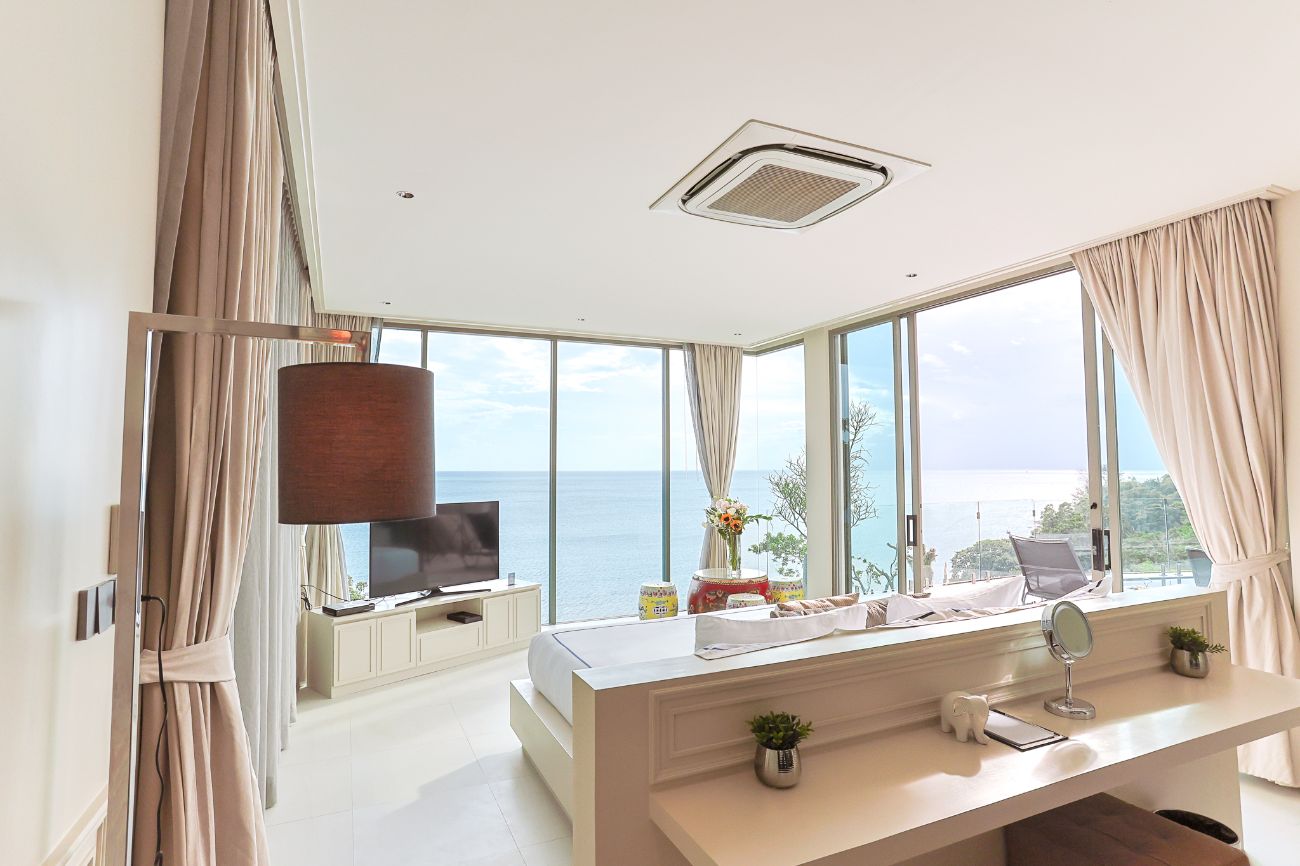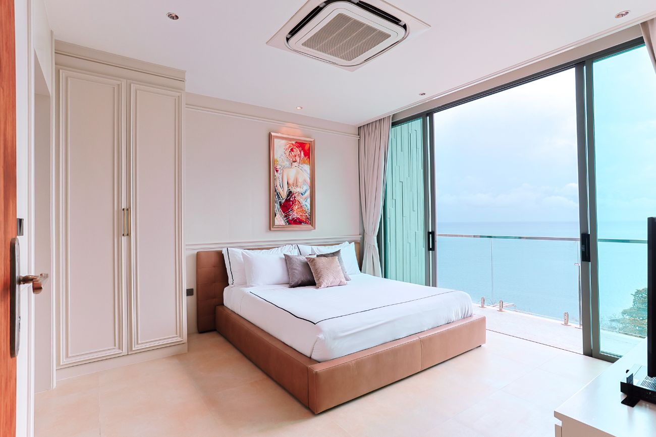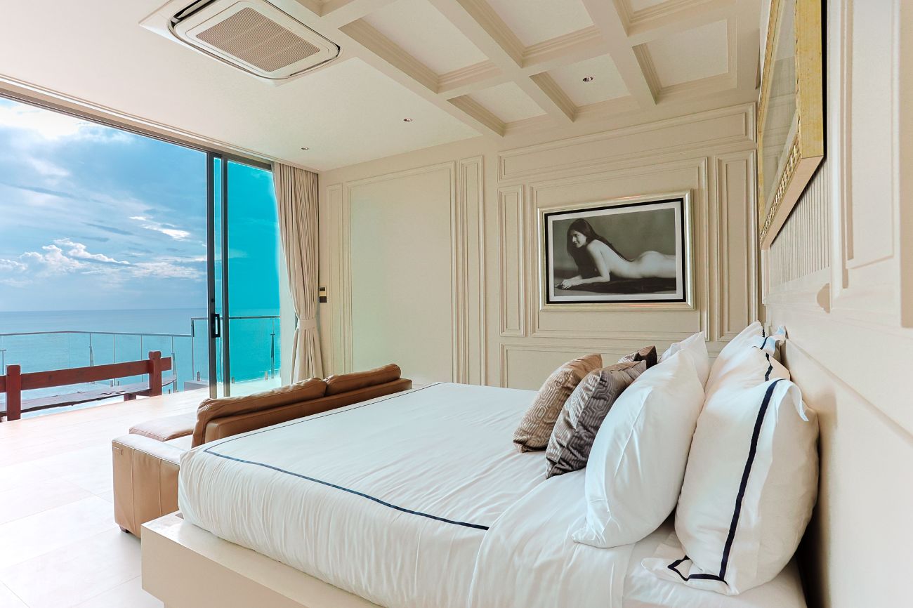 Master Suites (2): King beds, walk-in closets, bathtubs, double vanities, private sea-view terraces.
