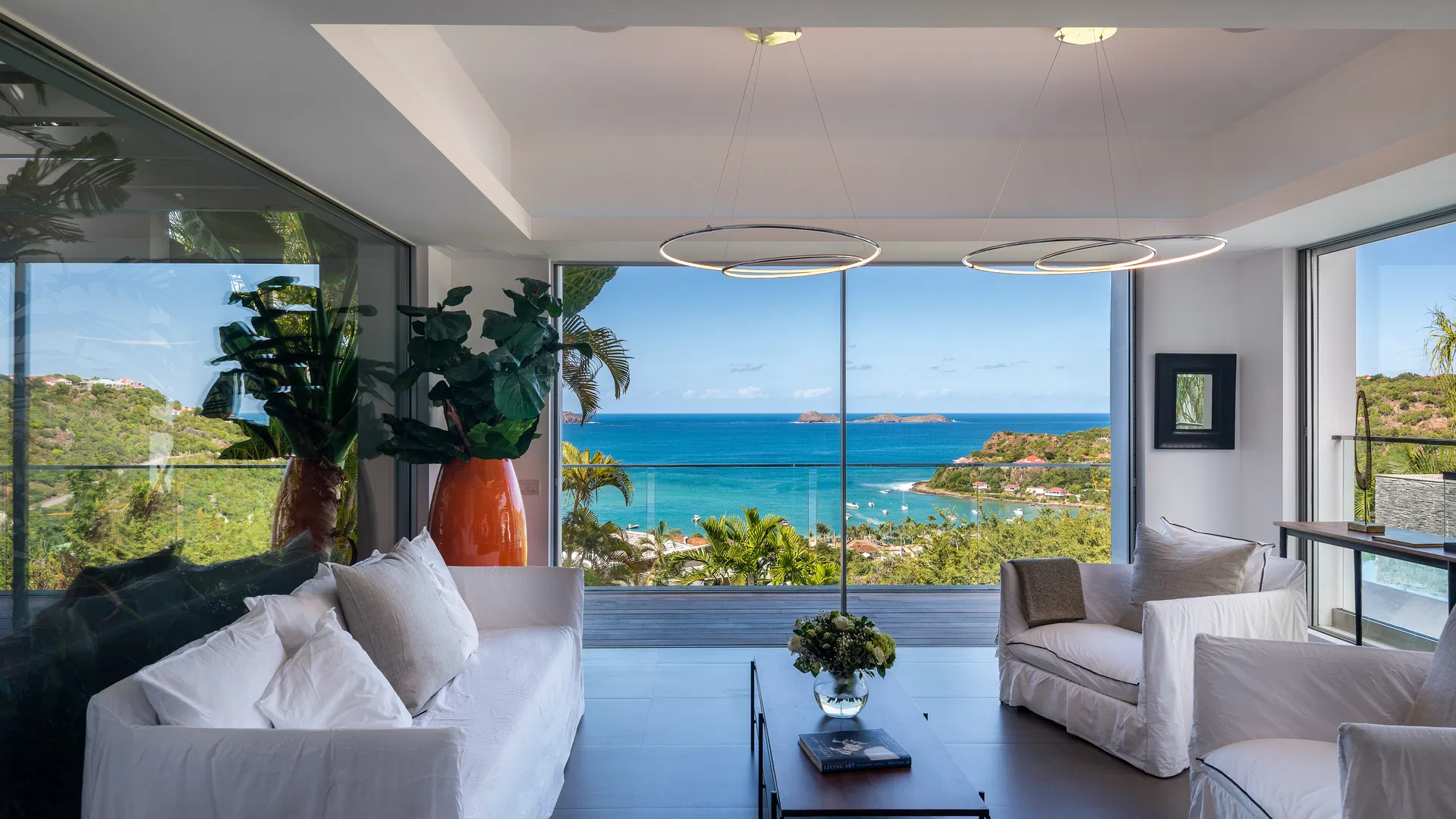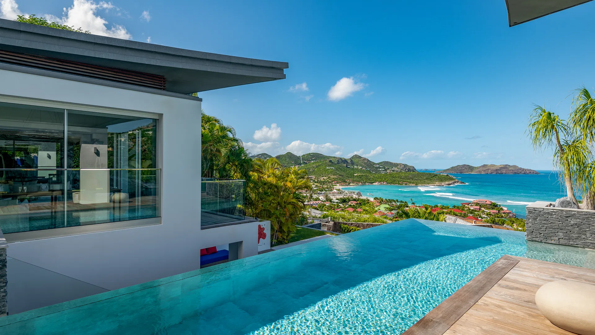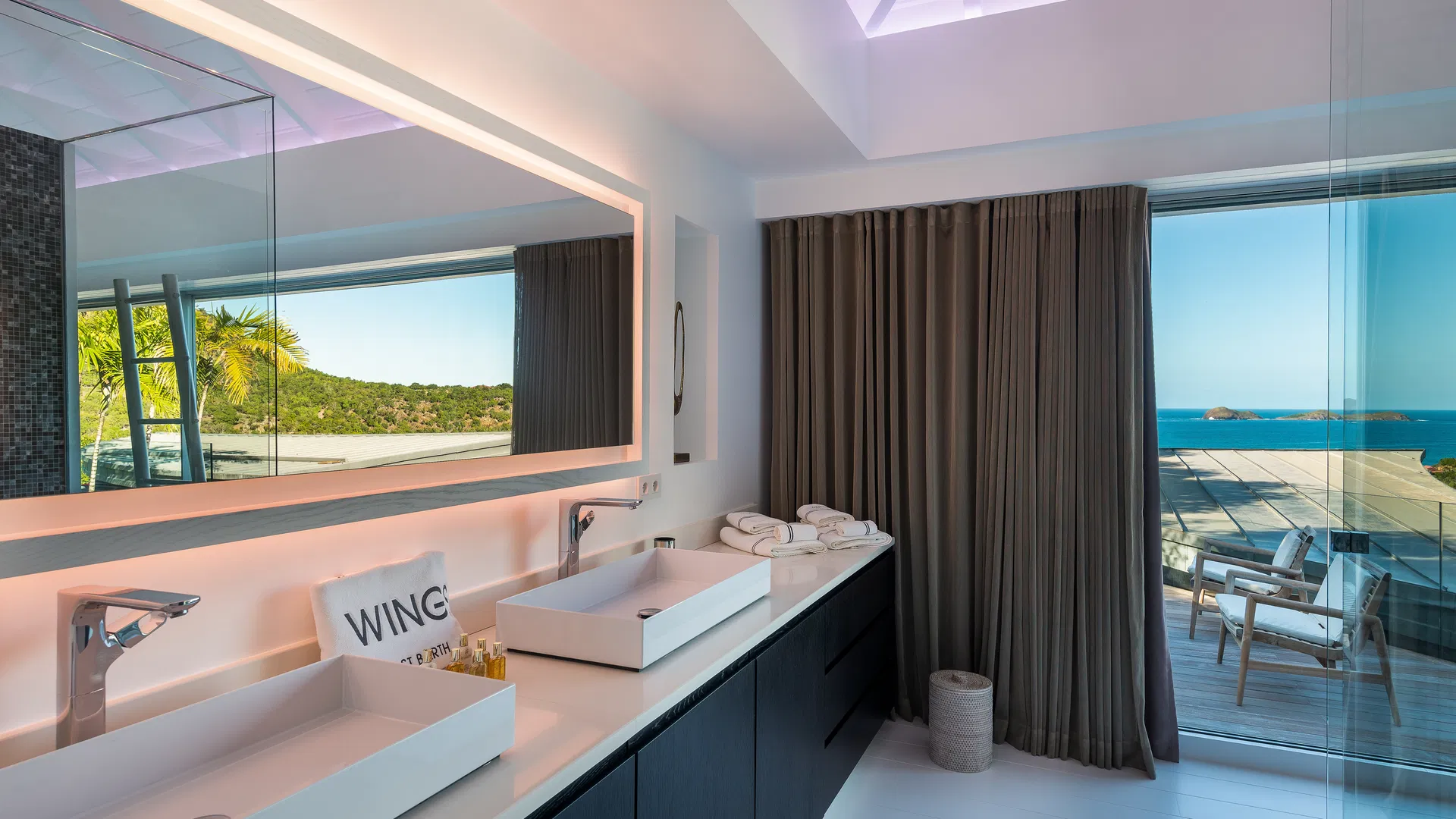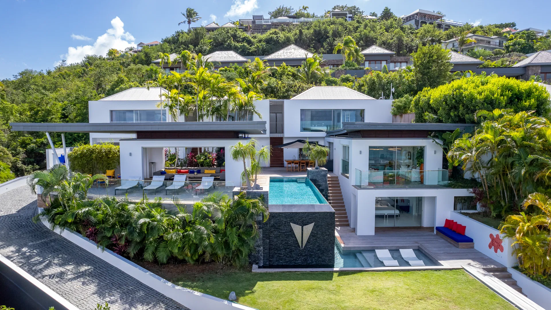 Perched high above Saint-Jean, it overlooks the vast ocean with a view that appears to expand throughout the day—bright turquoise in the morning, deep sapphire in the afternoon, and a gentle, glowing horizon as night falls. The villa has a distinctive silhouette and is built over three levels with wing-shaped roofs. Inside, each room is oriented to maximize the view. Villa Wings, one of the most eye-catching St Barts villas, is both a statement of design and a genuinely comfortable home.