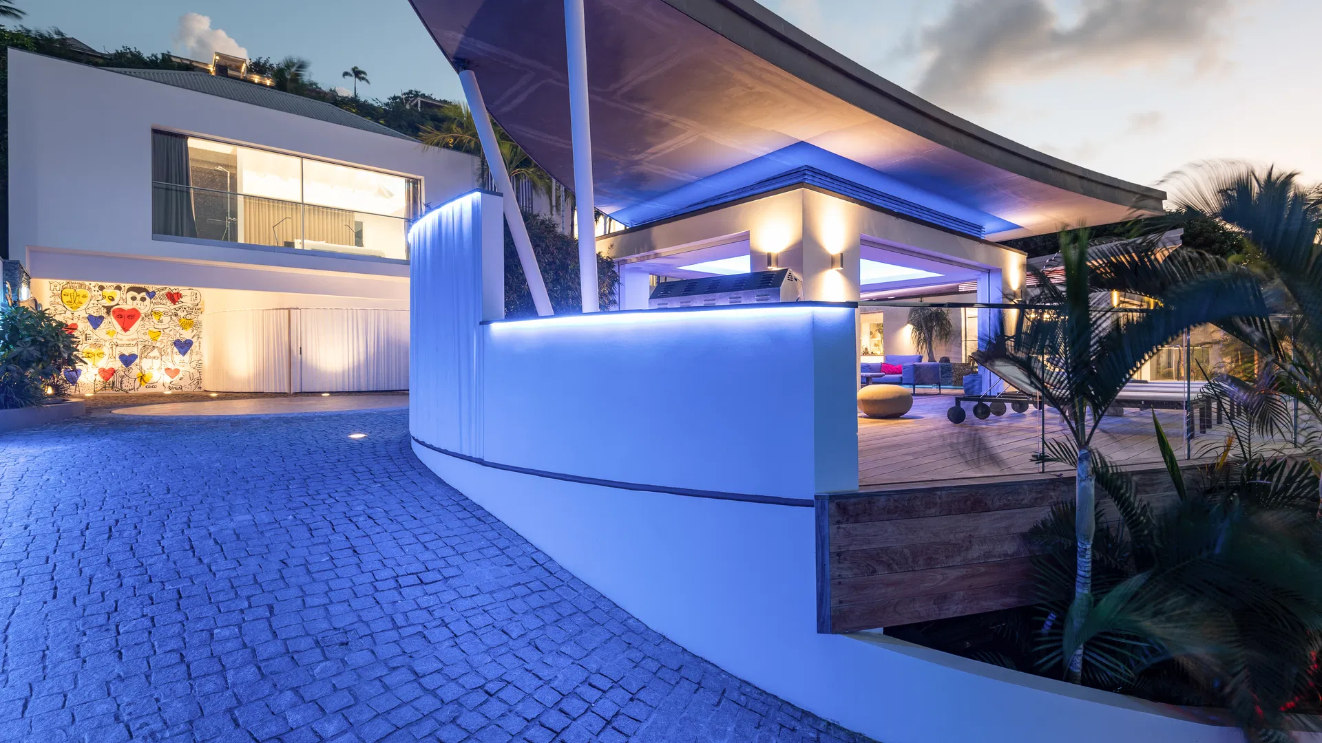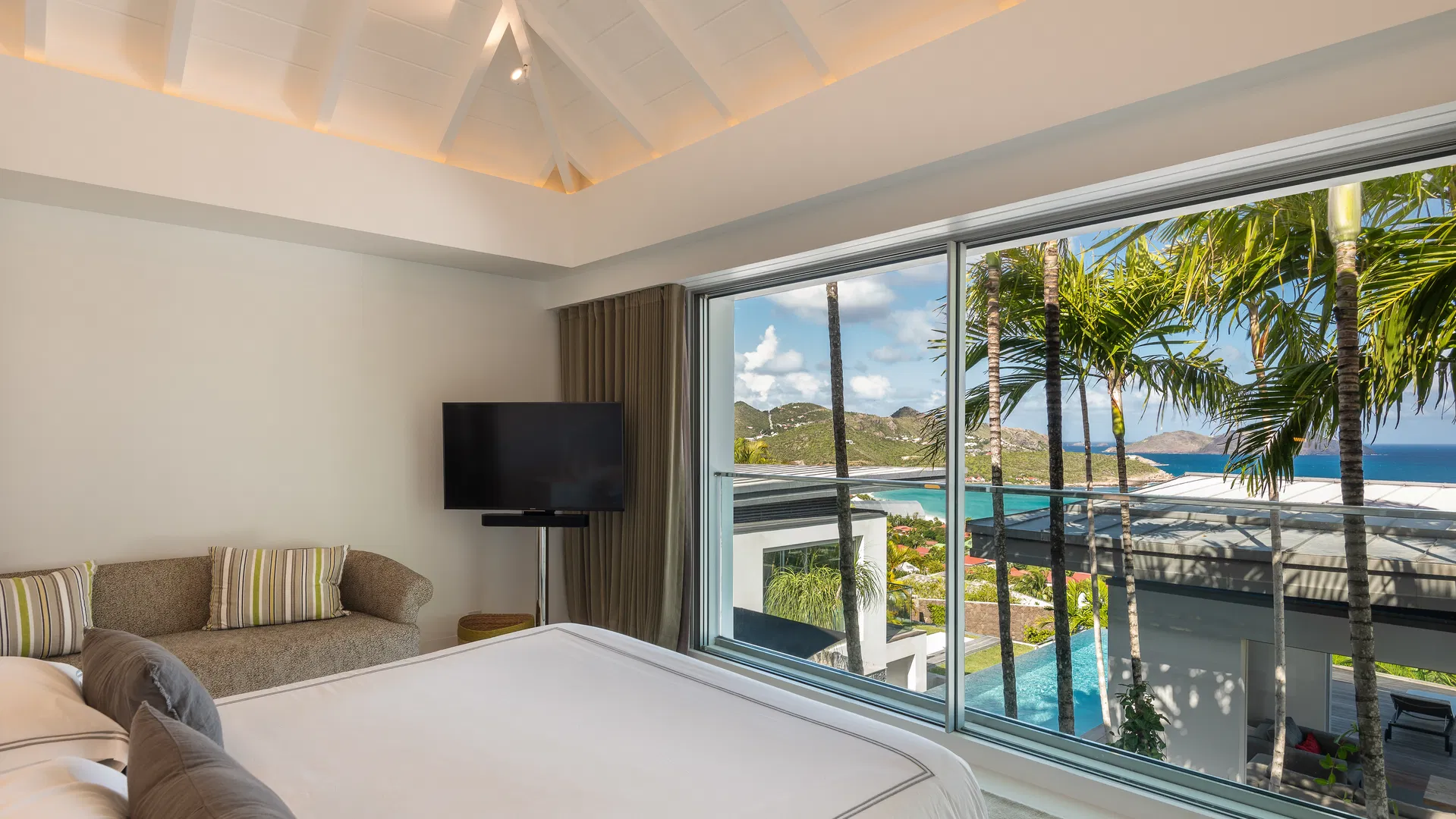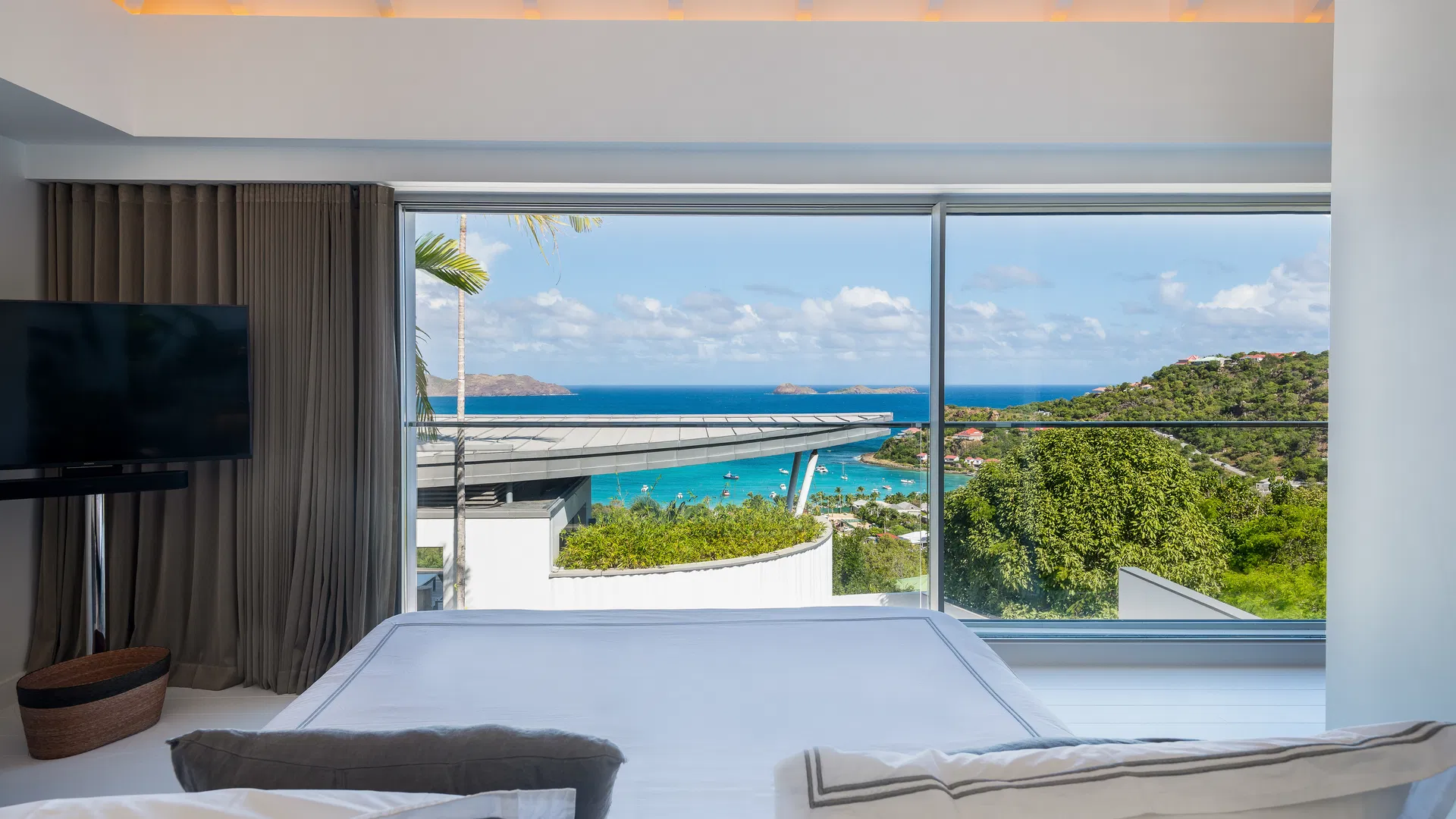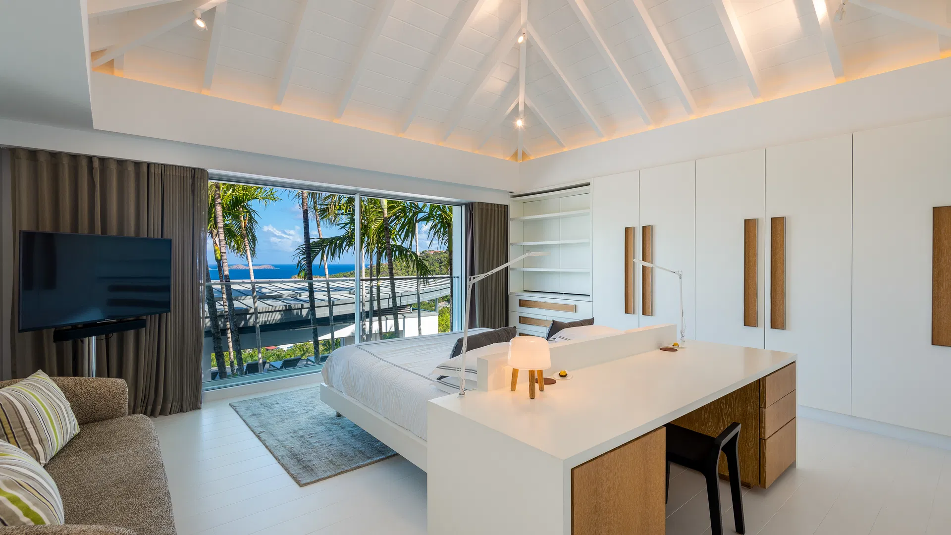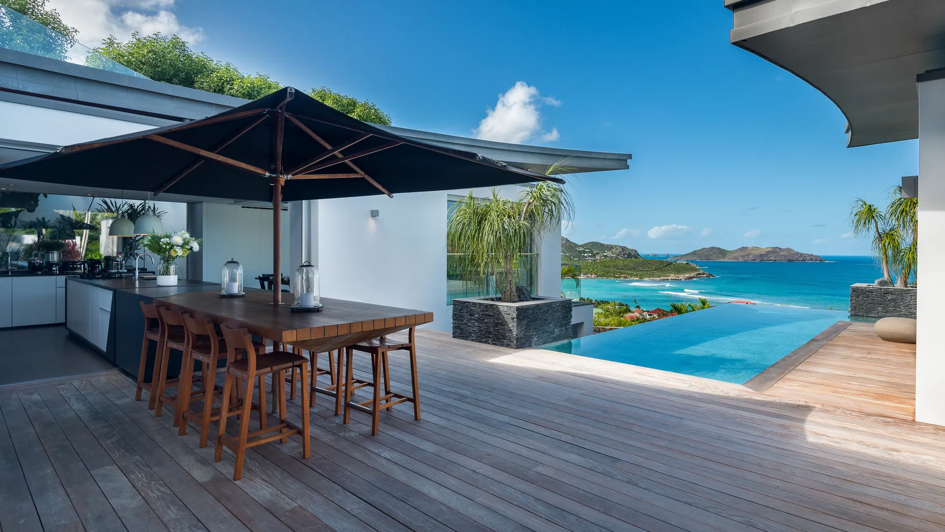 Perched high above Saint-Jean, it overlooks the vast ocean with a view that appears to expand throughout the day—bright turquoise in the morning, deep sapphire in the afternoon, and a gentle, glowing horizon as night falls. The villa has a distinctive silhouette and is built over three levels with wing-shaped roofs. Inside, each room is oriented to maximize the view. Villa Wings, one of the most eye-catching St Barts villas, is both a statement of design and a genuinely comfortable home.